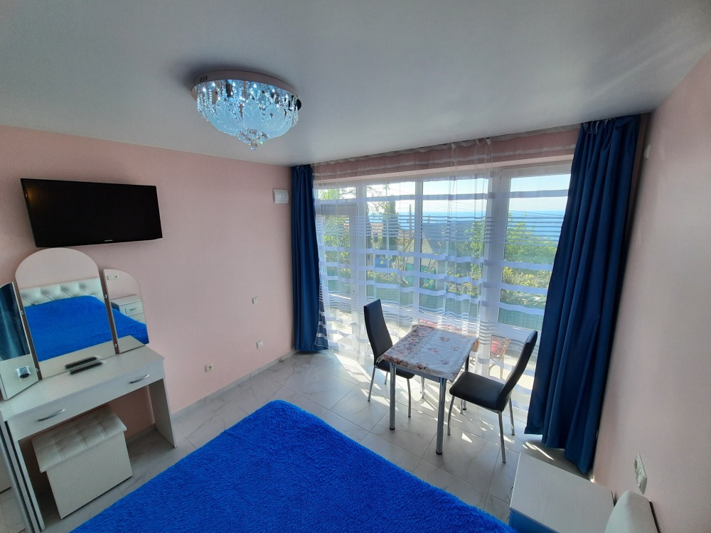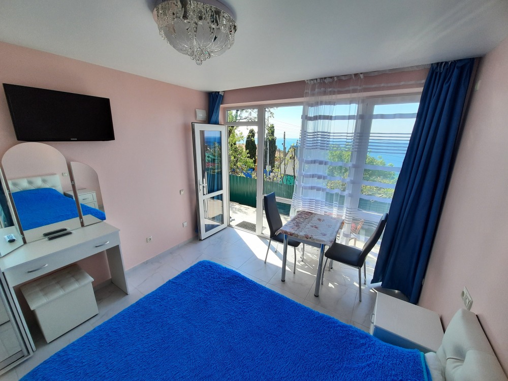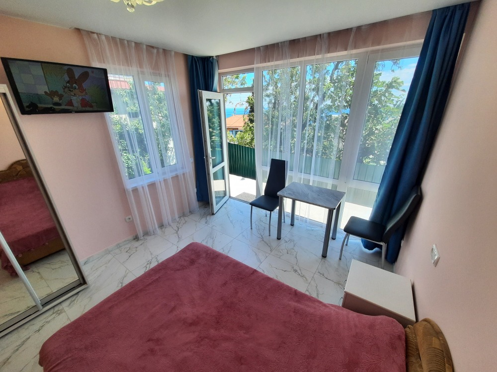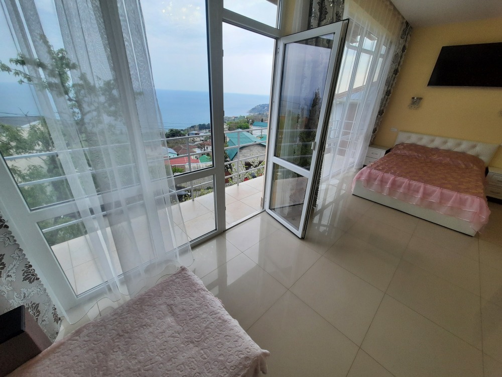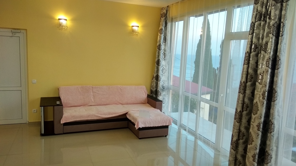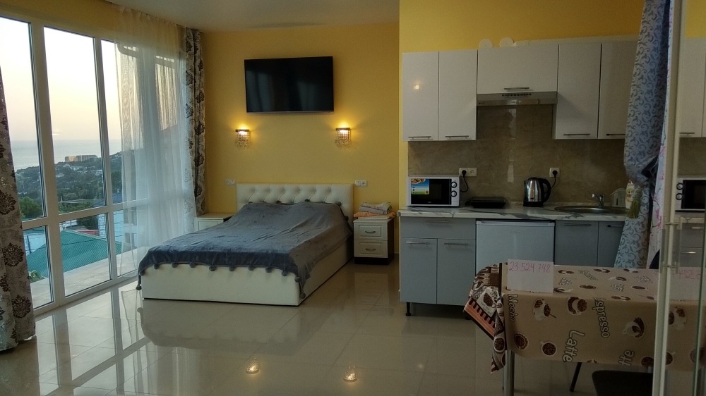 Номер студия с панорамными окнами, с красивым видом на море, до 2-х. чел. Расположение над центром Алупки, в 10 мин. ходьбы от Воронцовского парка и дворца до моря 20 минут. Из окон вид на море, город Алупку.
