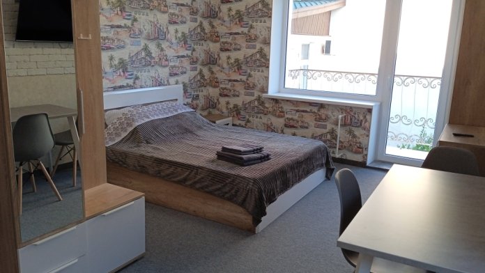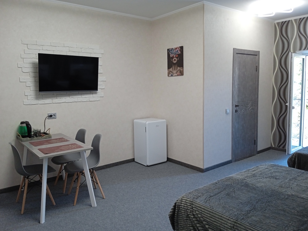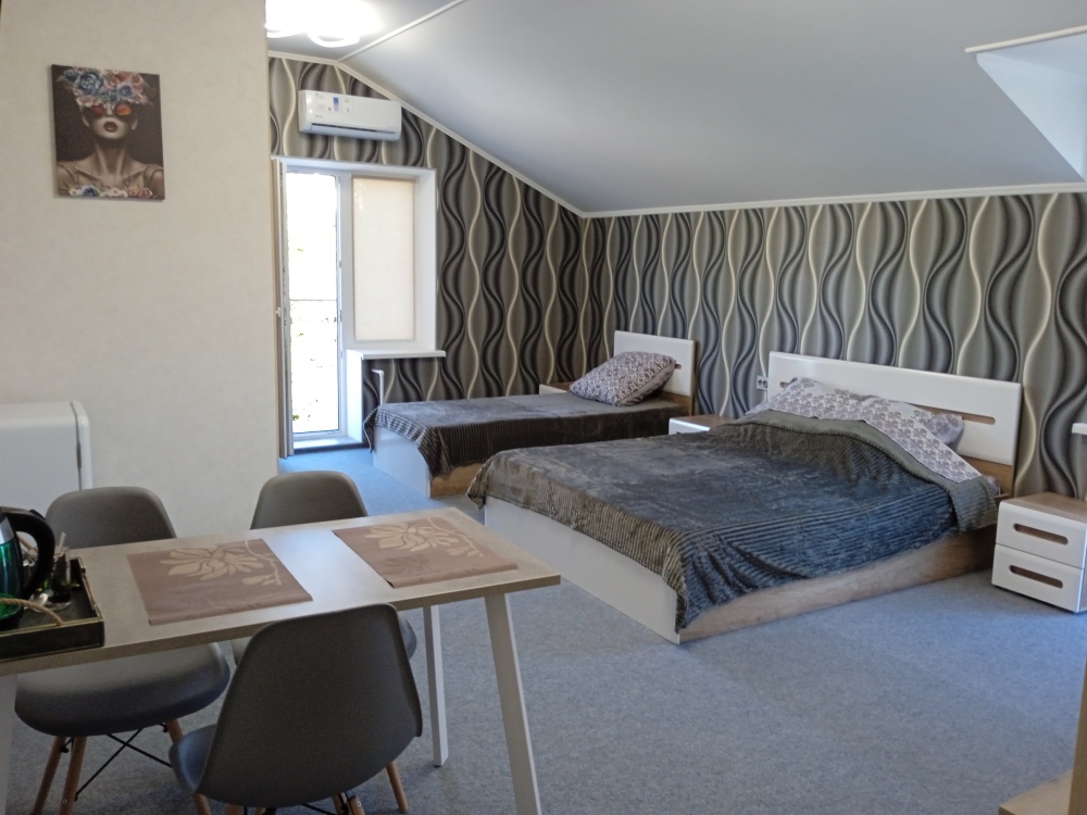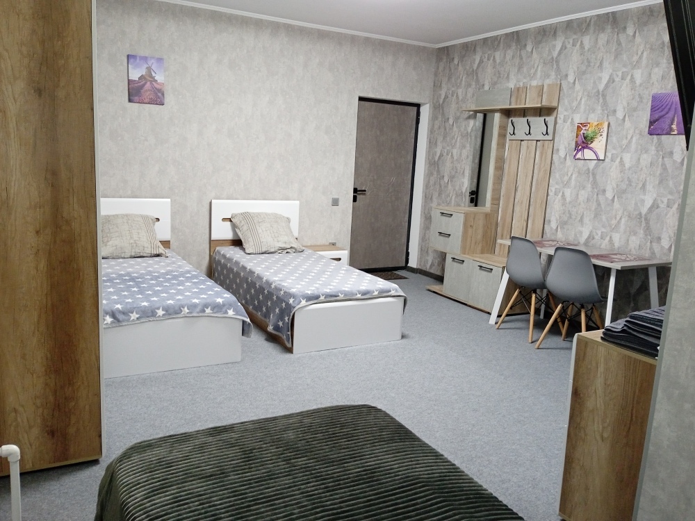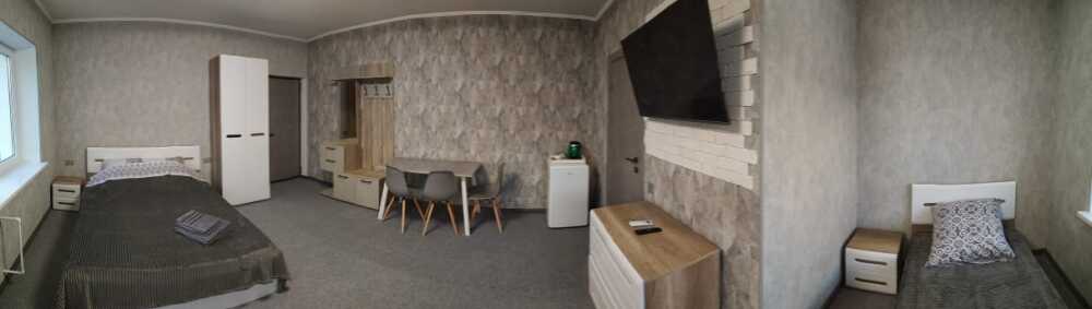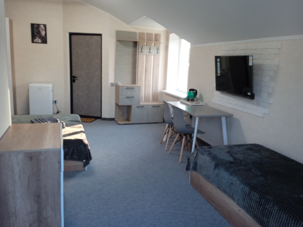 Номер не типовой, расположен на 2 этаже. Трёхместный номер стандарт с обеденным уголком, холодильником, санузлом. Уборка через 4 дня, смена постельного белья раз в неделю.