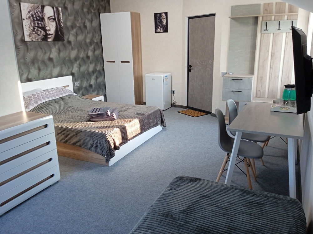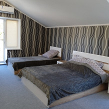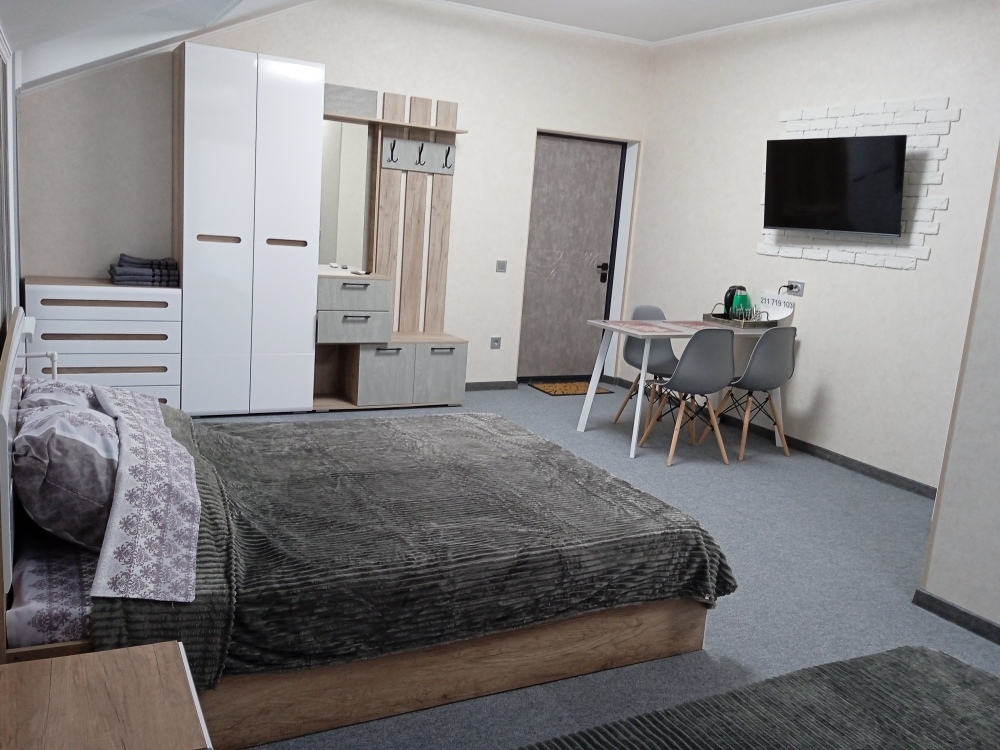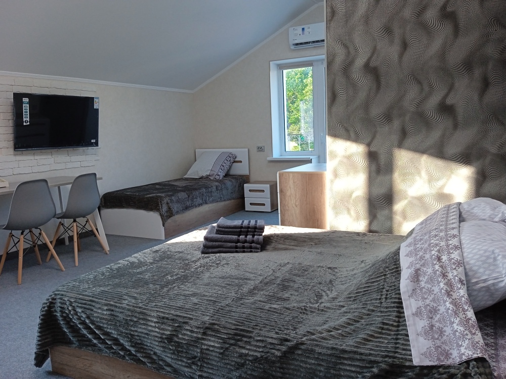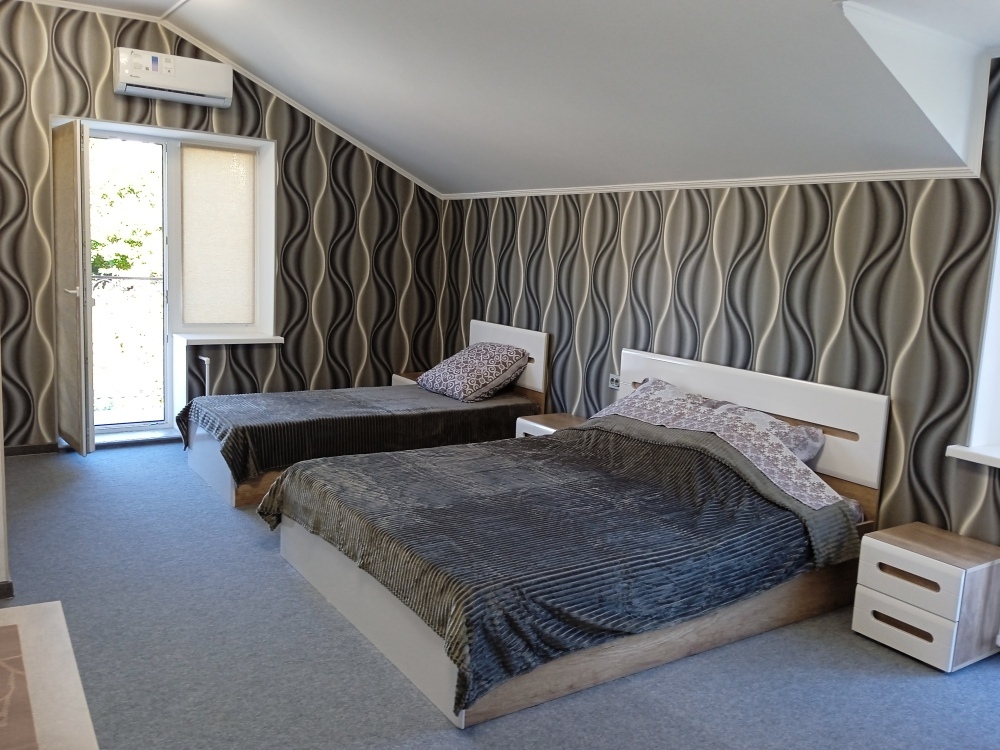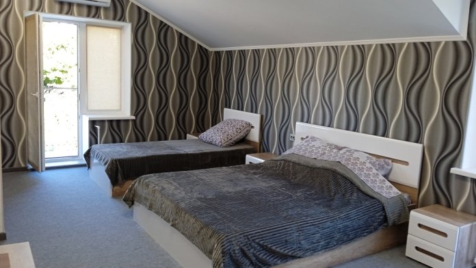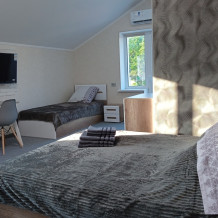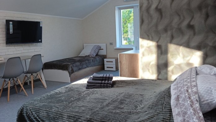Номер не типовой, расположен на 2 этаже. Трёхместный номер стандарт с обеденным уголком, холодильником, санузлом. Уборка через 4 дня, смена постельного белья раз в неделю.