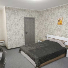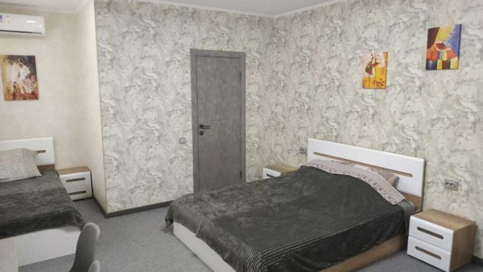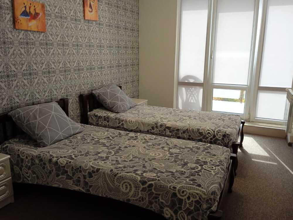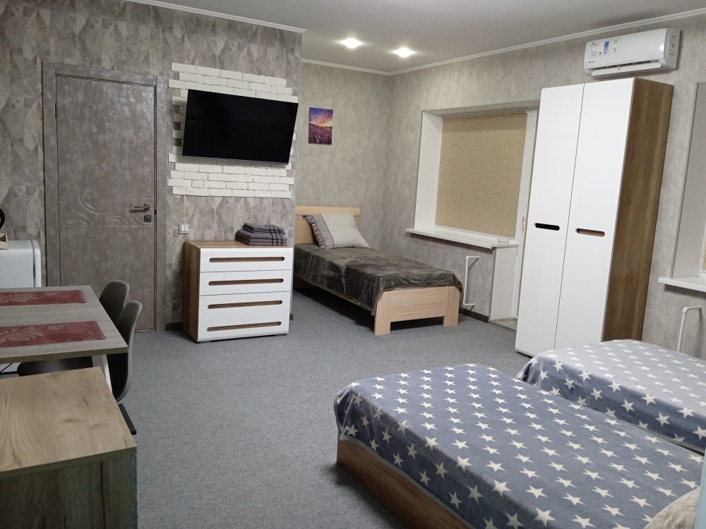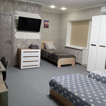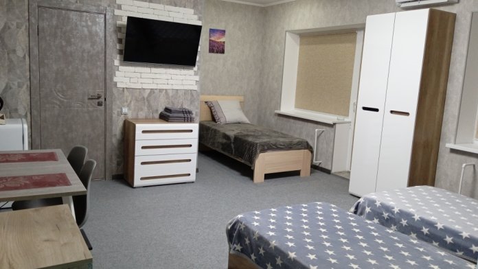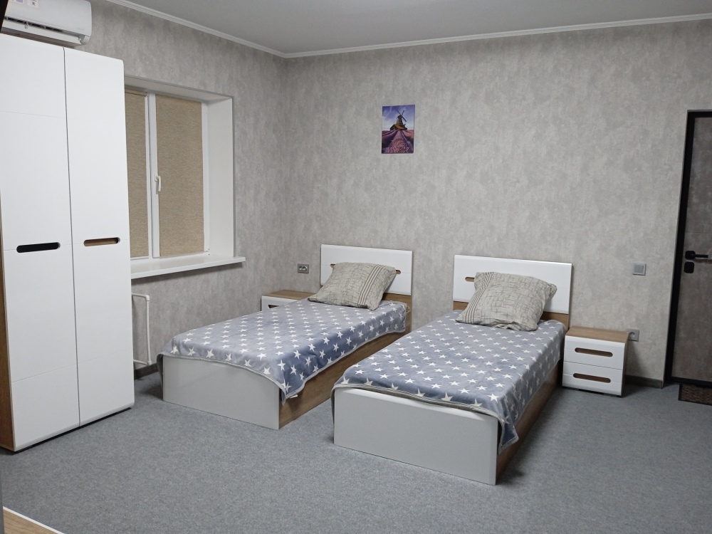 Не типовой, расположен на 3 этаже. Трёхместный номер стандарт с двумя балконами, обеденным столом, холодильником и санузлом. Кухня общая. Уборка номера через четыре дня, смена постельного белья раз в неделю.