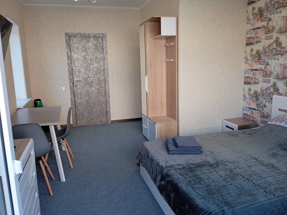 Не типовой, расположен на 3 этаже. Трёхместный номер стандарт с балконом, обеденным уголком, холодильником, санузлом. Уборка номера через 4 дня, смена постельного белья раз в неделю.