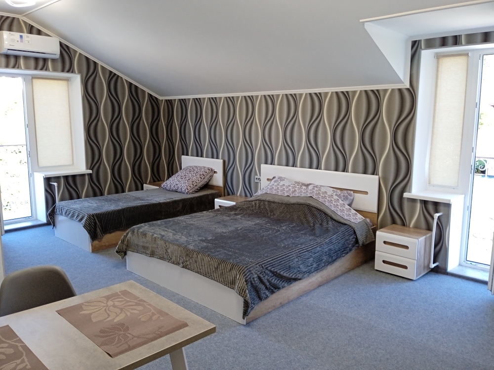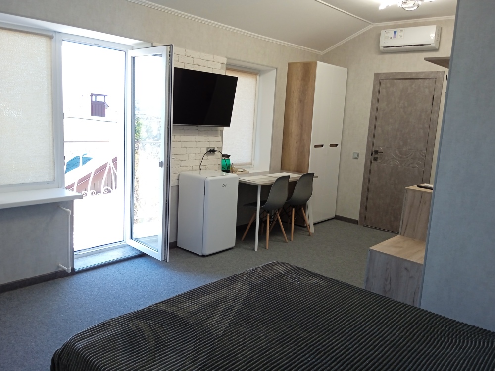 Номер не типовой, расположен на 2 этаже. Трёхместный номер стандарт с балконом, обеденным уголком, холодильником, санузлом. Уборка номера через 4 дня, смена постельного белья раз в неделю.