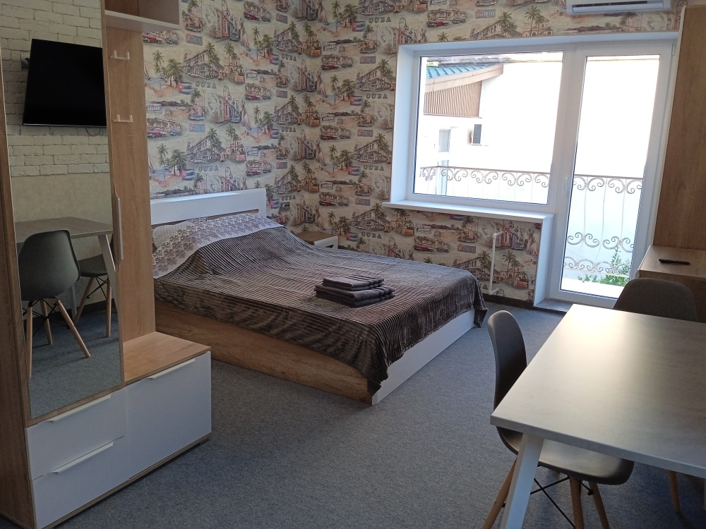 Апартаменты люкс с одной спальней, кухней/гостиной, ванной комнатой и балконом. Уборка номера через 4 дня, смена постельного белья раз в неделю.