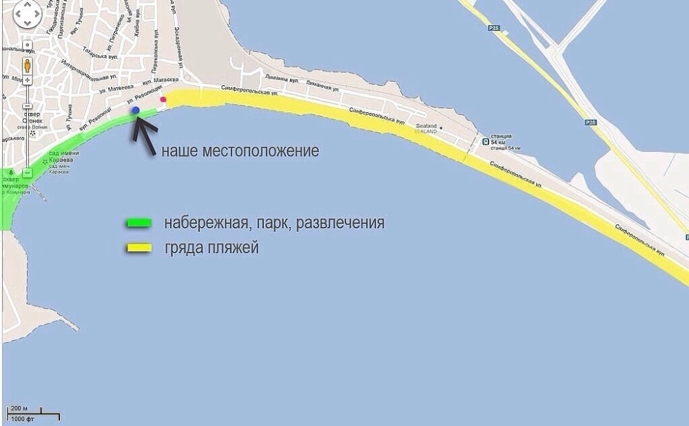 Выход со двора на набережную, сразу к морю (можно загорать, купаться), в одну сторону парк с развлечениями, в другую через метров 200 начинается гряда песчаных пляжей.