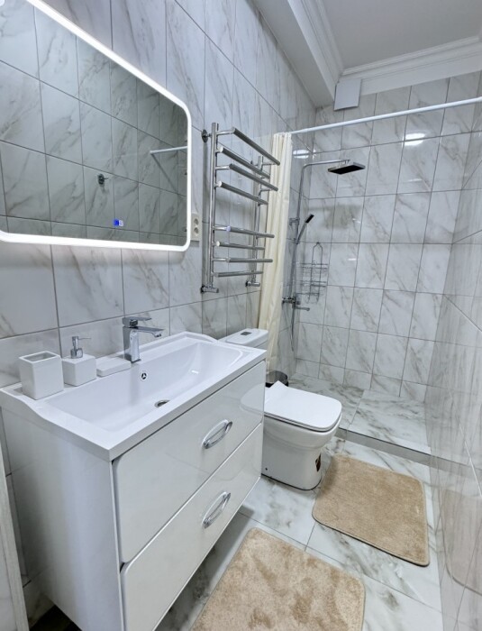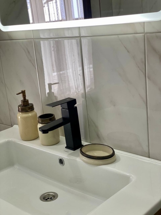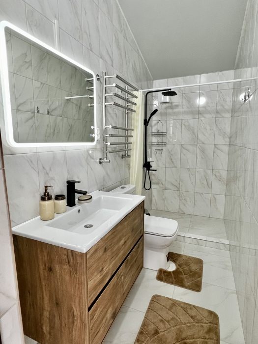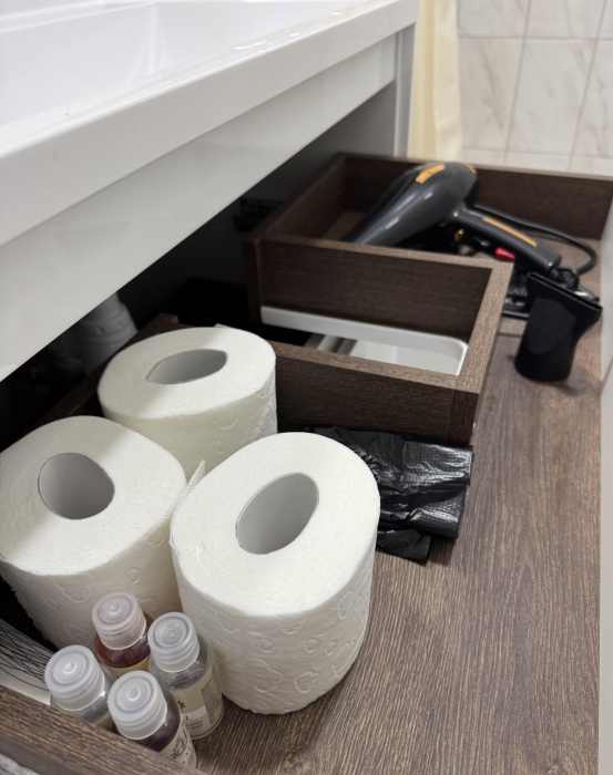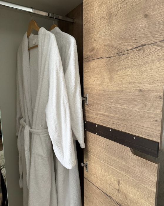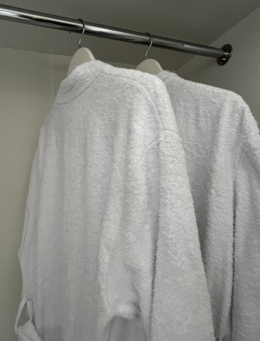 - ванная комната с полотенцами, тапочками и косметическими принадлежностями.