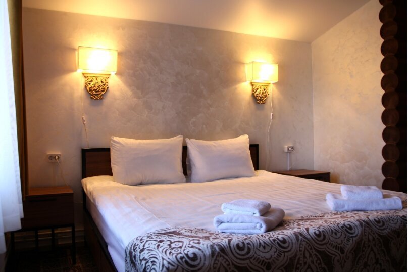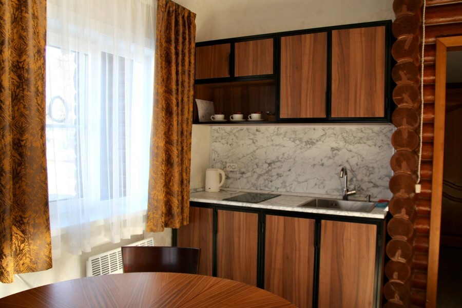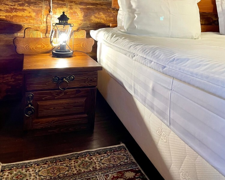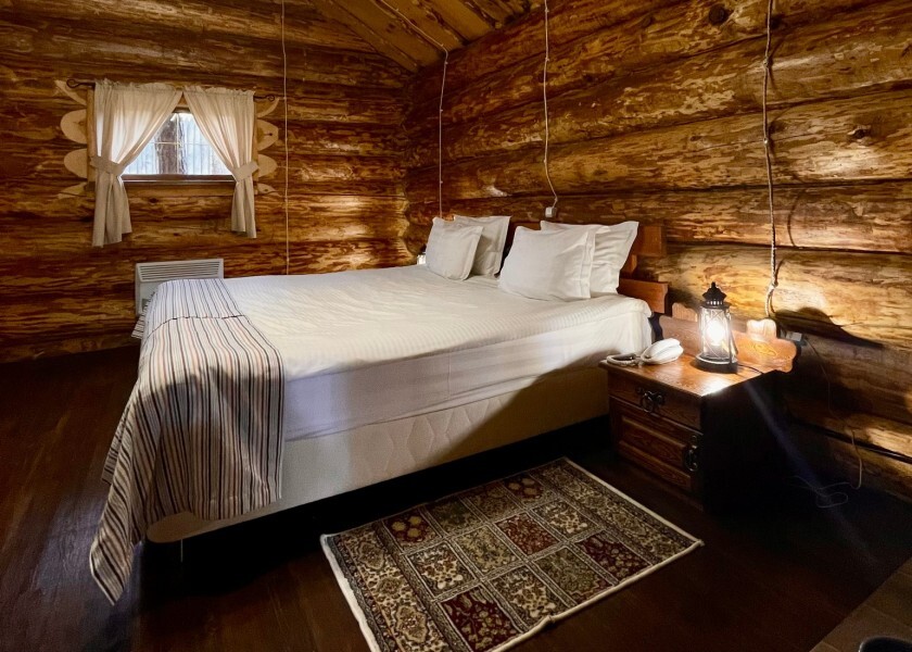 2-местный номер первой категории в отдельно стоящем доме из рубленного бревна в месте, отдаленном от основной территории, выполненный в стиле охотничьего зимовья. Неповторимый колорит изящной французской печи-буржуйки и поленница с дровами. Комплектация номера: двуспальная кровать или две односпальные кровати, прикроватные тумбочки со светильниками, кофейный стол, два стула, французская печь-буржуйка, санузел с душевой кабиной, косметическое зеркало, тапочки и халаты.