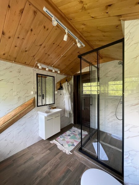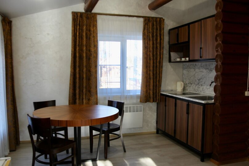 Отдельно стоящий коттедж с двумя спальнями из оцилиндрованного бревна с террасой. Идеальный вариант для семейного отдыха. Комплектация номера: двуспальная кровать, прикроватные тумбочки со светильниками, два стула, шкаф-гардеробная, односпальная кровать, прикроватная полка со светильником, шкаф-гардеробная, кухонный гарнитур, плита, обеденный группа, комплект кухонной и столовой посуды, электрический чайник, микроволновая печь, диван, журнальный стол со светильником, косметическое зеркало, тапочки и халаты.