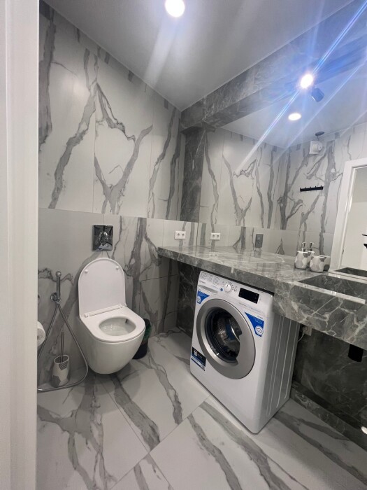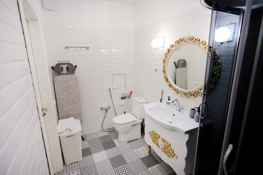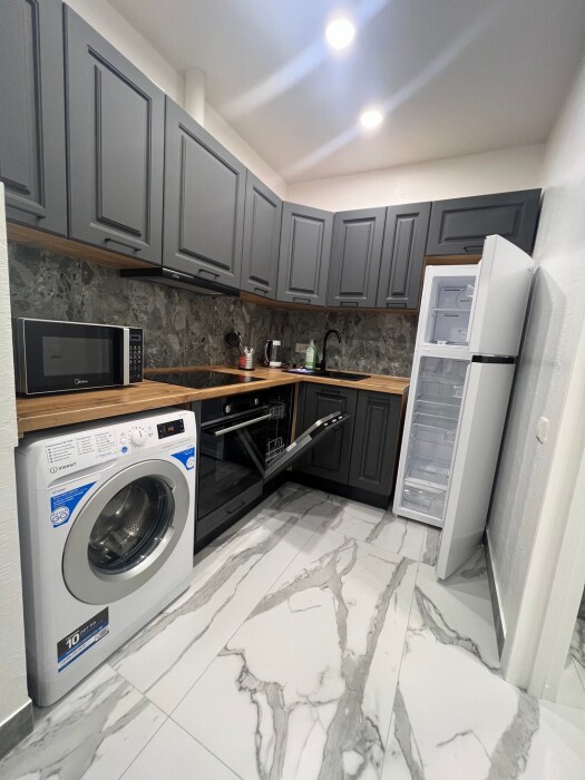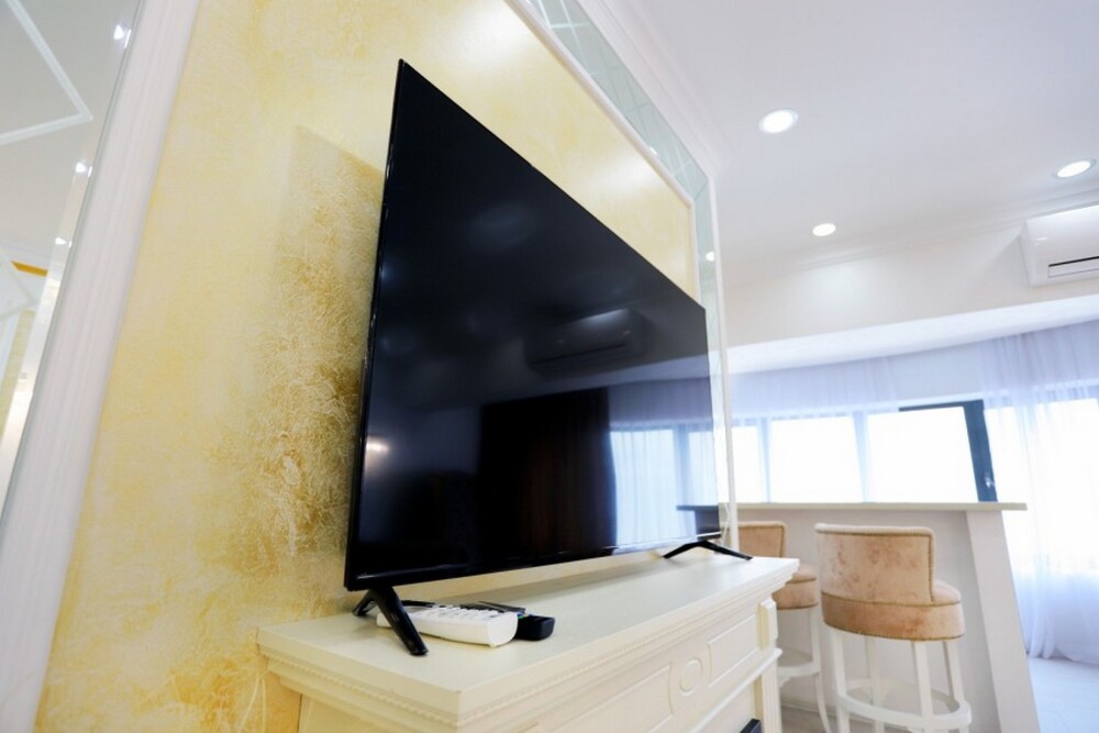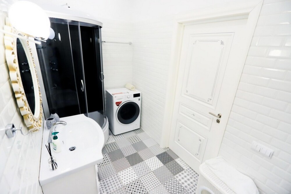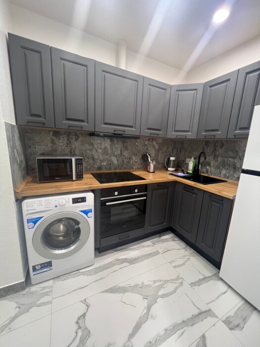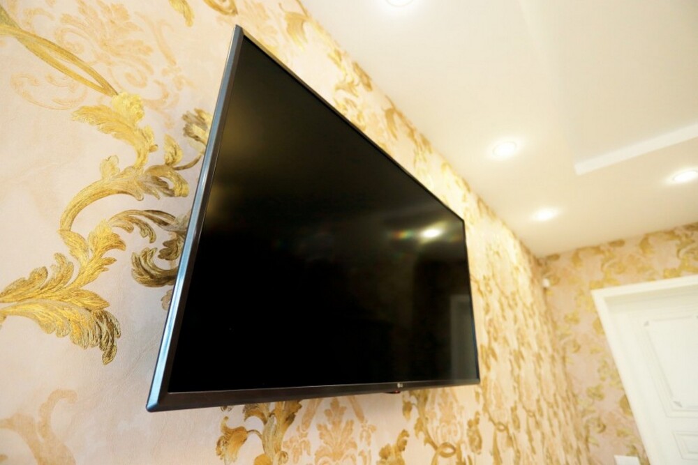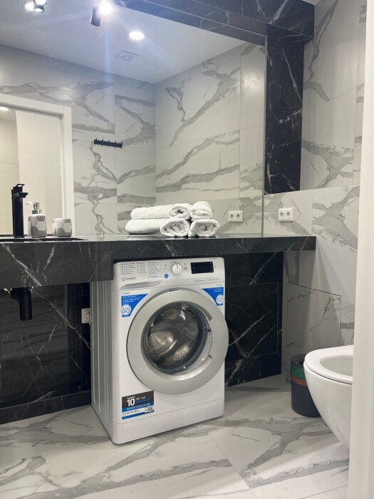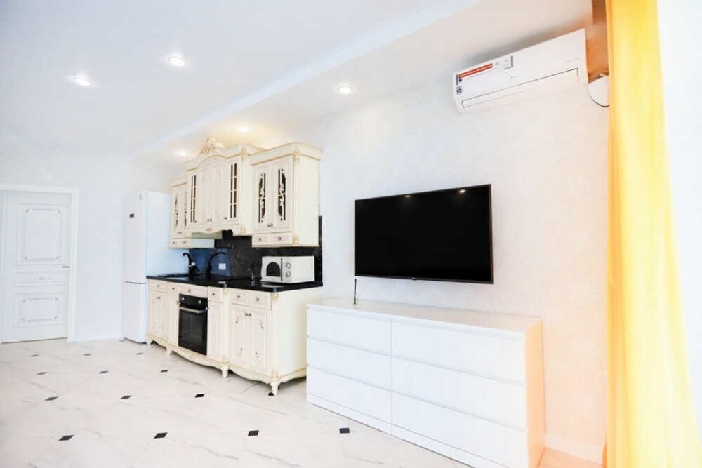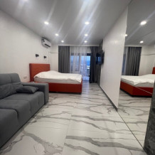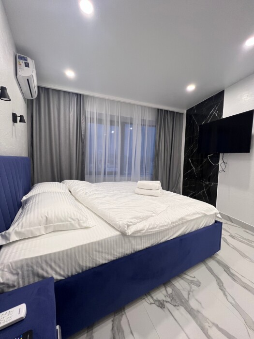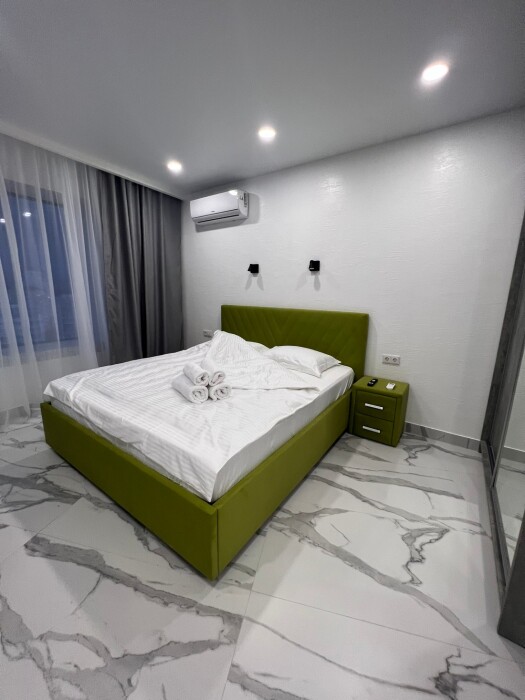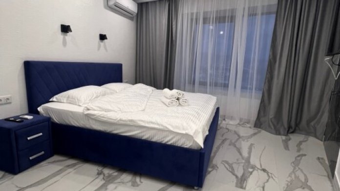 Апартаменты укомплектованы всем необходимым — в каждом номере установлен кондиционер, электроплита, телевизор, стиральная машина, двуспальная кровать и двуспальный диван.