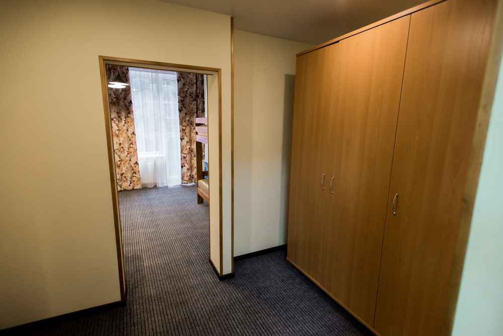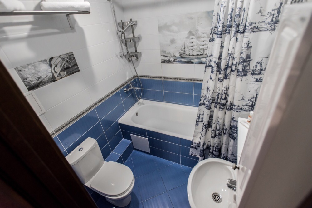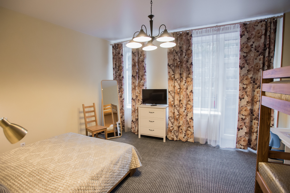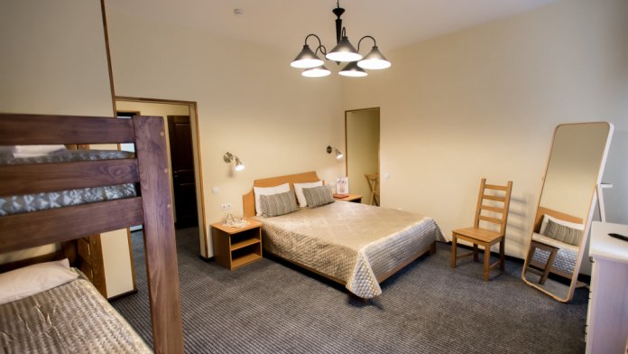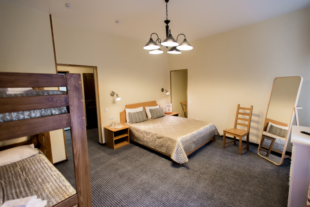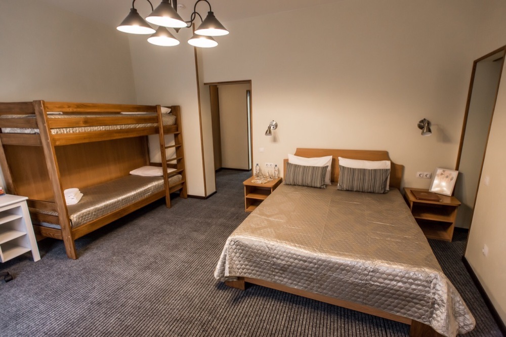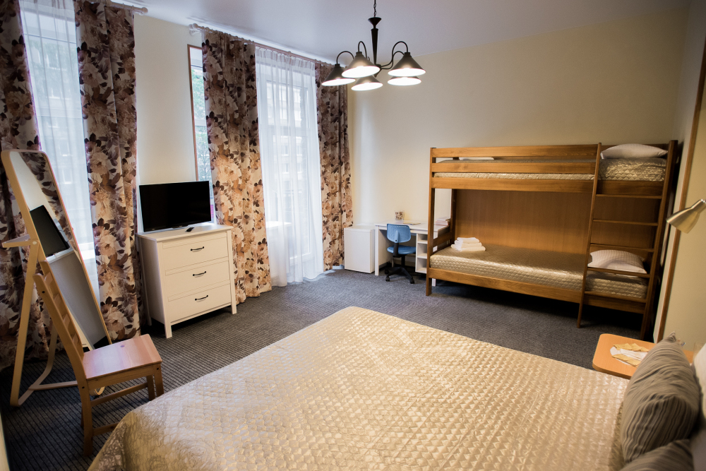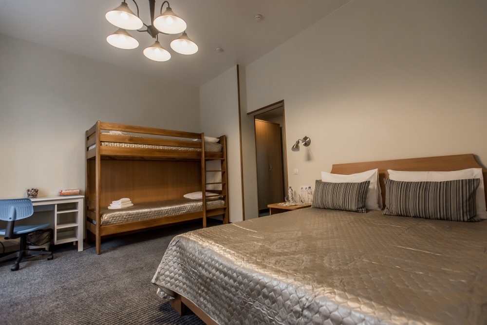 Номер на 4 человек. В номере 1 просторная двуспальная кровать и 1 двухъярусная кровать. Ортопедические матрасы «Аскона», новые одеяла и подушки, белоснежное сатиновое бельё, белые махровые полотенца. Телевизор, балкон, шкаф, холодильник, комод, детский стульчик, рабочее место . Собственная ванна и туалет в номере. Тапочки и набор принадлежностей для душа для каждого гостя. Чай, сахар , чашечки. Ковролин.