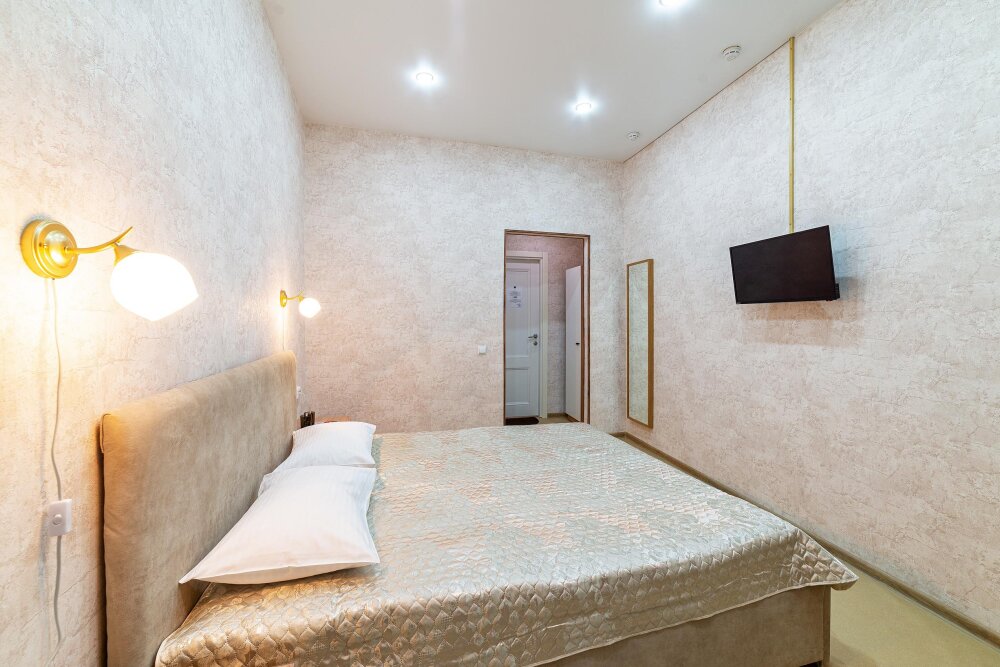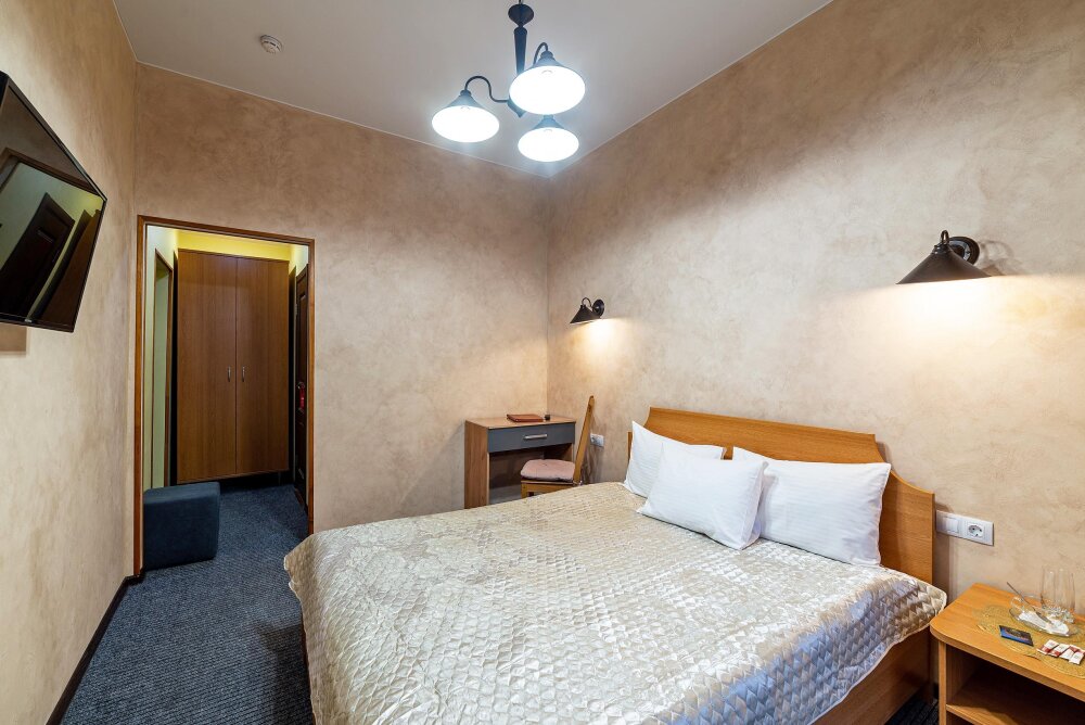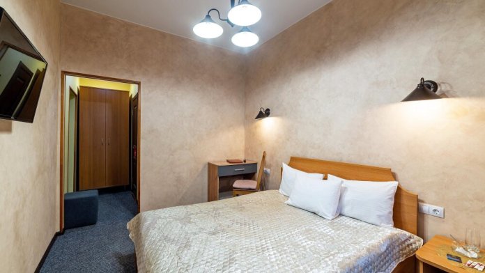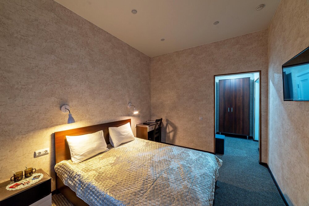 Номер на 2 человек. В номере 1 двуспальная кровать . Ортопедический матрас «Аскона», новые одеяла и подушки, белоснежное сатиновое бельё, белые махровые полотенца. Телевизор, балкон, шкаф. Собственная ванна ( душ) и туалет в номере. Тапочки и набор принадлежностей для душа на каждого гостя. Чай, сахар , чашечки. Все номера с ковролином.
