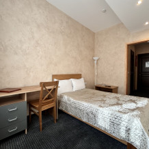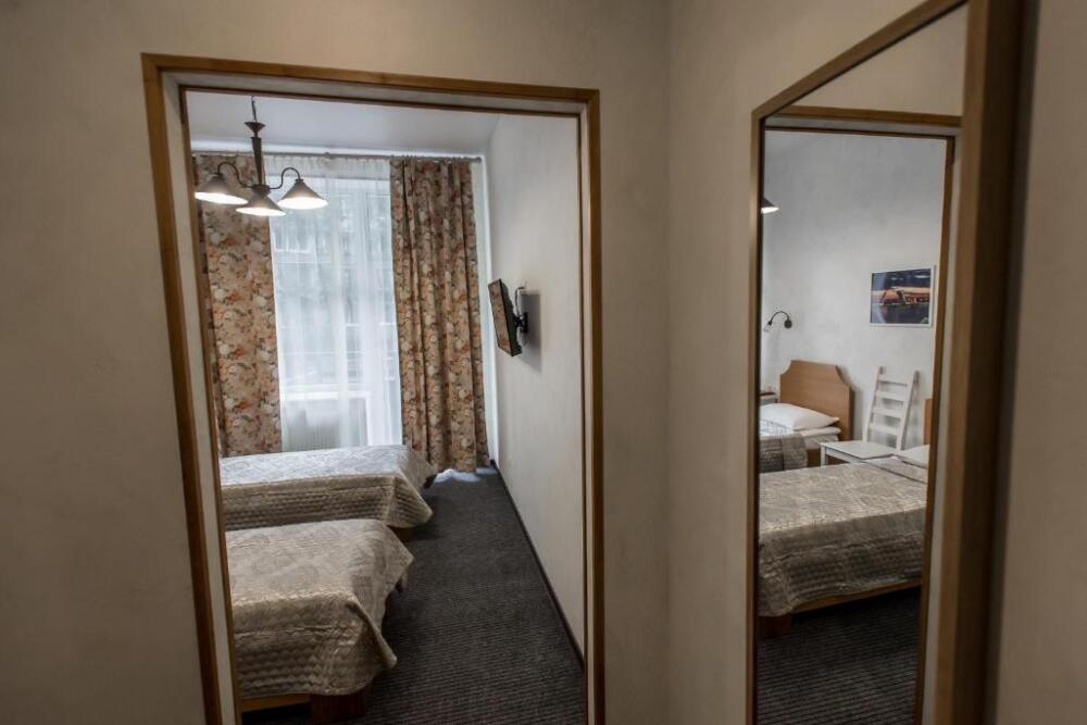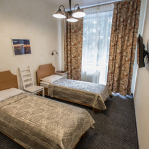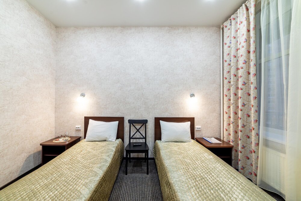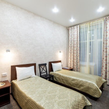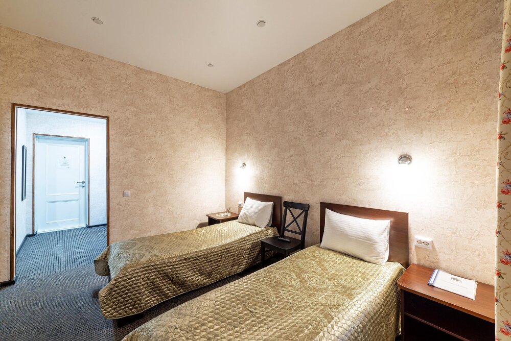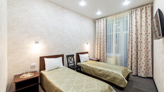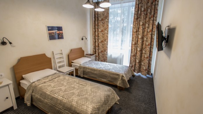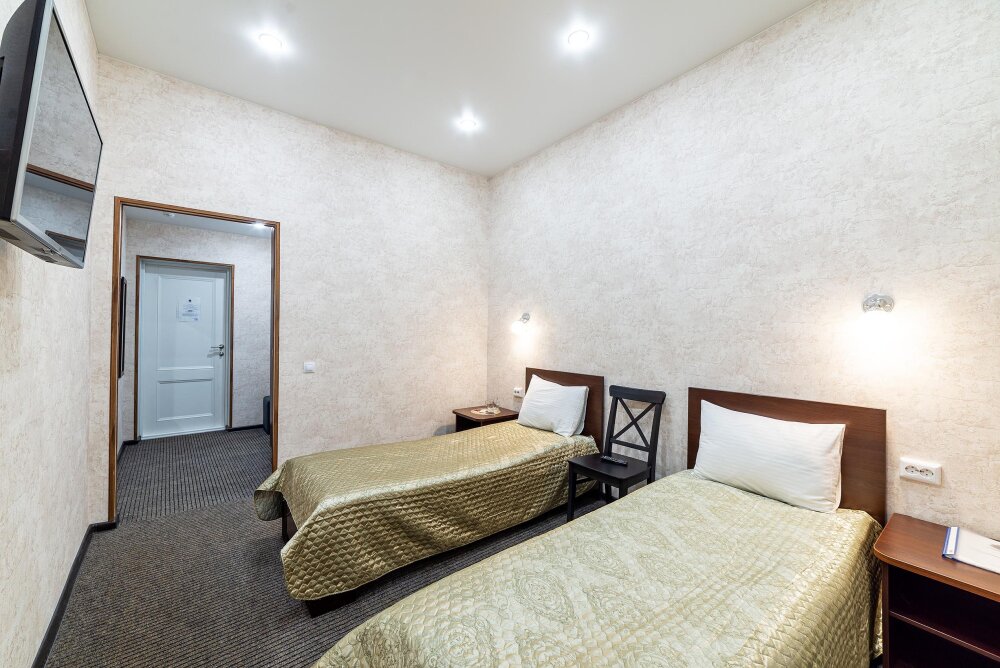 Номер на 2 человек. В номере 2 комфортные односпальные кровати. Ортопедические матрасы «Аскона», белоснежное сатиновое бельё, белые махровые полотенца. Телевизор, балкон, шкаф. Собственный душ и туалет в номере. Тапочки и набор принадлежностей для душа для каждого гостя. Чай, сахар, чашечки. Номер может быть как с ковролином, так и с линолеумом.