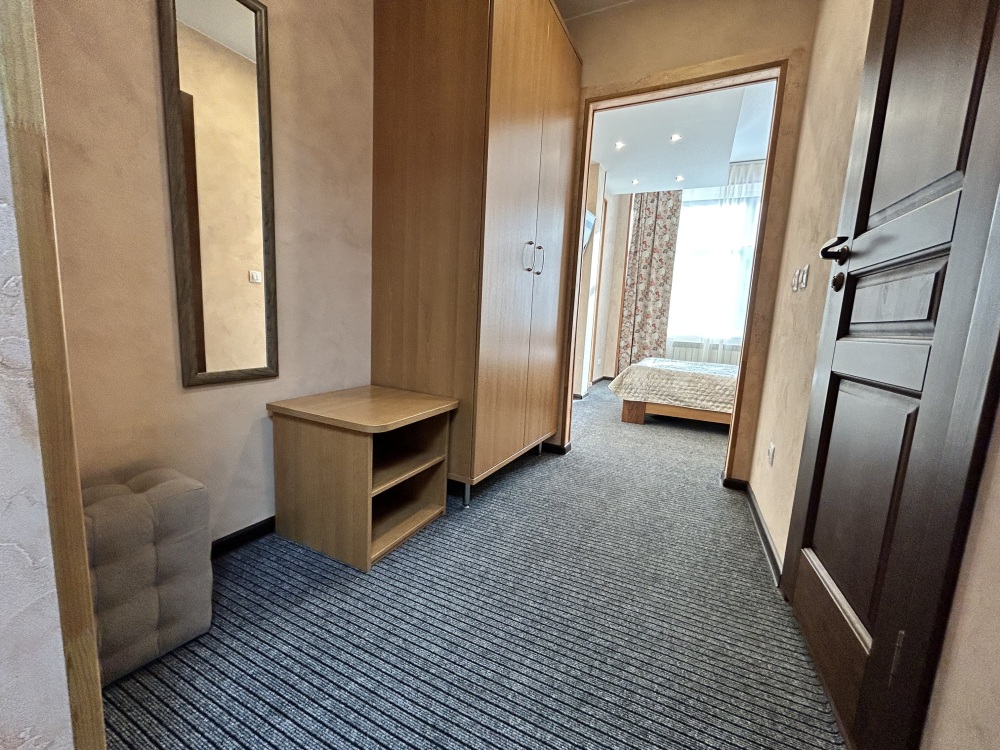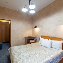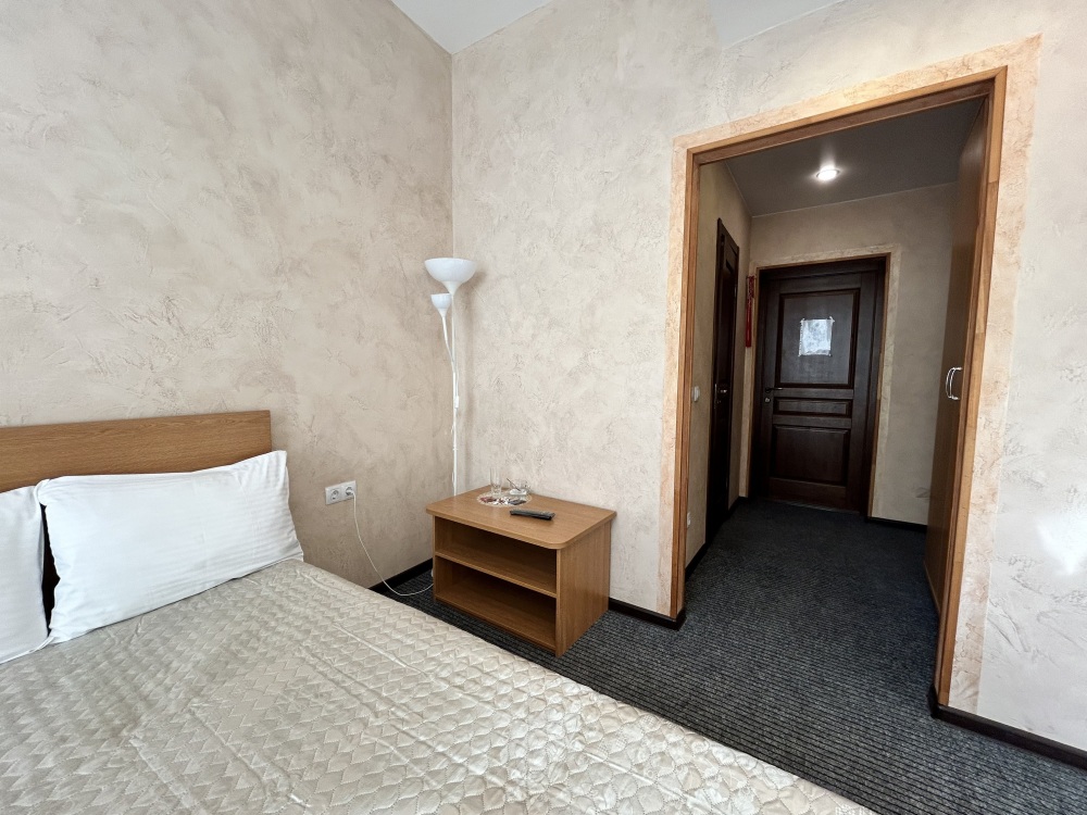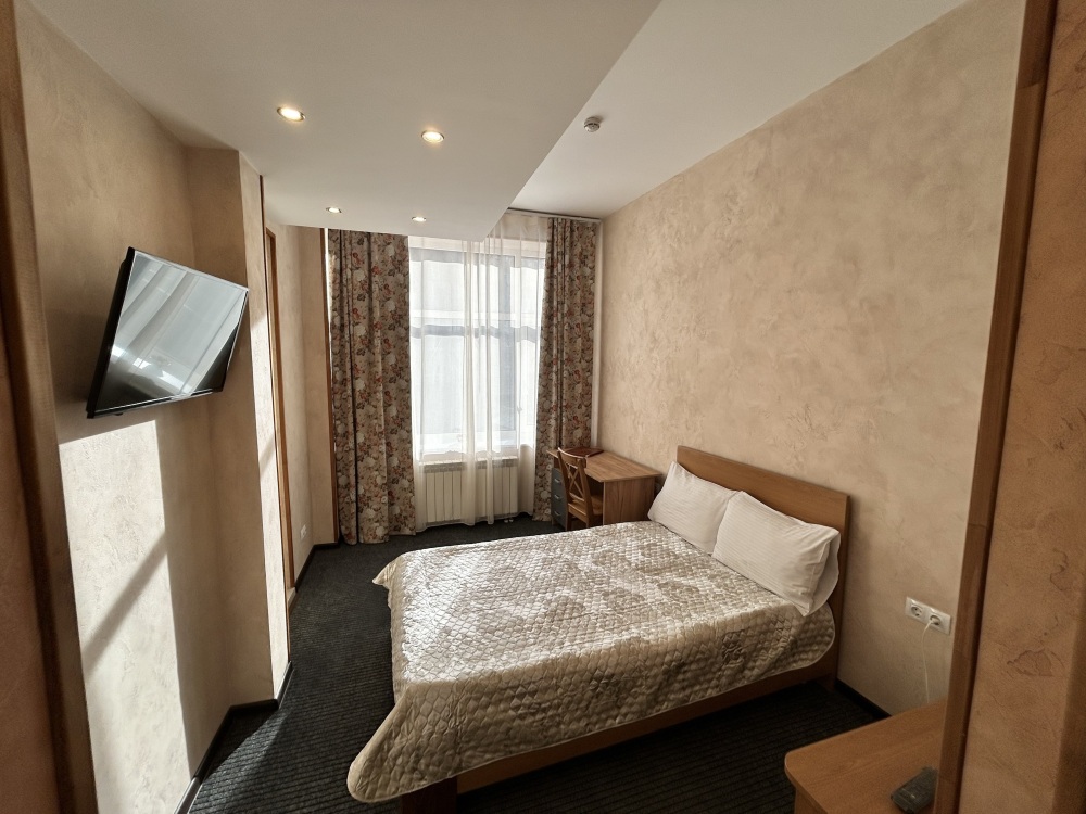 Номер на 1 человека. В номере 1 просторная кровать. Ортопедический матрас «Аскона», новое одеяло и подушки, белоснежное сатиновое бельё, белые махровые полотенца. Телевизор, балкон, шкаф. Собственный душ и туалет в номере. Тапочки и набор принадлежностей для душа. Чай, сахар , чашечки. Ковролин.