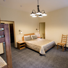 Номер на 2 человек. В номере 1 просторная двуспальная кровать. Ортопедический матрас «Аскона», белоснежное сатиновое бельё, белые махровые полотенца. Телевизор, балкон, шкаф. Собственный душ и туалет в номере. Тапочки и набор принадлежностей для душа для каждого гостя. Чай, сахар , чашечки. Номер может быть как с линолеумом, так и с ковролином.