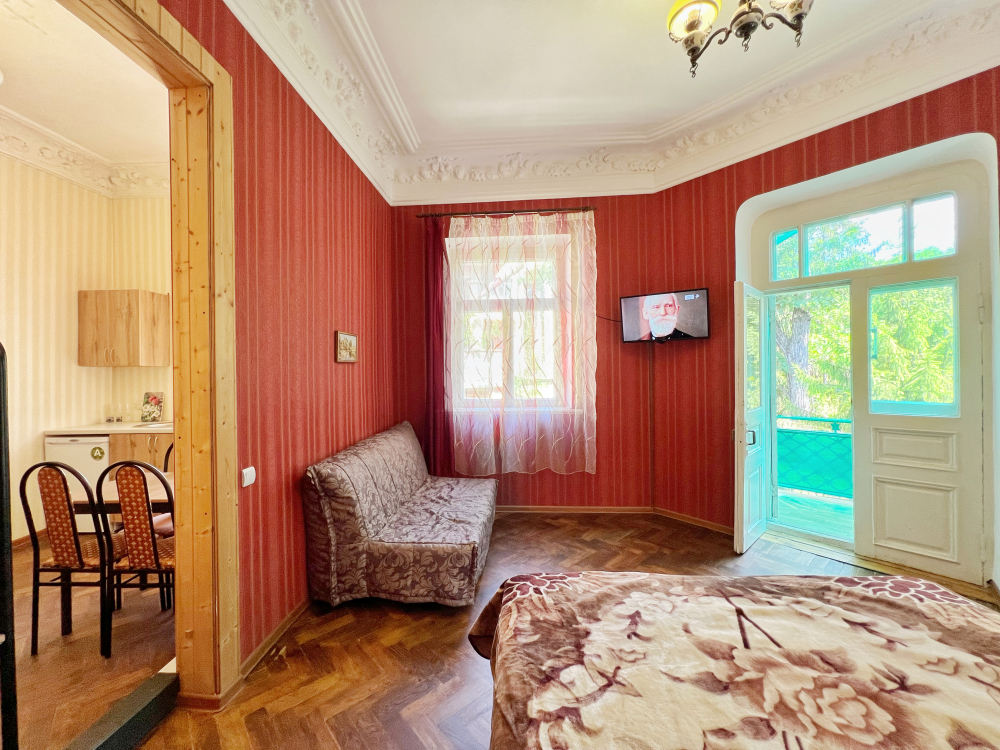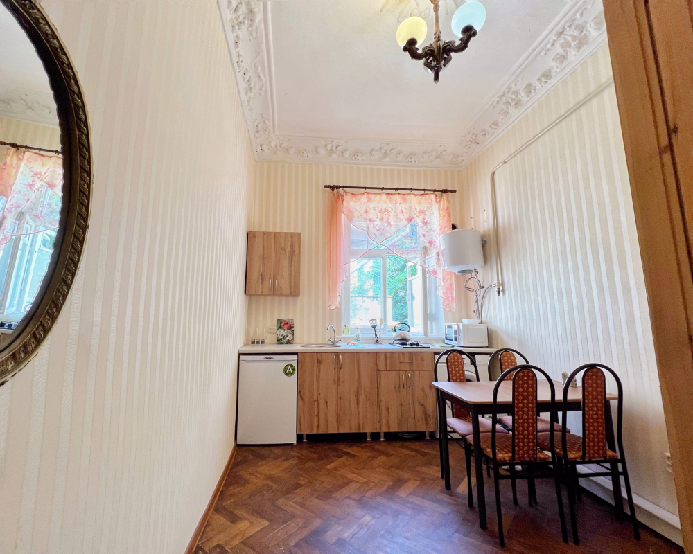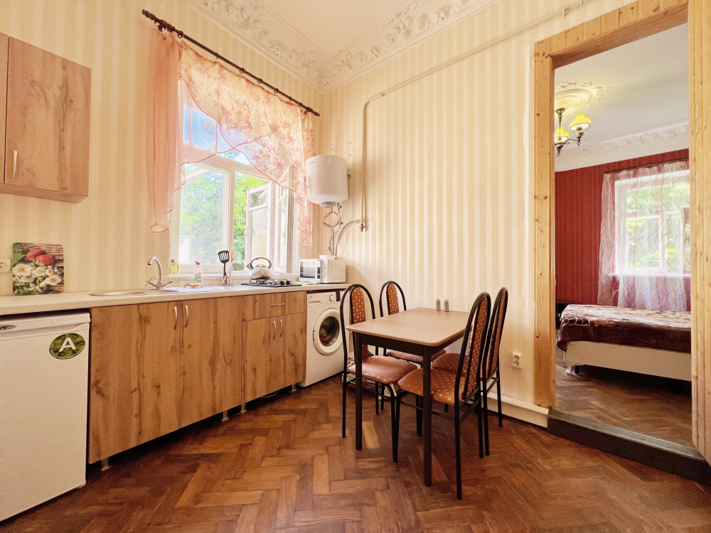 Рядом санаторий «Крепость», «Узбекистан», «Клиника Ленина», «Луч». Просторная, однокомнатная квартира , высота потолков 3,7 метра. микроволновка, ТВ на стене, стиральная машина.