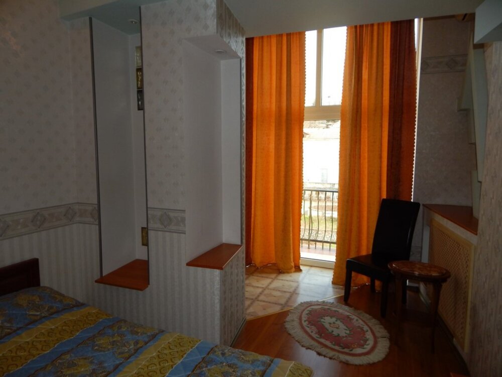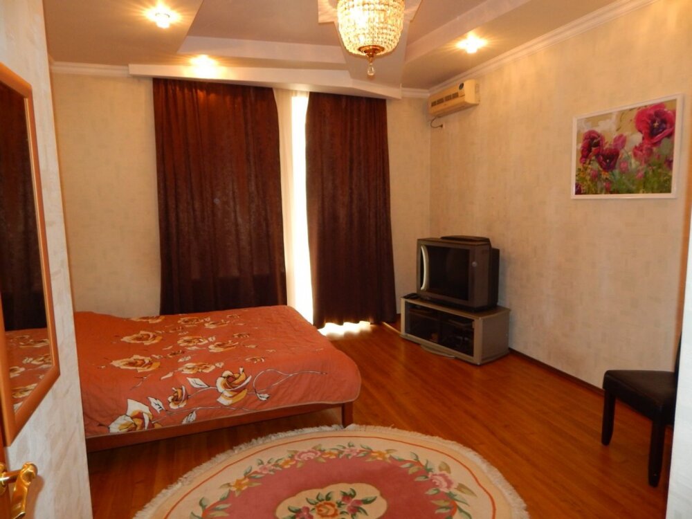 В апартаментах две спальные комнаты. В каждой комнате есть балкон, откуда открывается прекрасный панорамный вид на город, море, восход солнца, салют. Большая двуспальная кровать в каждой спальне. Мягкий раскладной диван с уютными креслами в комнате для гостей. Холодная, горячая вода постоянно.