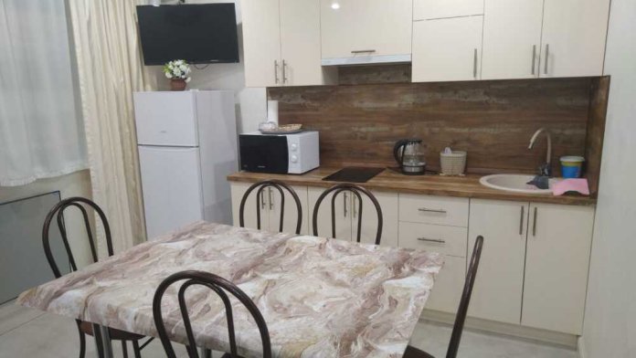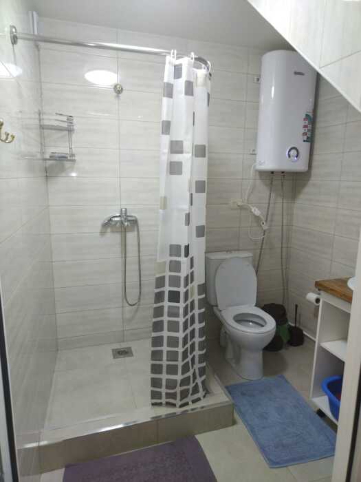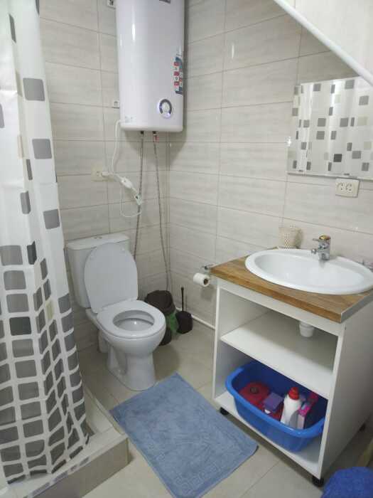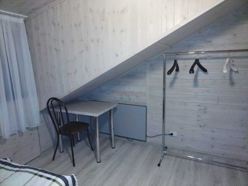 В коттедже три этажа, две не изолированные спальни, кухня, санузел. На первом этаже расположена кухня и санузел, на втором этаже спальня с 2-спальной кроватью и раздвижным креслом, на третьем этаже комната с двумя односпальными кроватями. На первом этаже полы с подогревом.