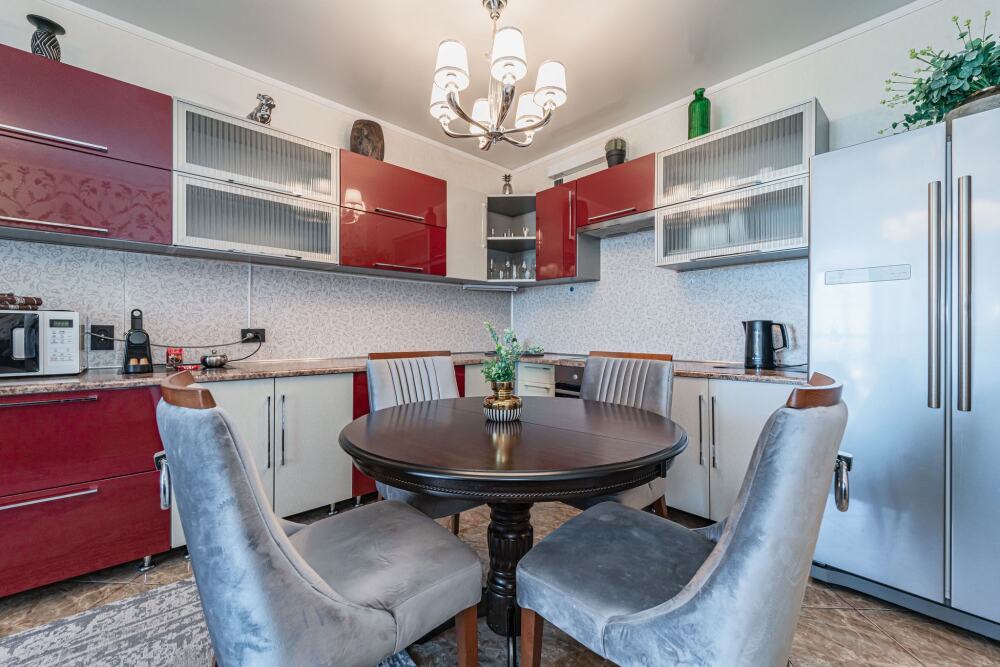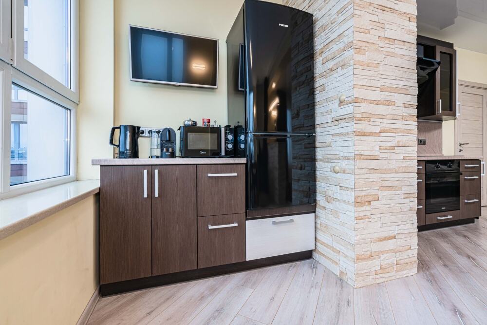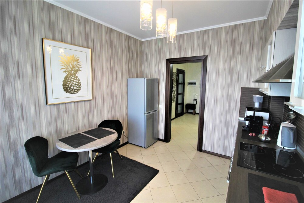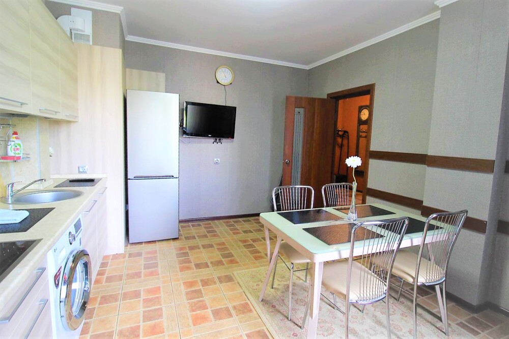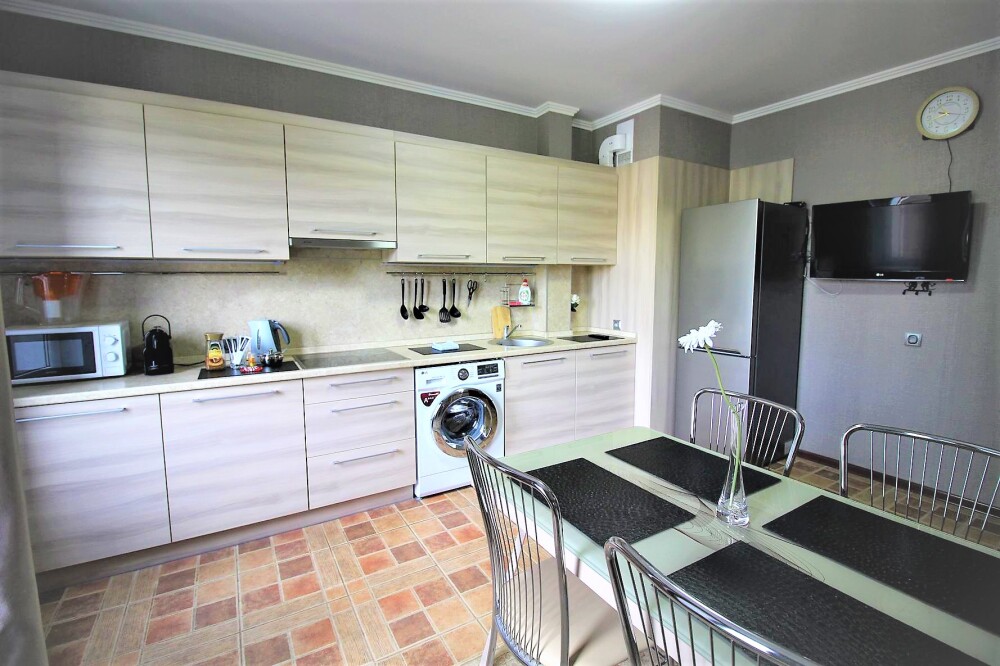 Современная кухня обставлена необходимой техникой, в том числе электроплитой и холодильником, также в распоряжении гостей посуда и кухонные принадлежности.