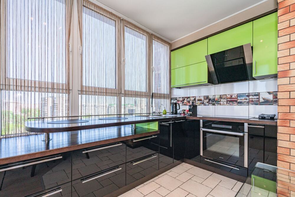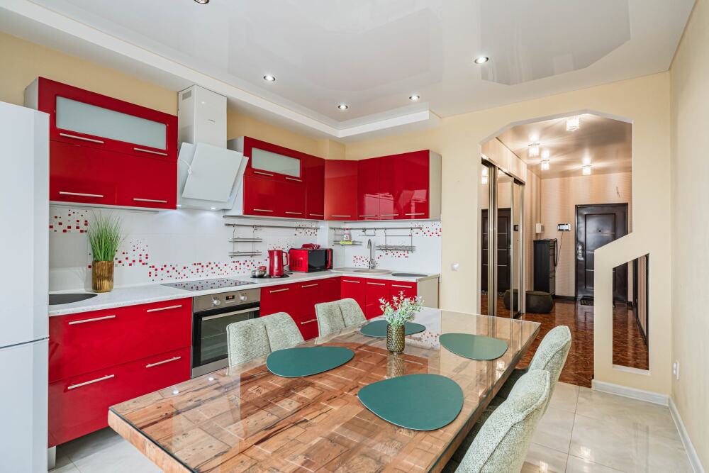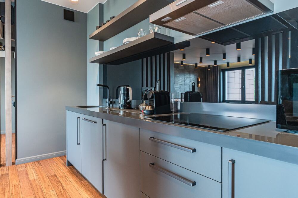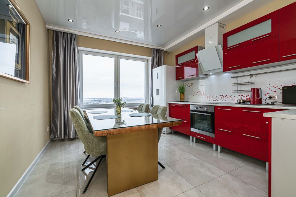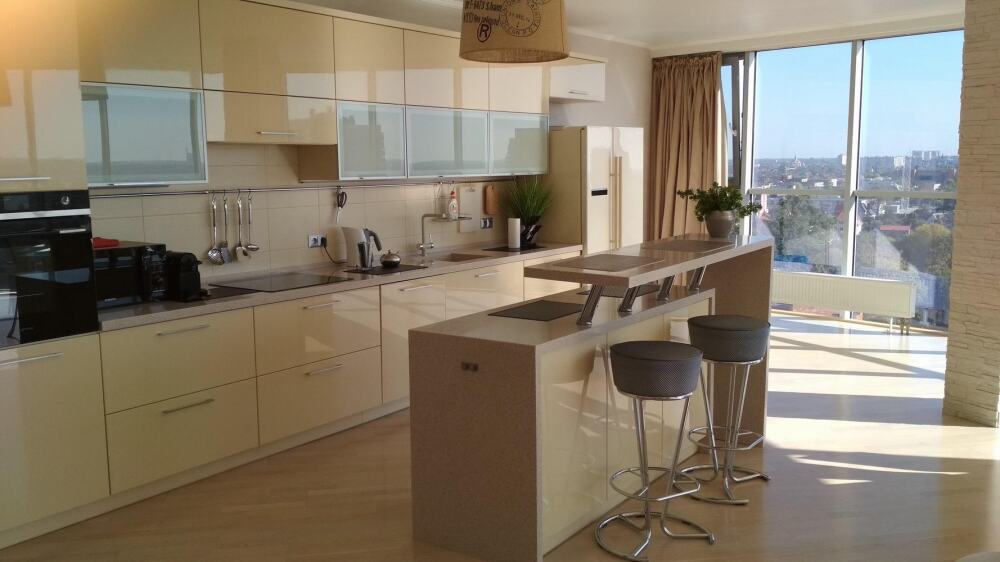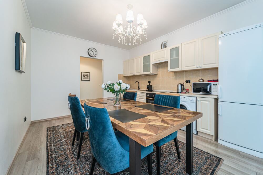 Современная кухня обставлена необходимой техникой, в том числе электроплитой и холодильником, также в распоряжении гостей посуда и кухонные принадлежности.