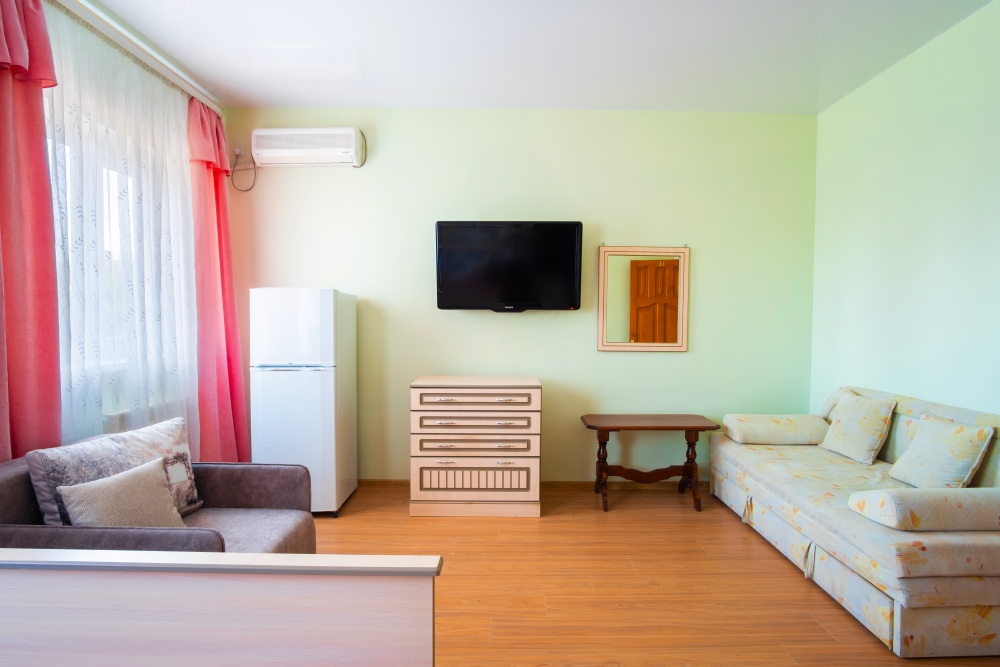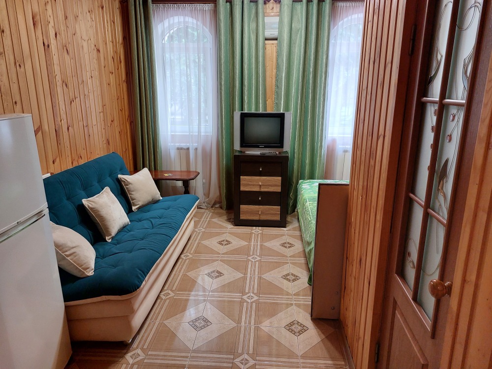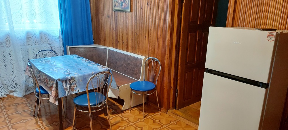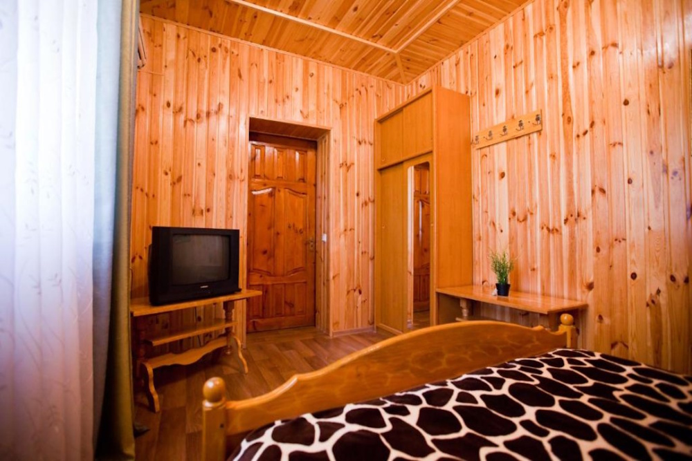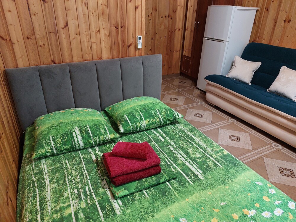 Номер «Деревянный» - название говорит само за себя. Отделка стен выполнена из дерева, экологически чистый и уютный. В номере стоит большой холодильник. Часто бронируют семьи с детьми, номер находится на 1-и этаже, много возвратных клиентов.