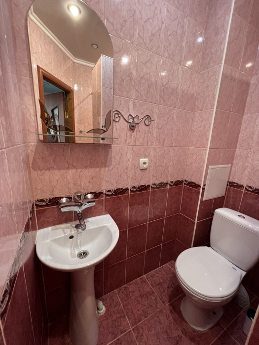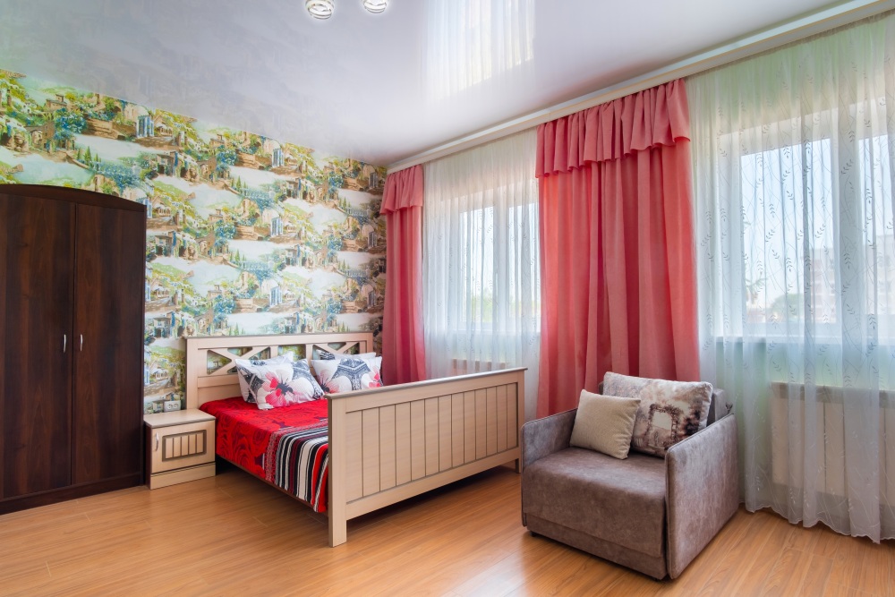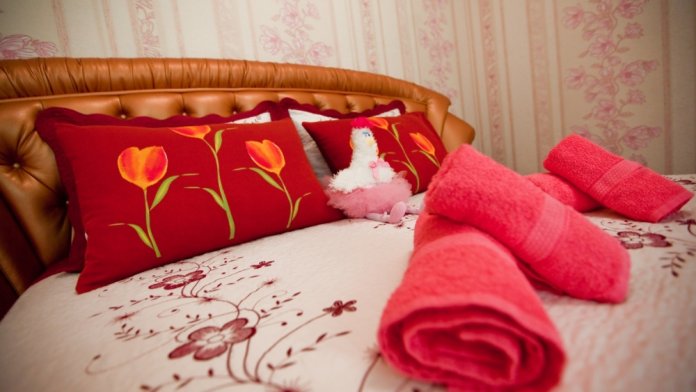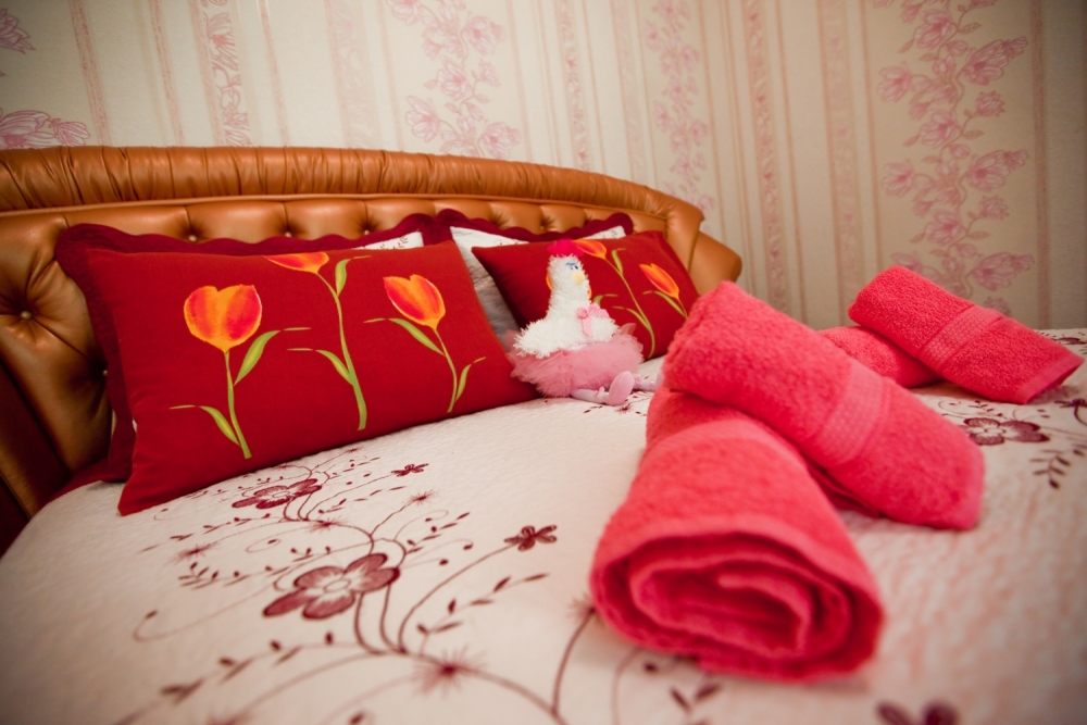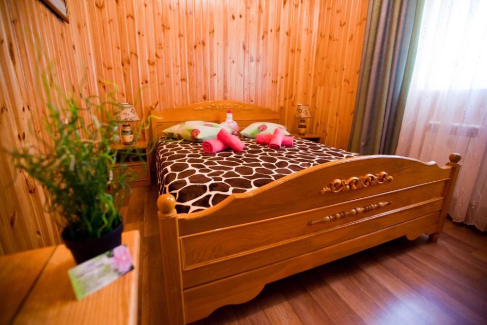 Номер «Малиновый рай»- уединённый, романтичный номер. Мебель сделана из дуба ручной работы. Номер находится на 1-м этаже, подойдёт для всех желающих отдохнуть у нас. Мы называем его универсальным, из-за его расположения часто пользуется спросом. Душ и туалет общие на два номера, на этаже.