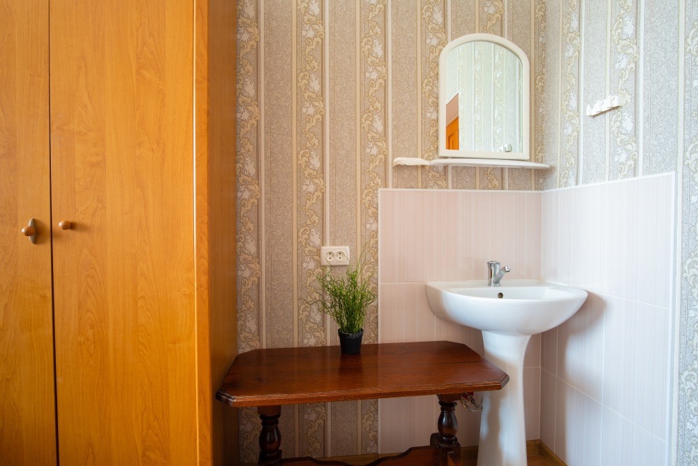 Номер «Счастливый» - получил своё название по номеру комнаты № 13. Наши гости шутили, что будут жить в счастливом номере. Так и закрепилось это уникальное название. Хороший, уютный, светлый номер. Находится на 3-м этаже имеет выход в гостиную, окна выходят на внутренний двор. В номере имеется умывальник. Душ и туалет общие на два номера, на этаже.
