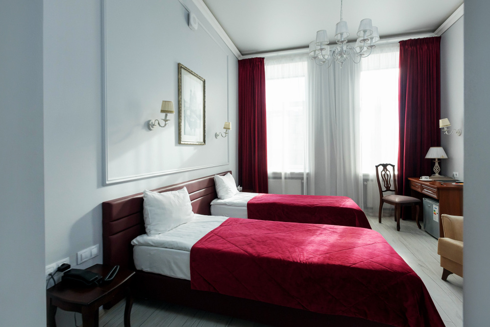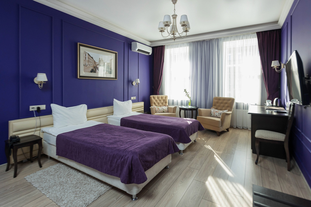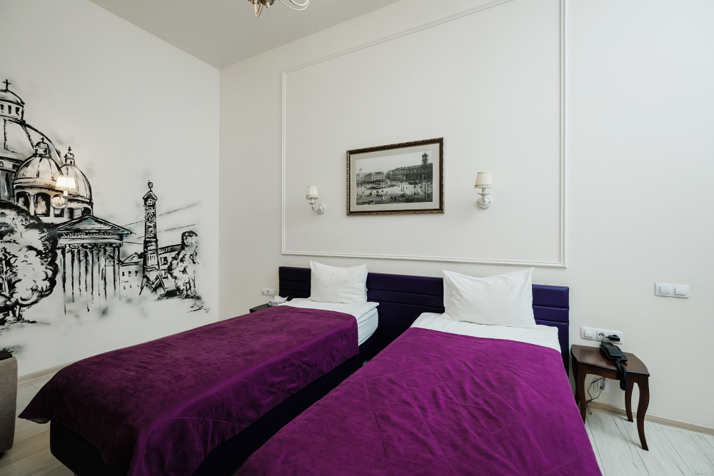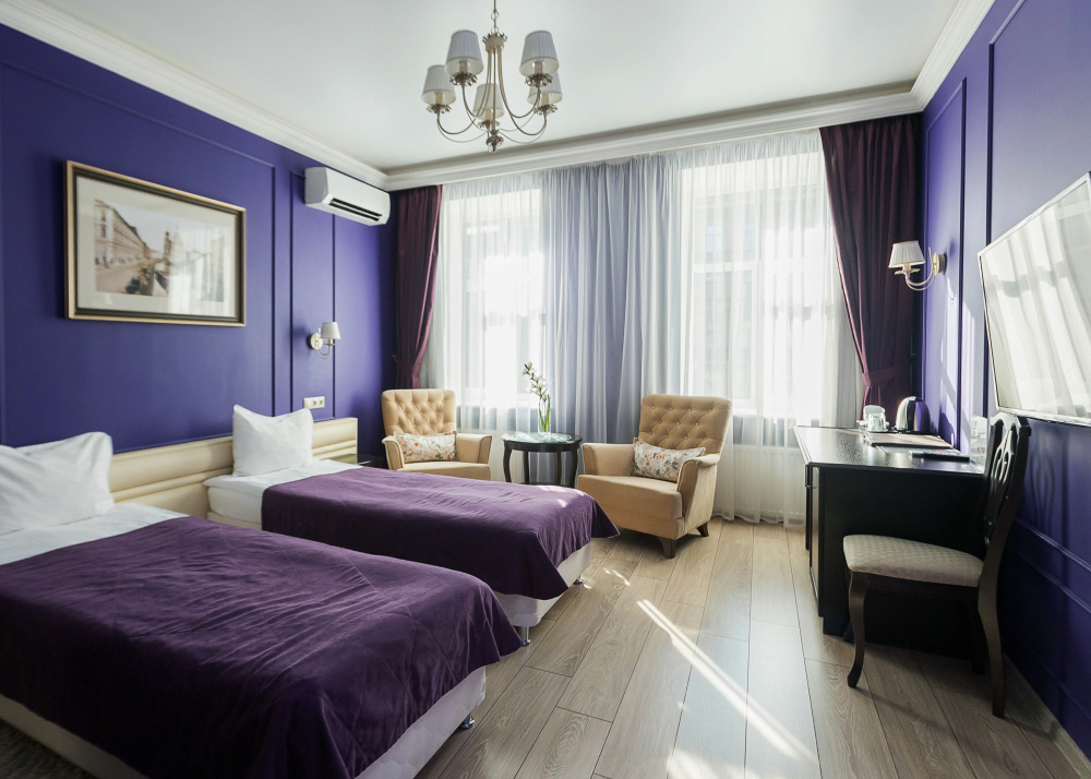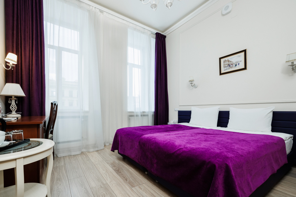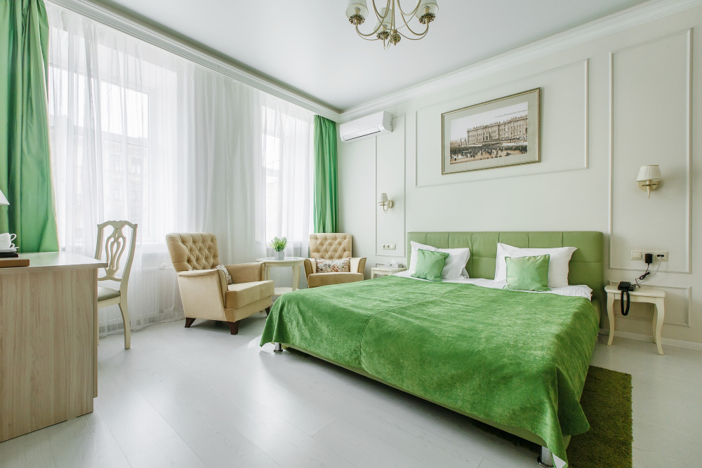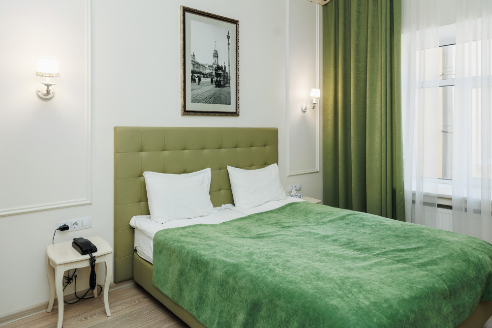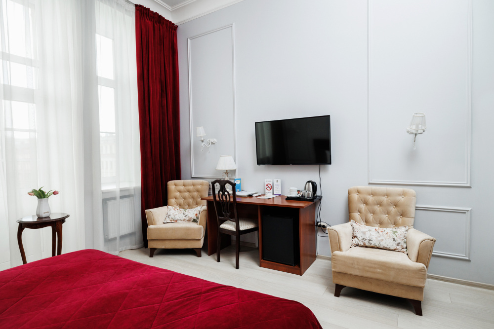 Просторный видовой номер со спальней и ванной комнатой с душевой кабиной, феном, банными и косметическими принадлежностями. Окна номера выходят на Невский проспект. Меблирован двуспальной кроватью-трансформером (можно разделить на две односпальные кровати), шкафом-гардеробом, рабочим столом, журнальным столиком и креслом. Номер оборудован спутниковым ТВ, бесплатным Wi-Fi, кондиционером, телефоном для внутренней связи по отелю, сейфом, чайной станцией (чайник, комплект чашек, чай, сахар), мини-холодильником. В некоторых номерах имеются также декоративные камины.
