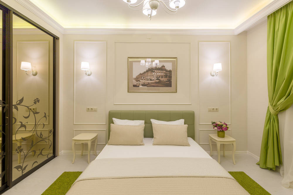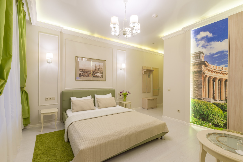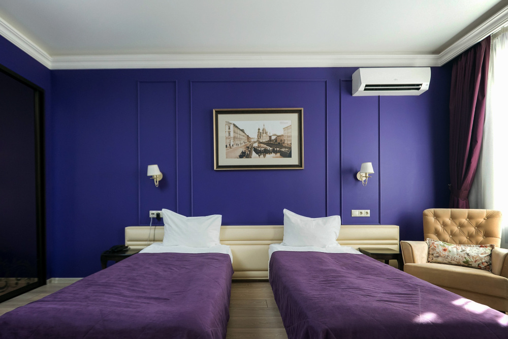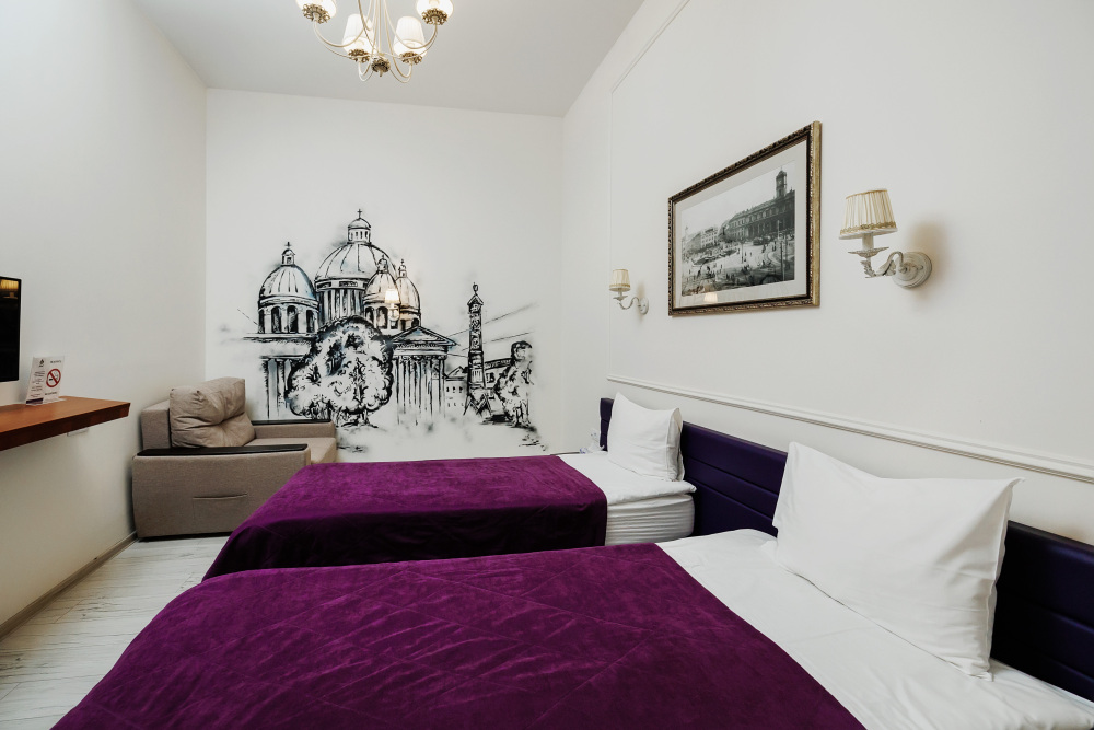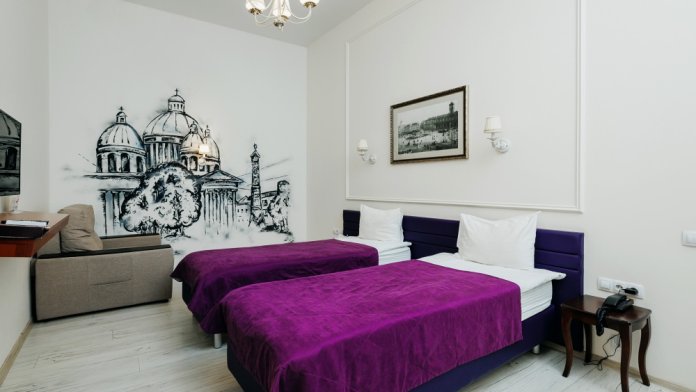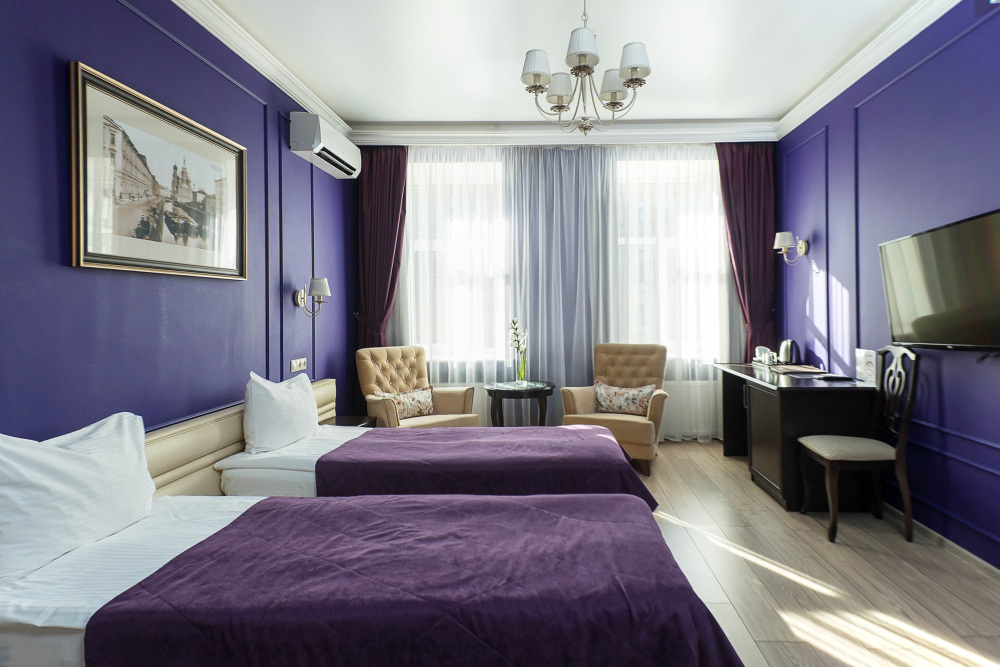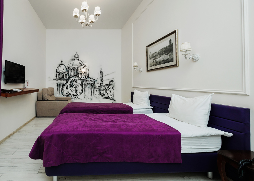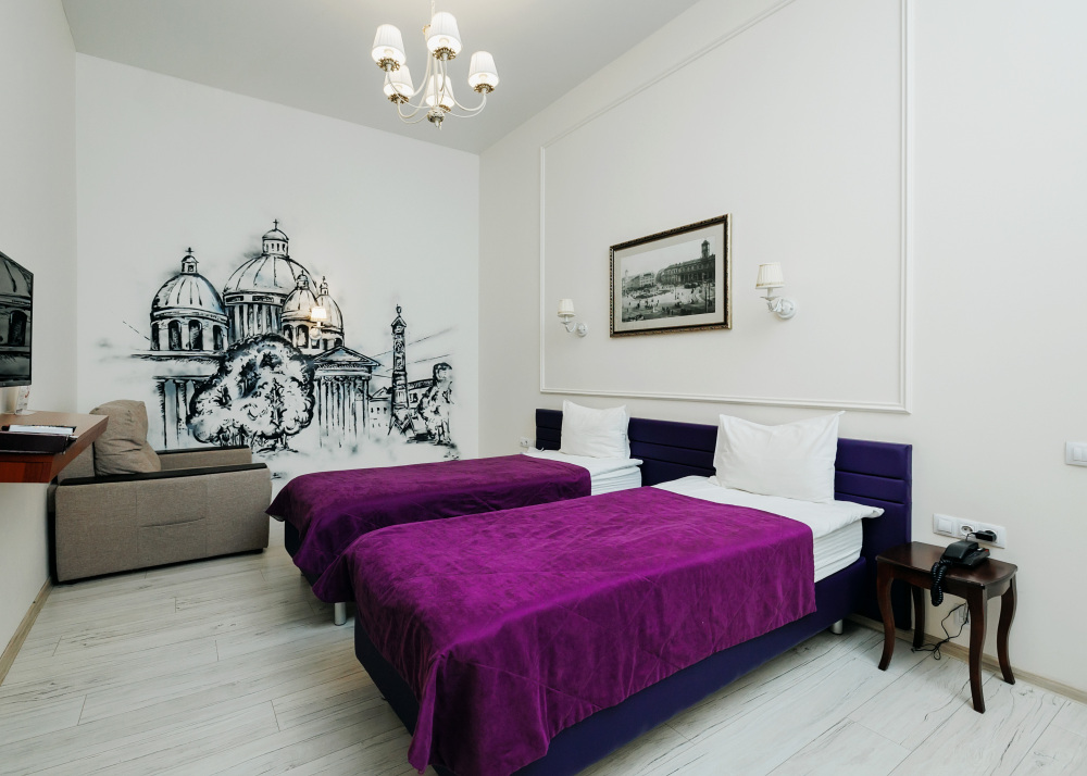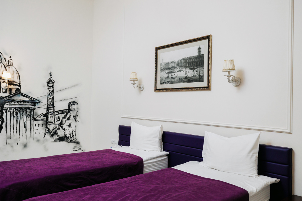 Просторный видовой номер со спальней и ванной комнатой с душевой кабиной, феном, банными и косметическими принадлежностями. Окна номера выходят на Невский проспект. Меблирован двуспальной кроватью-трансформером (можно разделить на две односпальные кровати), шкафом-гардеробом, рабочим столом, журнальным столиком и креслом. Номер оборудован спутниковым ТВ, бесплатным Wi-Fi, кондиционером, телефоном для внутренней связи по отелю, сейфом, чайной станцией (чайник, комплект чашек, чай, сахар), мини-холодильником. В некоторых номерах имеются также декоративные камины.