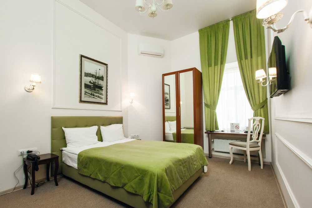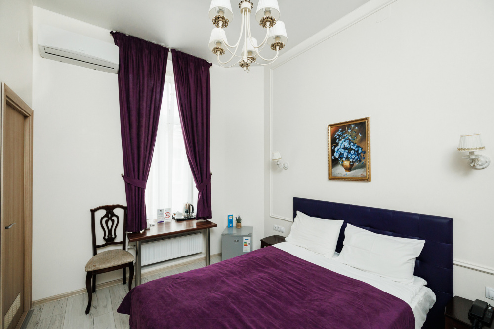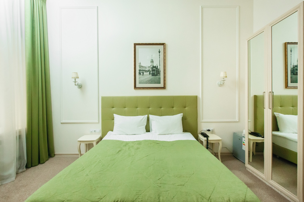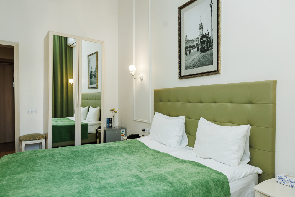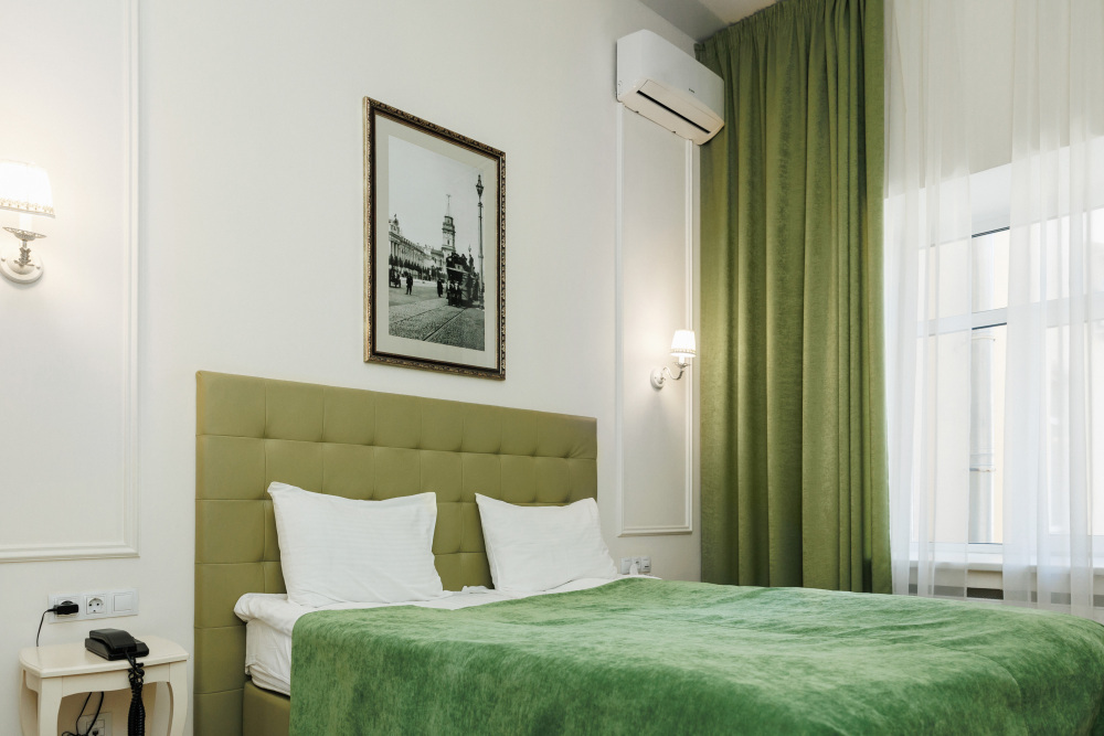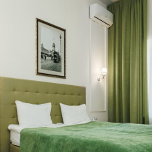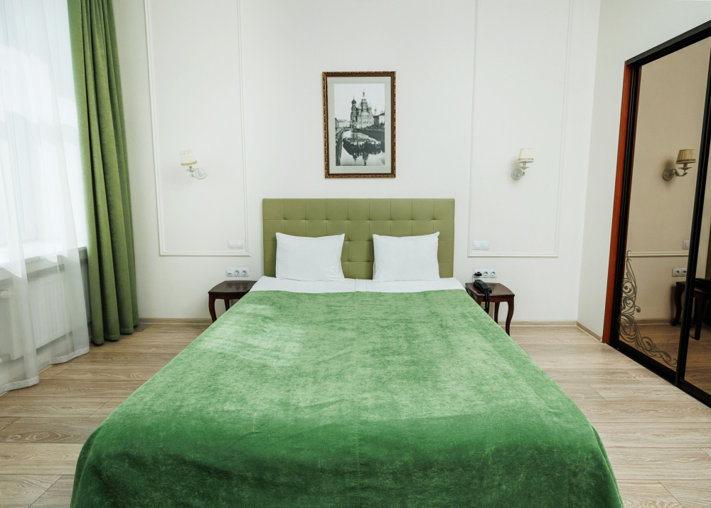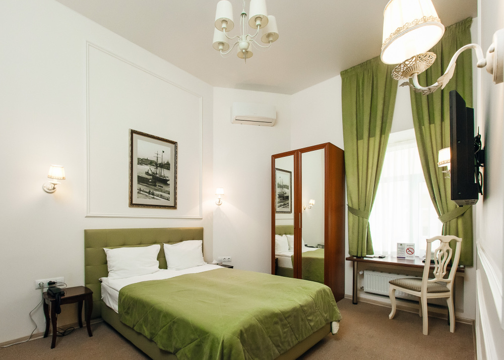 Современный двухместный номер со спальней и ванной комнатой с душевой кабиной, феном, банными и косметическими принадлежностями. Окна номера выходят в тихий внутренний двор. Меблирован большой двуспальной кроватью, шкафом-гардеробом. Номер оборудован спутниковым ТВ, бесплатным Wi-Fi, кондиционером, телефоном для внутренней связи по отелю, сейфом, чайной станцией (чайник, комплект чашек, чай, сахар), мини-холодильником.