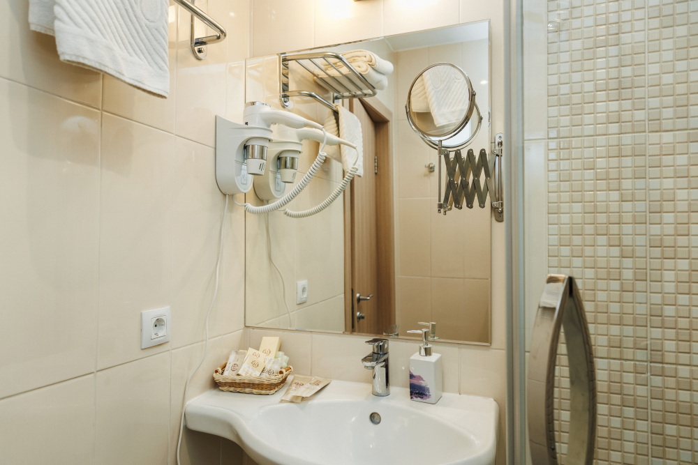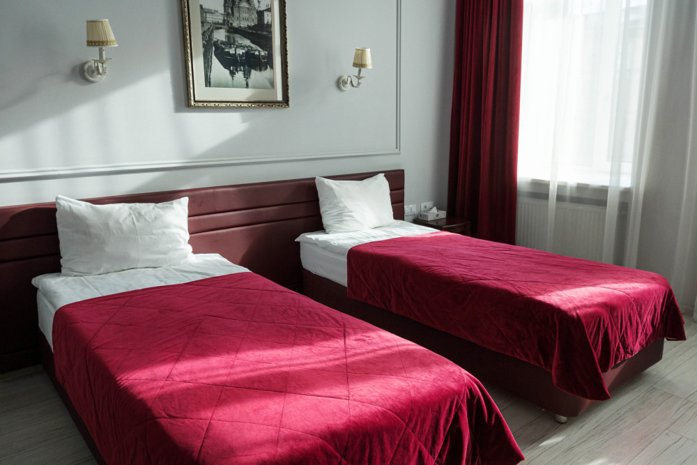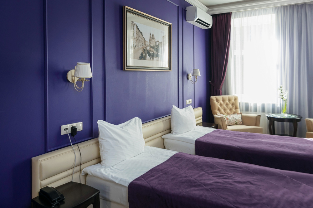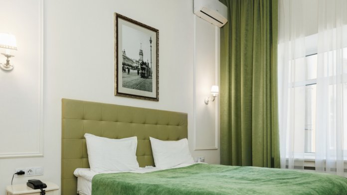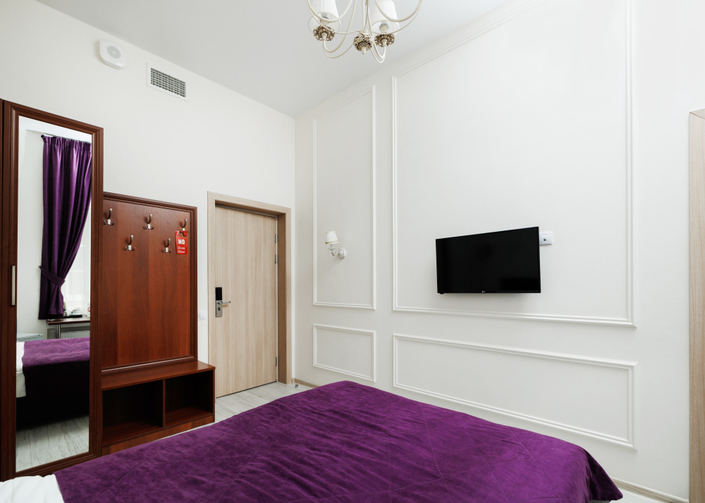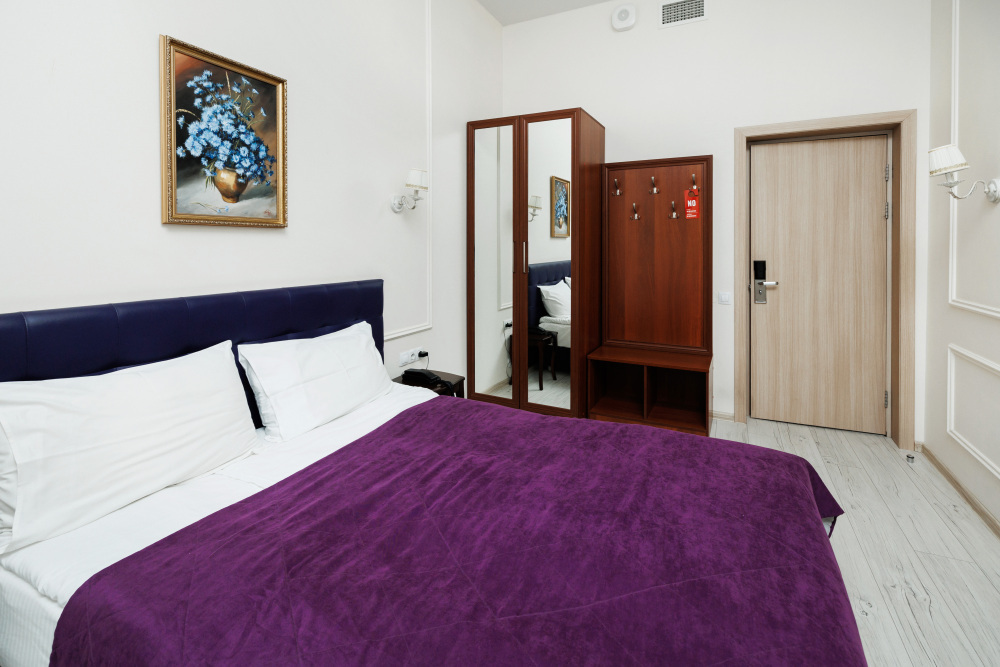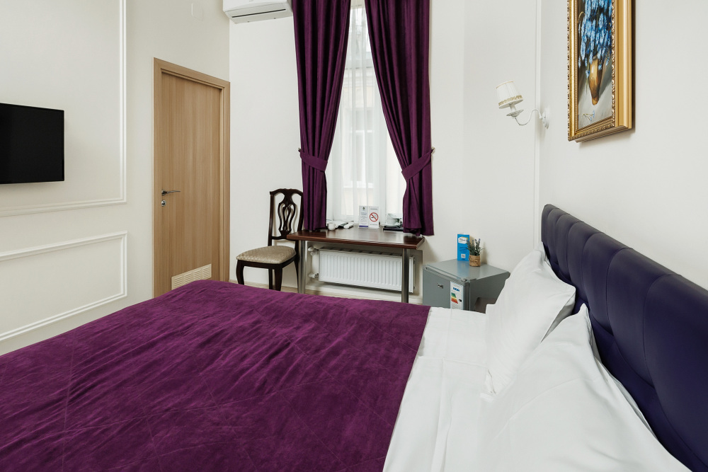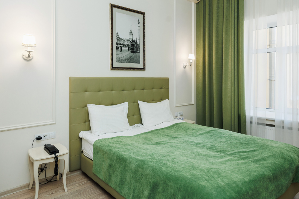 Современный двухместный номер со спальней и ванной комнатой с душевой кабиной, феном, банными и косметическими принадлежностями. Окна номера выходят в тихий внутренний двор. Меблирован большой двуспальной кроватью, шкафом-гардеробом. Номер оборудован спутниковым ТВ, бесплатным Wi-Fi, кондиционером, телефоном для внутренней связи по отелю, сейфом, чайной станцией (чайник, комплект чашек, чай, сахар), мини-холодильником.