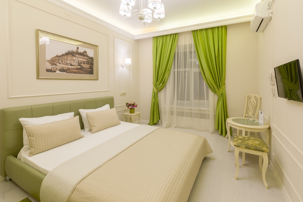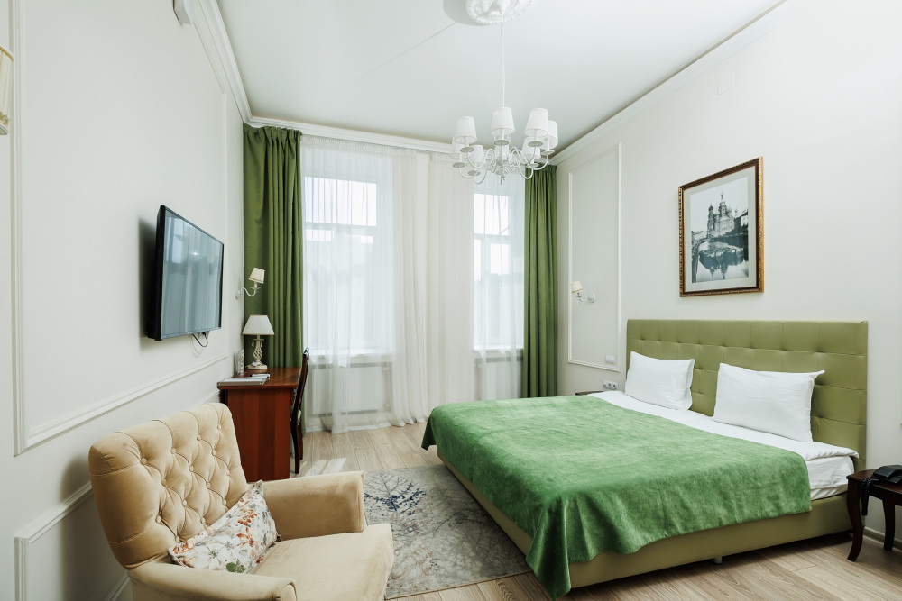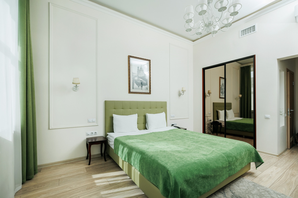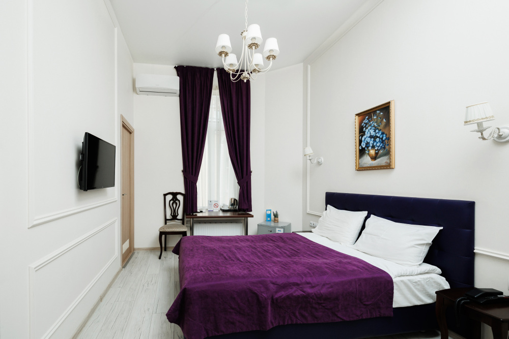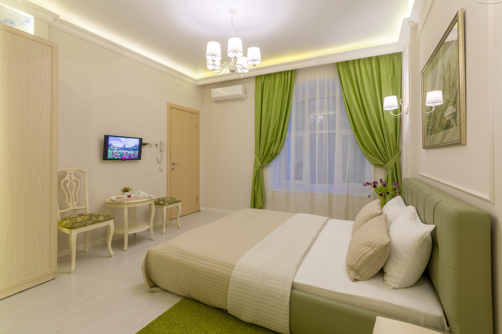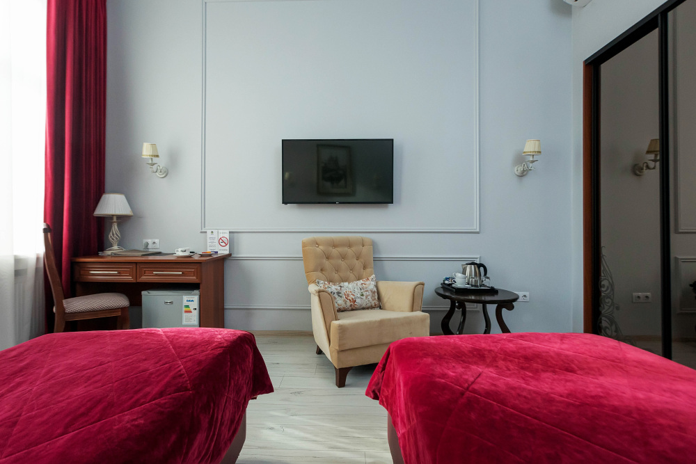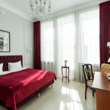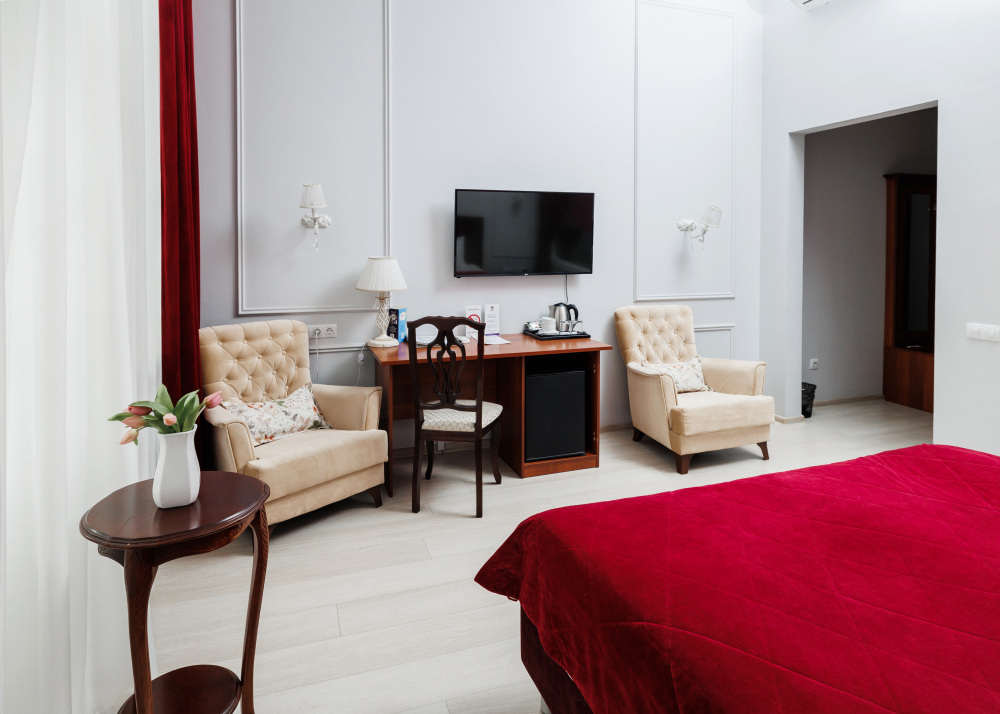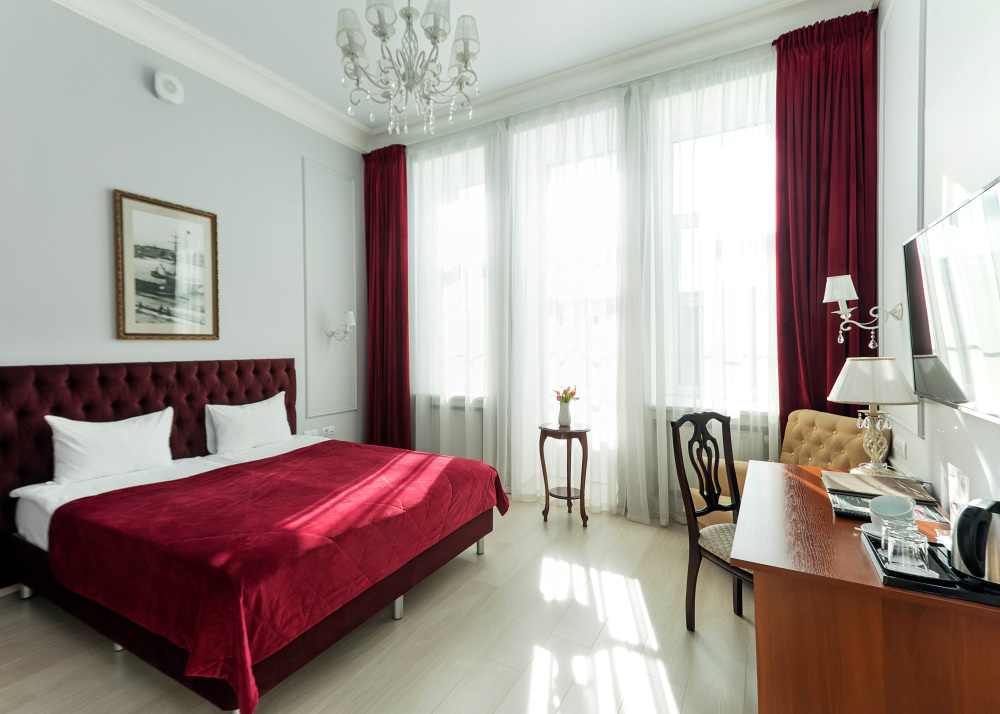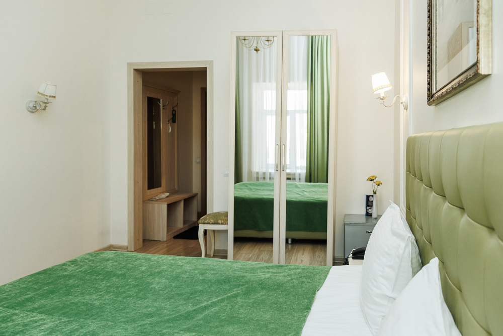 Просторный номер со спальней и ванной комнатой с душевой кабиной, феном, банными и косметическими принадлежностями. Окна номера выходят в тихий внутренний двор. Меблированы большой двуспальной кроватью, шкафом-гардеробом, журнальным столиком. Номер оборудован спутниковым ТВ, бесплатным Wi-Fi, кондиционером, телефоном для внутренней связи по отелю, сейфом, чайной станцией (чайник, комплект чашек, чай, сахар), мини-холодильником.