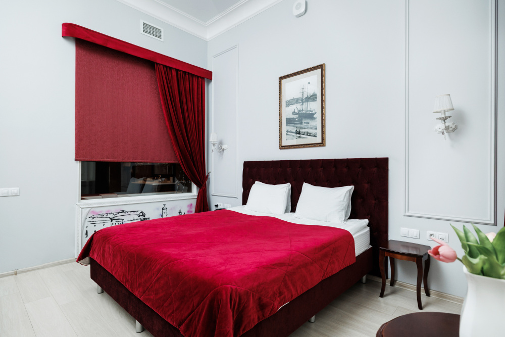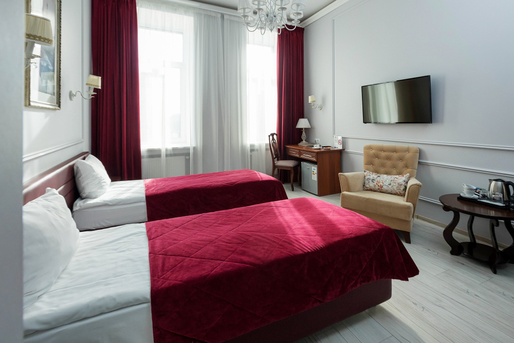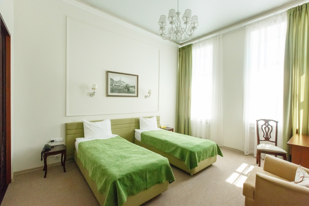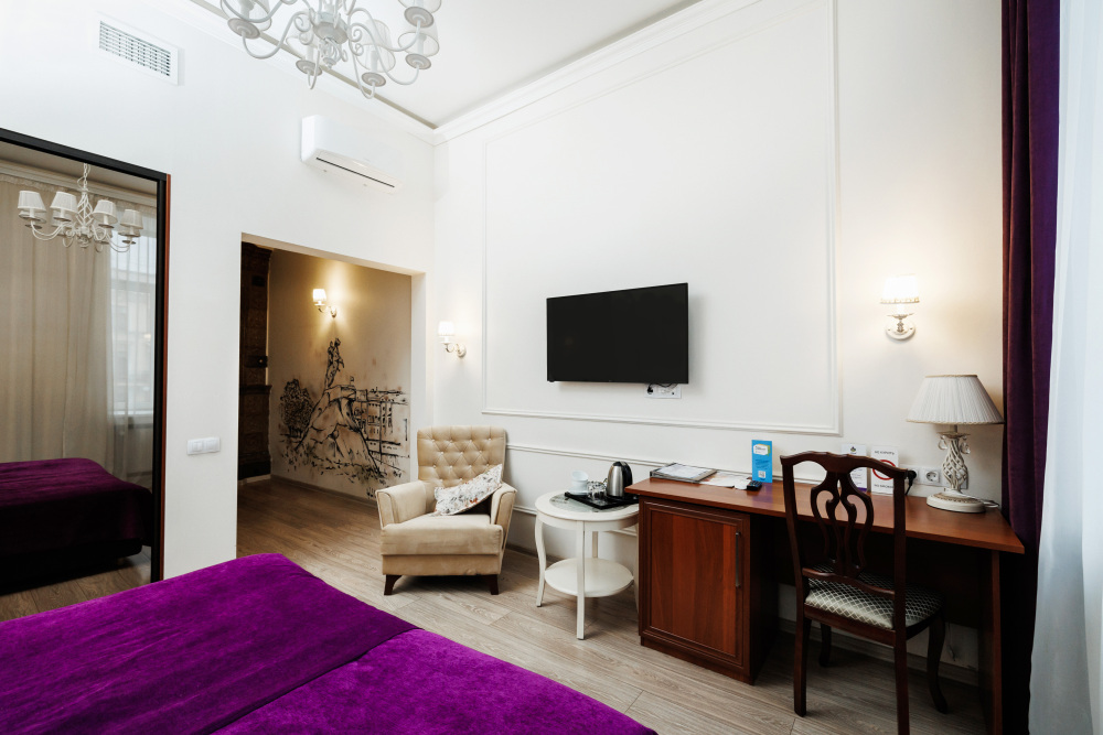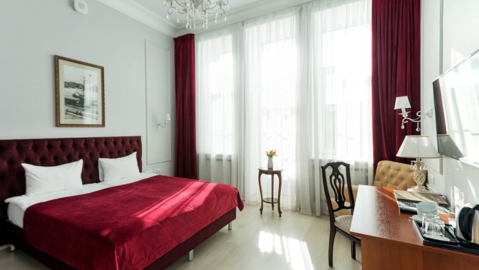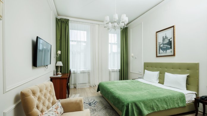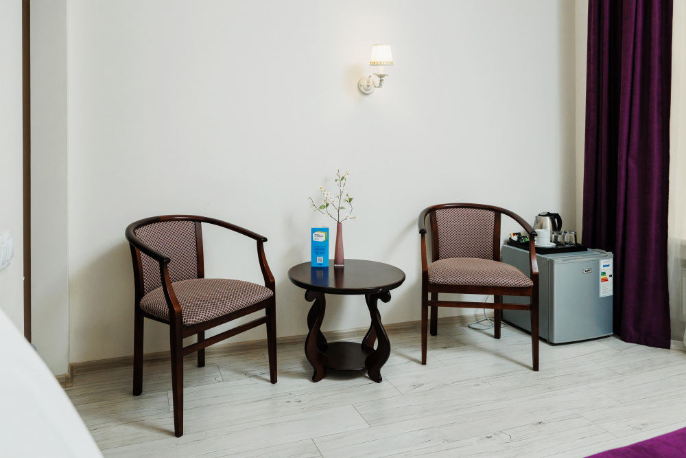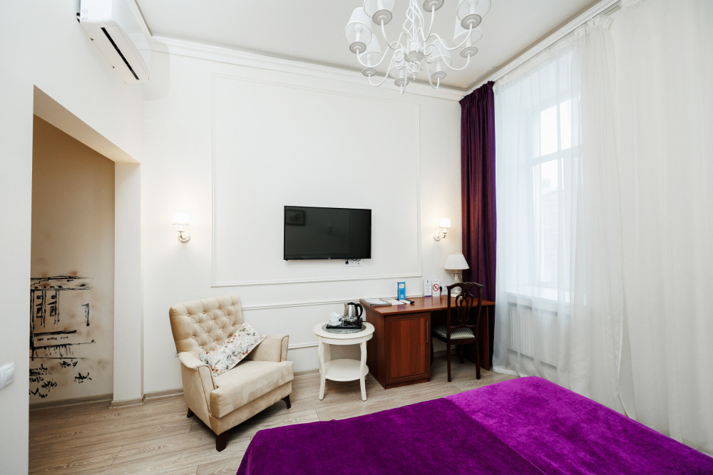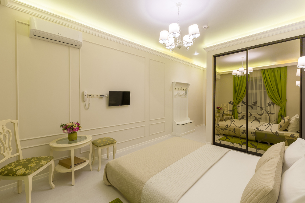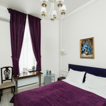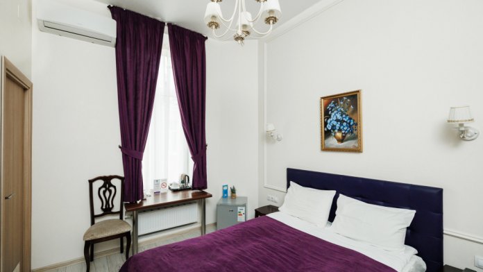 Просторный номер со спальней и ванной комнатой с душевой кабиной, феном, банными и косметическими принадлежностями. Окна номера выходят в тихий внутренний двор. Меблированы большой двуспальной кроватью, шкафом-гардеробом, журнальным столиком. Номер оборудован спутниковым ТВ, бесплатным Wi-Fi, кондиционером, телефоном для внутренней связи по отелю, сейфом, чайной станцией (чайник, комплект чашек, чай, сахар), мини-холодильником.