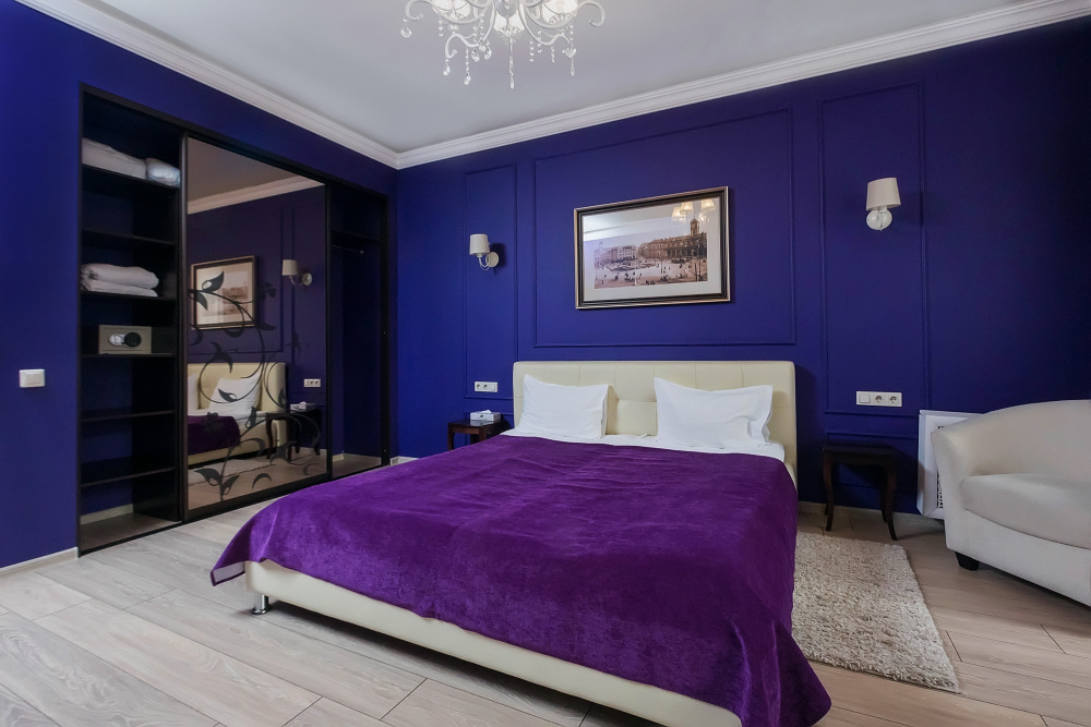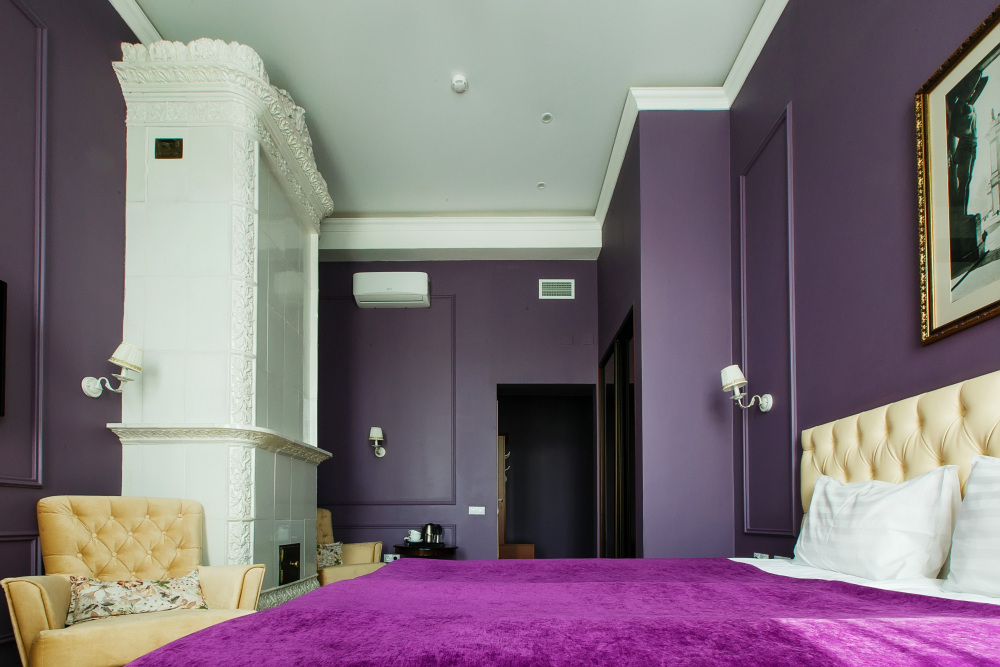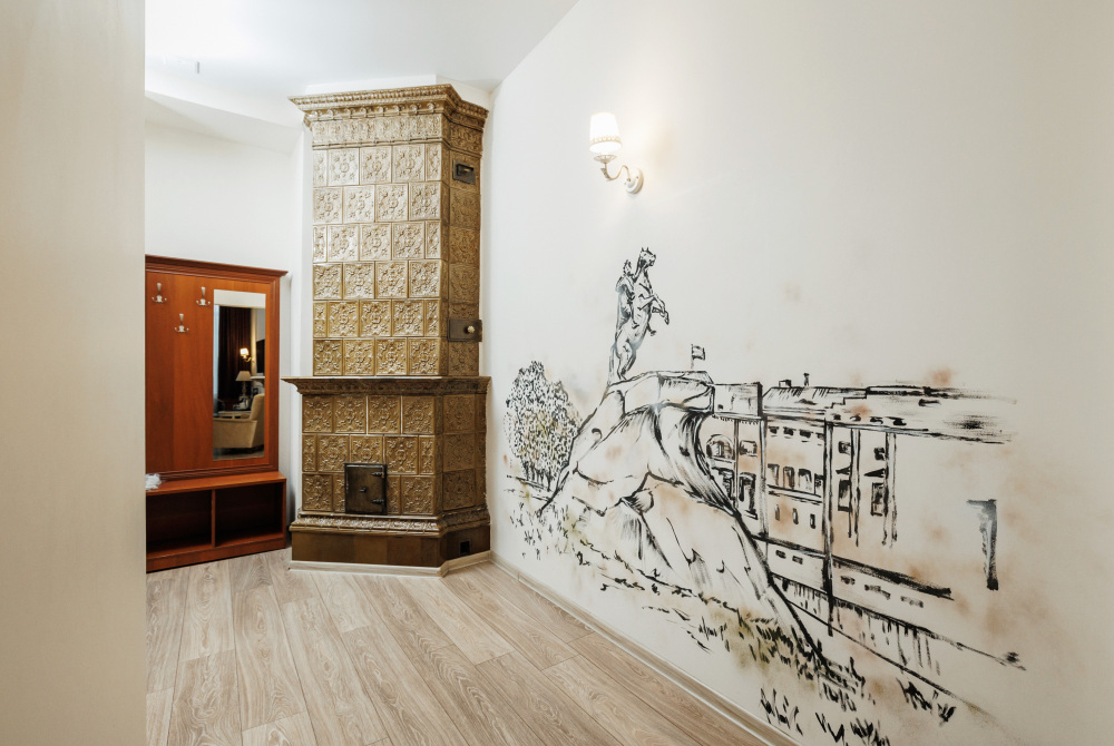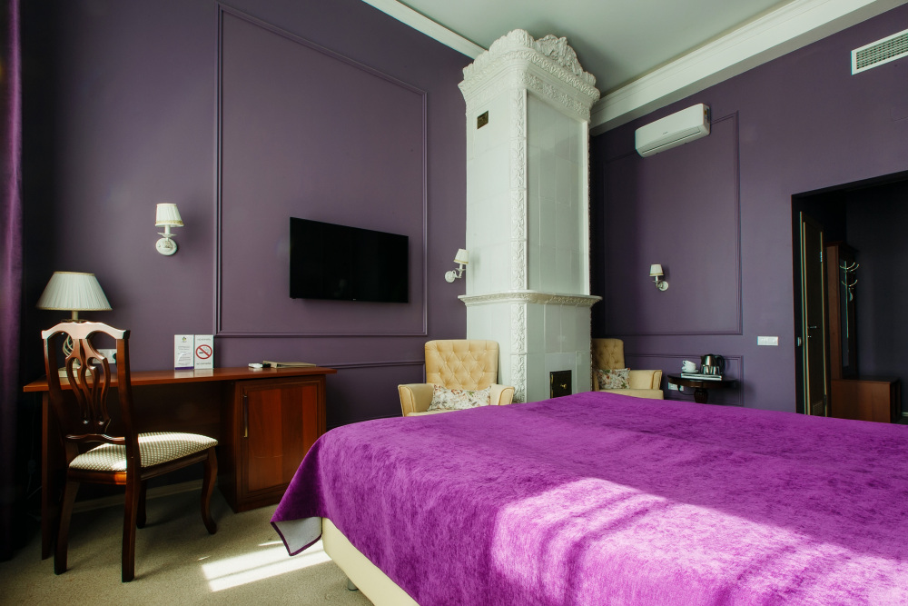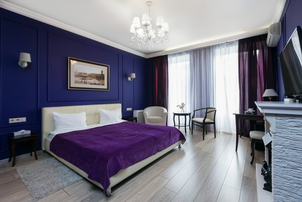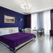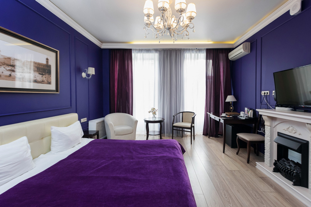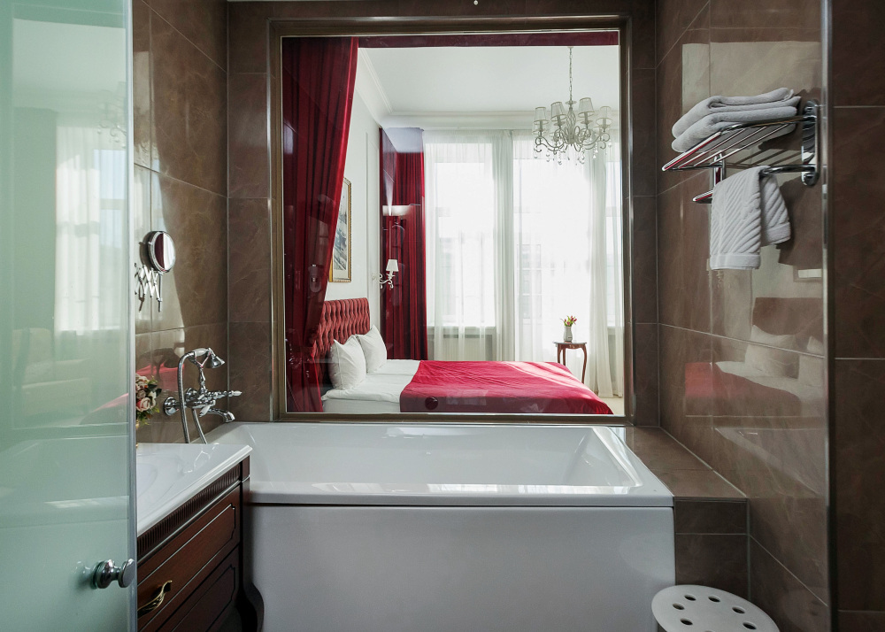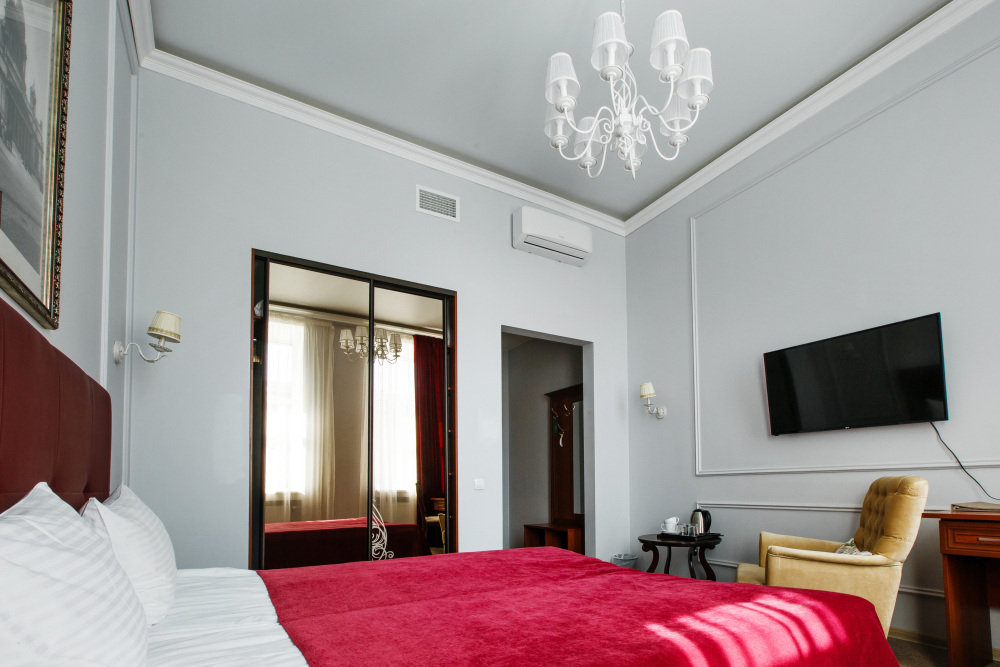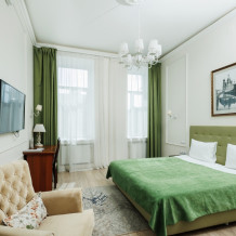 Просторный видовой номер со спальней и ванной комнатой, оснащенной ванной, феном, банными и косметическими принадлежностями, декоративным камином, а также с балконом, выходящим на Невский проспект. Меблирован большой двуспальной кроватью, шкафом-гардеробом, рабочим столом, журнальным столиком и креслом. Номер оборудован спутниковым ТВ, бесплатным Wi-Fi, кондиционером, телефоном для внутренней связи по отелю, сейфом, чайной станцией (чайник, комплект чашек, чай, сахар), мини-холодильником.