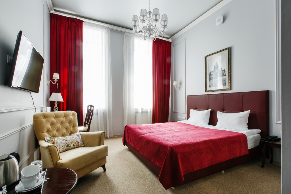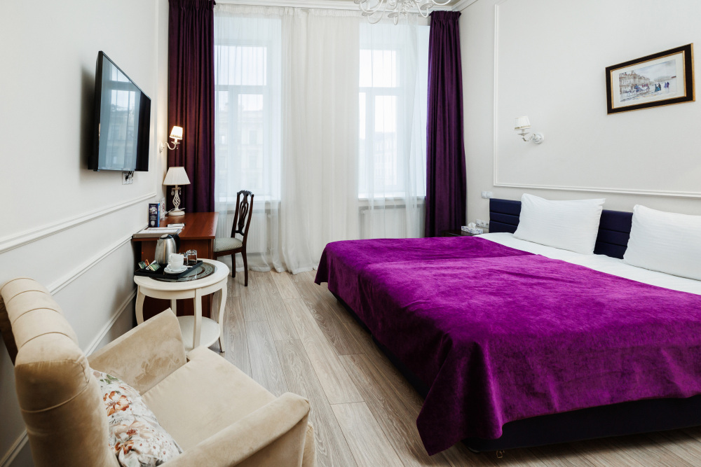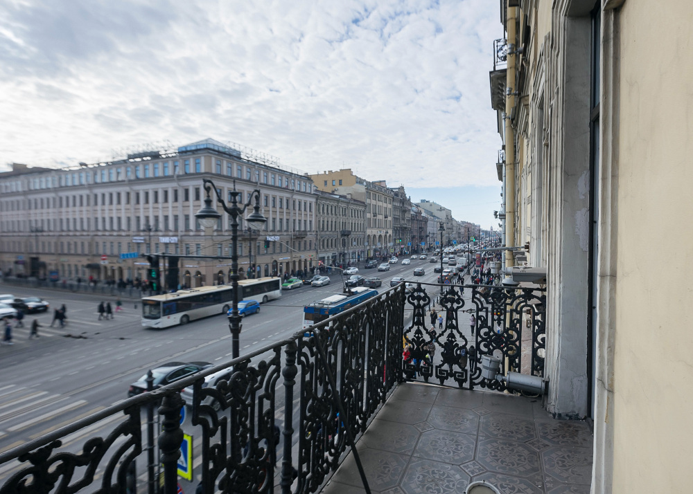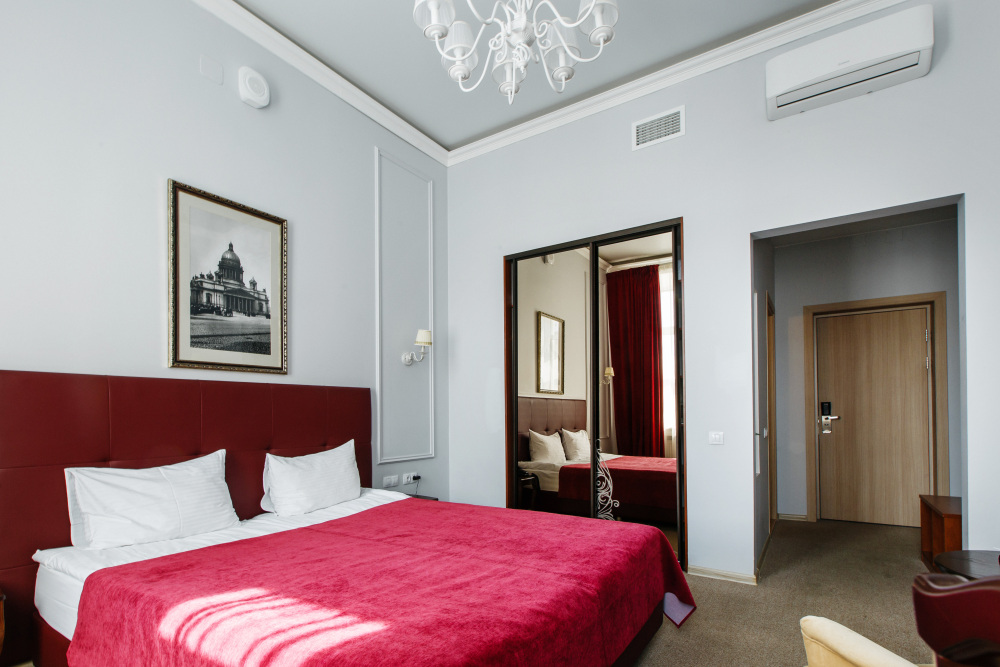 Просторный видовой номер со спальней и ванной комнатой, оснащенной ванной, душевой кабиной, феном, банными и косметическими принадлежностями, а также с балконом, выходящим на Невский проспект. Меблирован большой двуспальной кроватью, шкафом-гардеробом, рабочим столом, журнальным столиком и креслом. Номер оборудован спутниковым ТВ, бесплатным Wi-Fi, кондиционером, телефоном для внутренней связи по отелю, сейфом, чайной станцией (чайник, комплект чашек, чай, сахар), мини-холодильником.