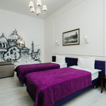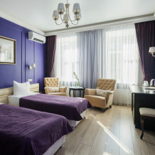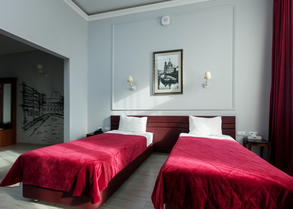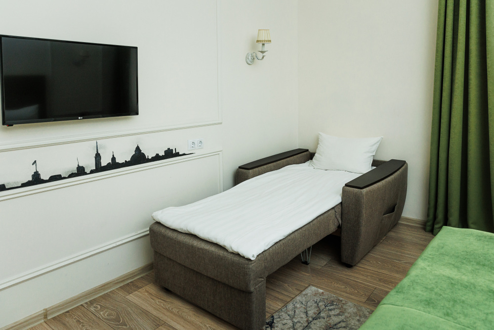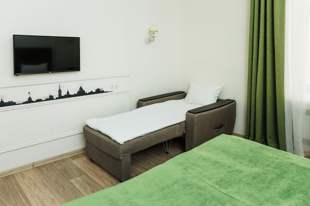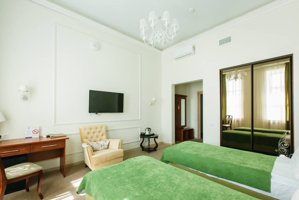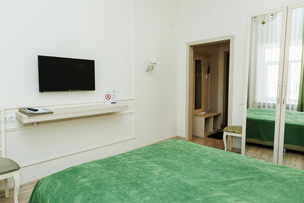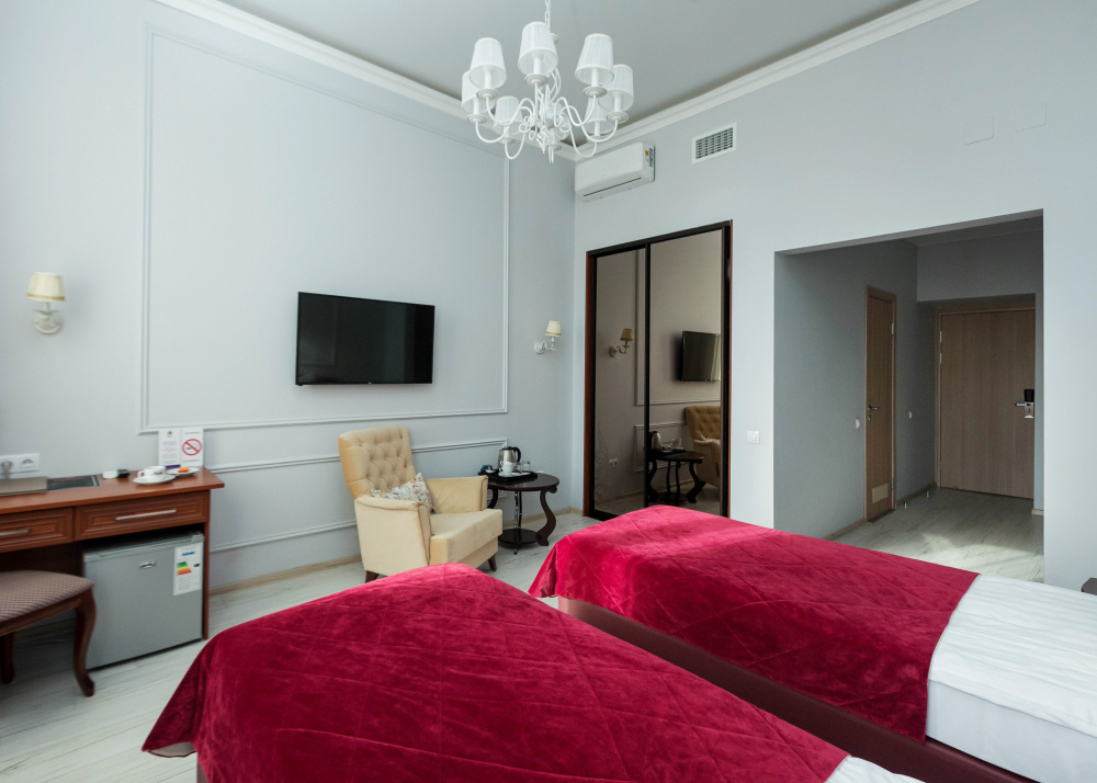 Просторный номер со спальней и ванной комнатой с душевой кабиной, феном, банными и косметическими принадлежностями. Окна выходят во внутренний тихий двор. Меблирован одной большой двуспальной кроватью-трансформером (можно разделить на две односпальные кровати), шкафом-гардеробом, журнальным столиком, раскладным креслом-кроватью. Номер оборудован спутниковым ТВ, бесплатным Wi-Fi, кондиционером, телефоном для внутренней связи по отелю, сейфом, чайной станцией (чайник, комплект чашек, чай, сахар), мини-холодильником.