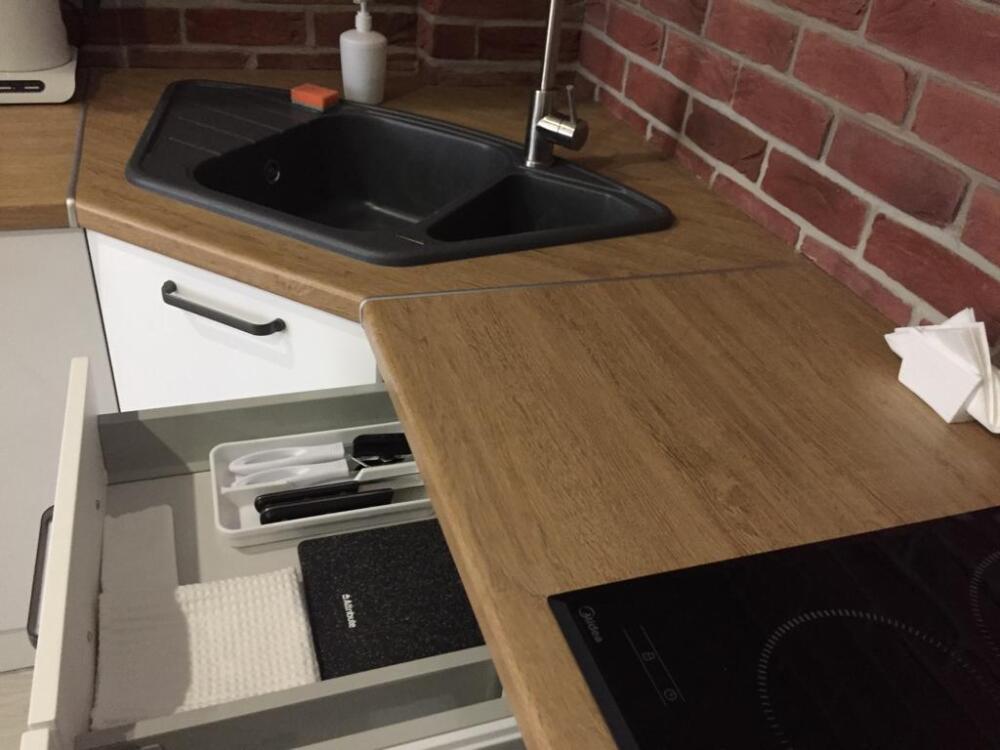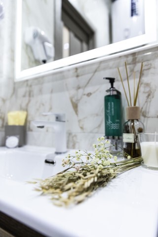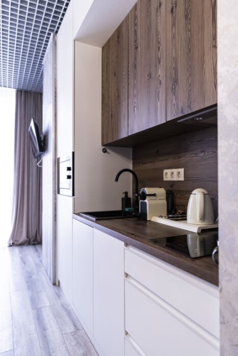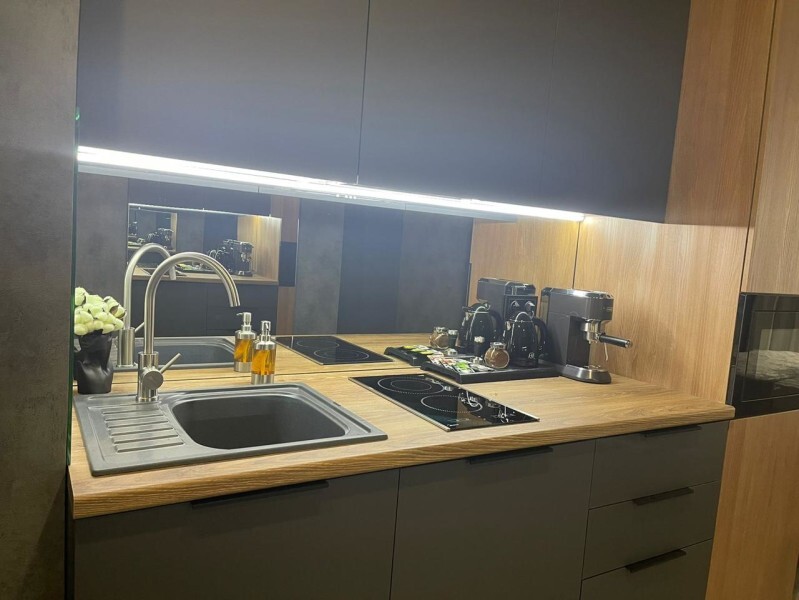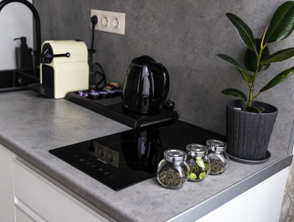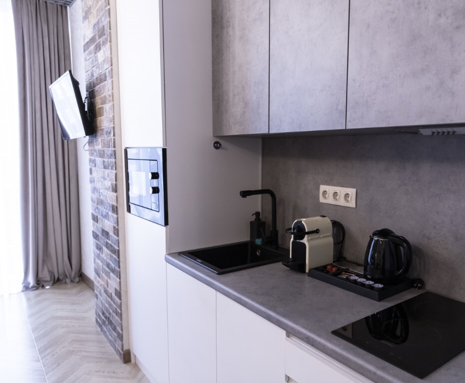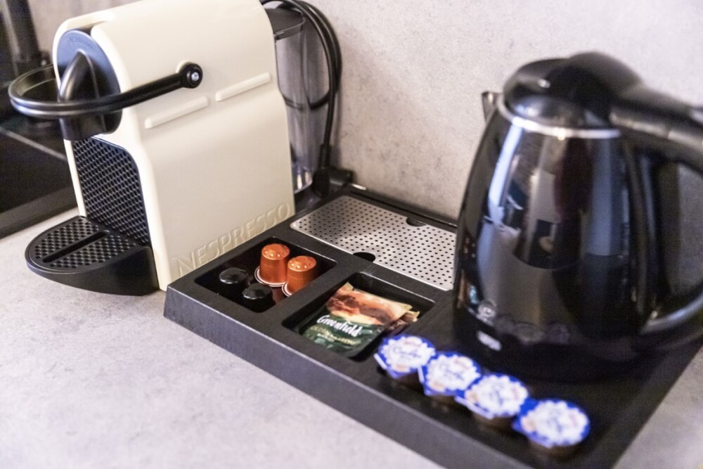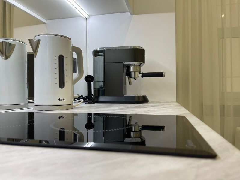 - мини-кухня с полным набором посуды для приготовления и принятия пищи, а также капсульная кофемашина с набором капсул, бутилированная питьевая вода для приготовления ароматного кофе и чая, порционные сливки, сахар, специи,