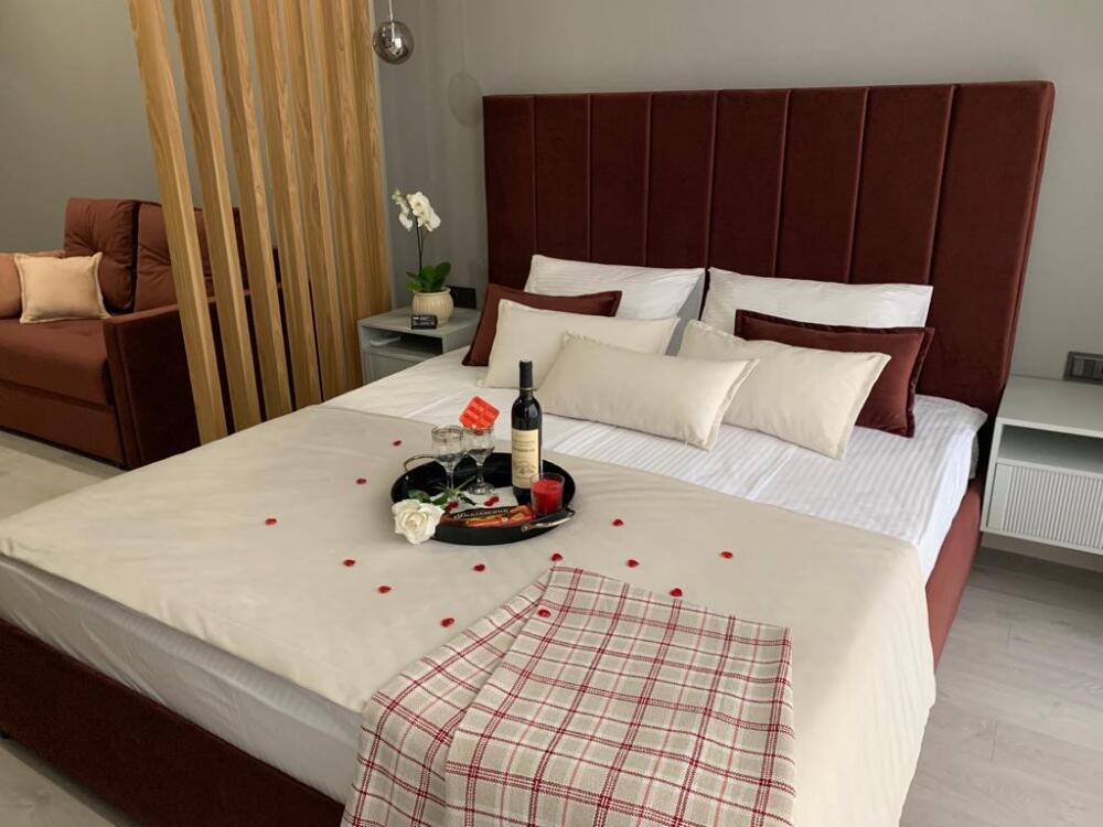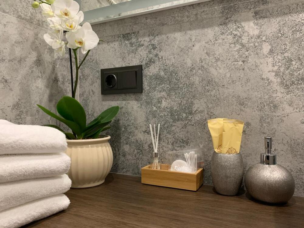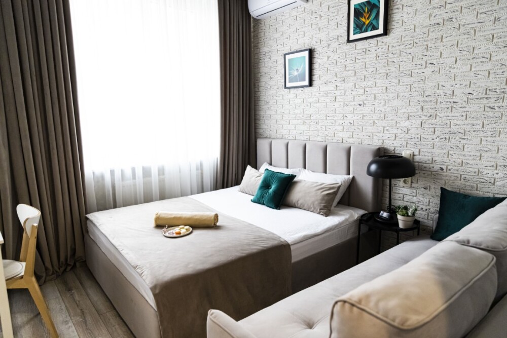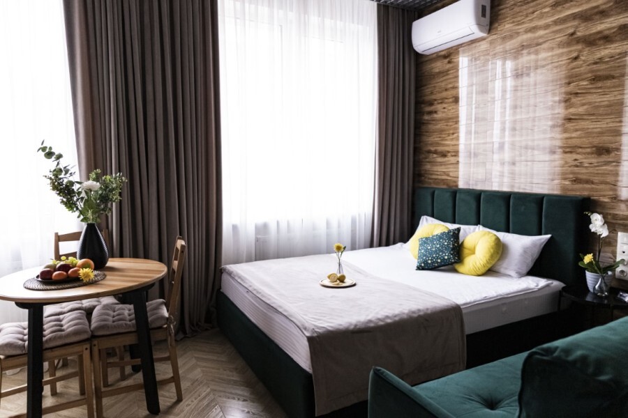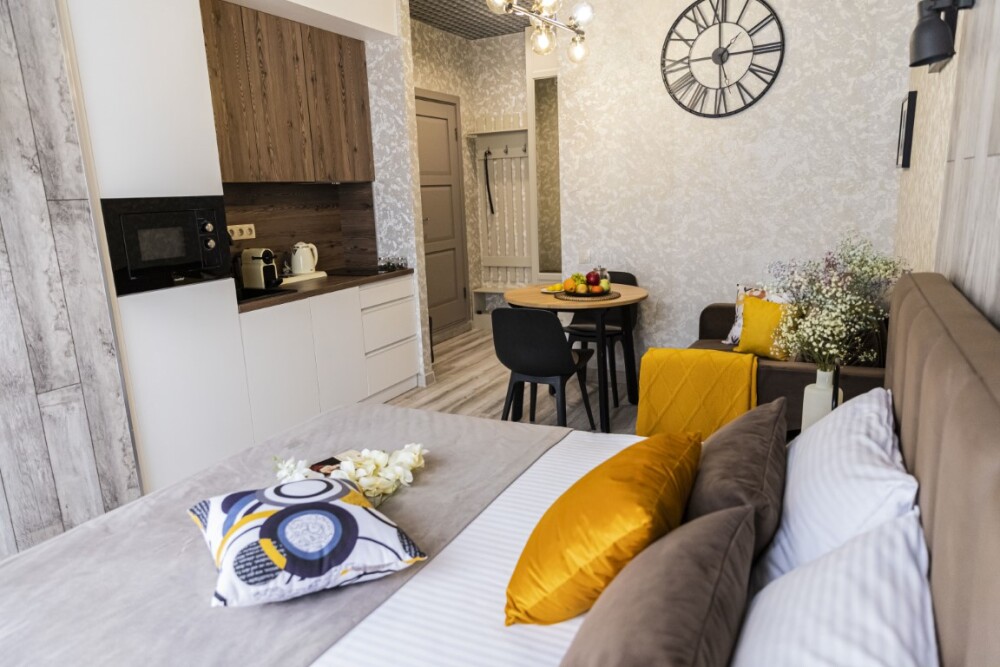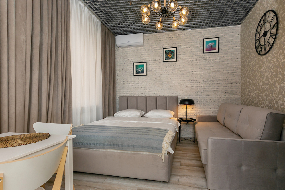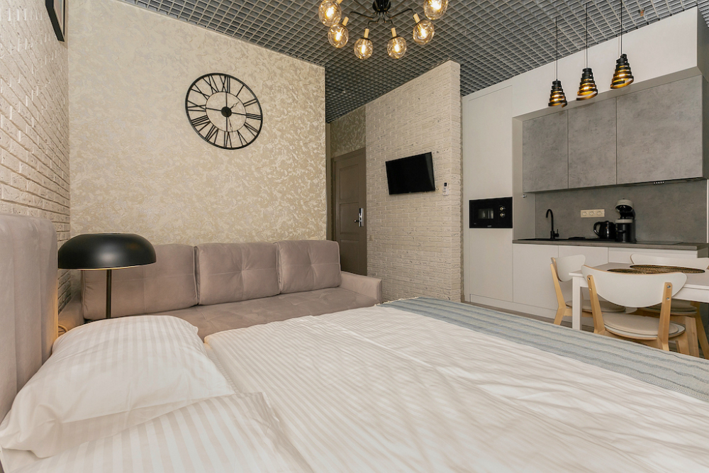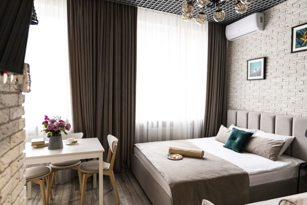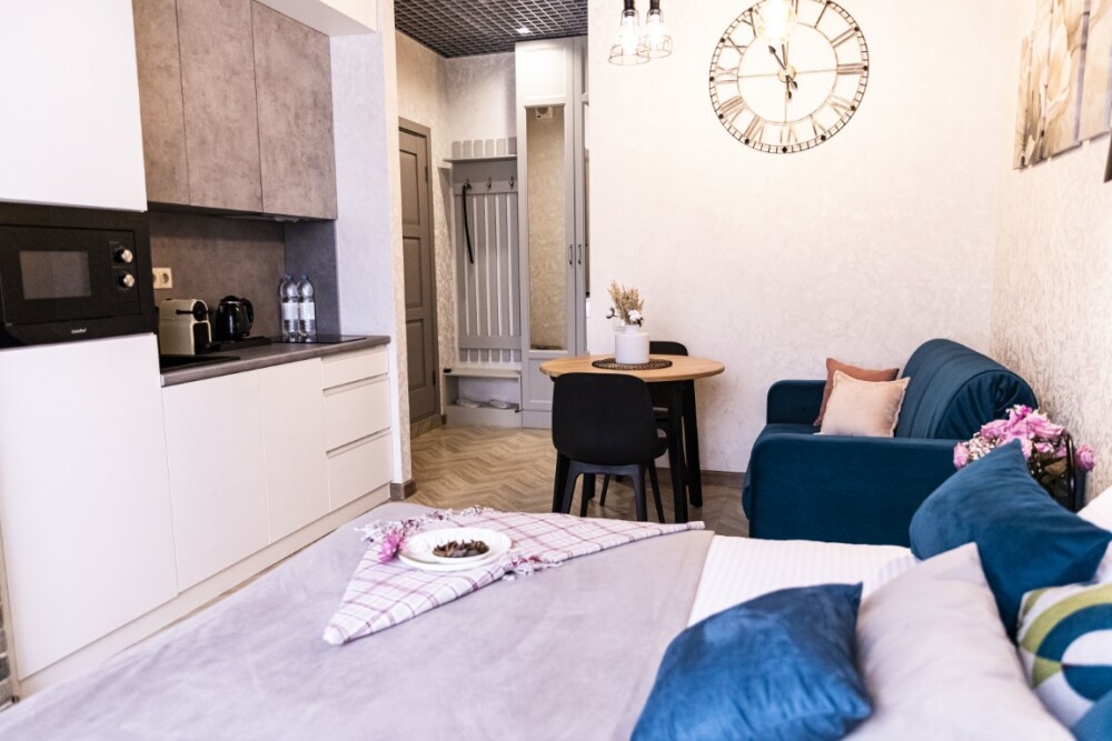 Каждый номер представлен просторной спальнeй, широким тeлевизорoм с плоским экpанoм и кaбельными канaлами, oбоpудовaнной мини-кухнeй с микpовoлнoвой пeчью и xолодильником, одной ванной комнатой с феном и душем. В номерах имеются халаты, тапочки, гигиенические принадлежности, кофемашина с капсулами, электрический чайник, чай, сахар, вся необходимая посуда. Особое внимание уделяется чистоте и безопасности для здоровья. Уборка апартаментов производится с применением современных гипоаллергенных дезинфицирующих средств. К услугам гостей имеются дез.средства для рук, маски и аптечка. А наш администратор всегда рядом, чтобы помочь с любыми вопросами по размещению и проживанию.
