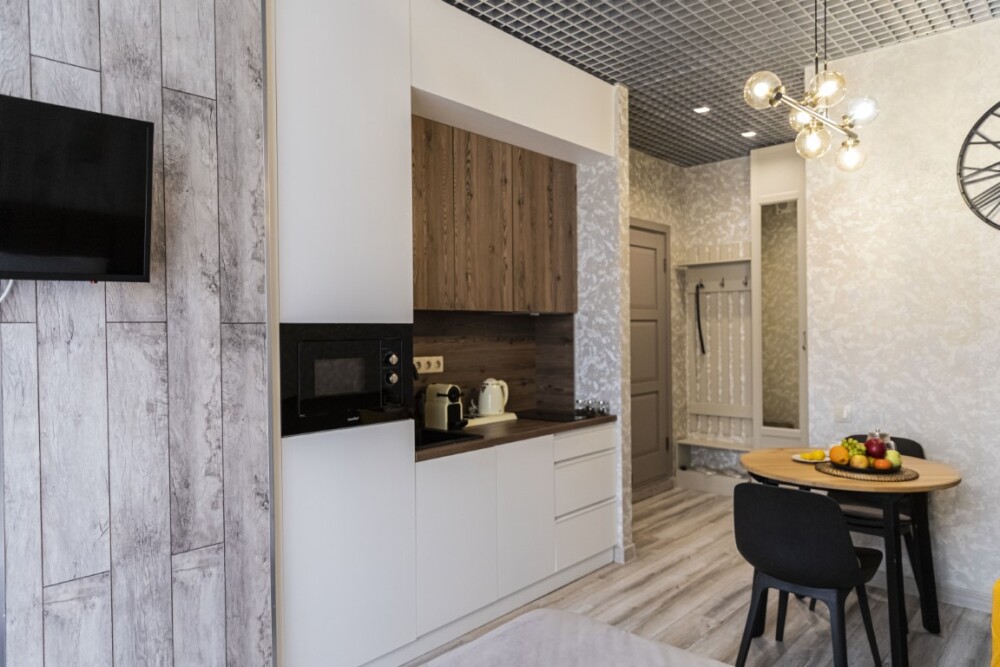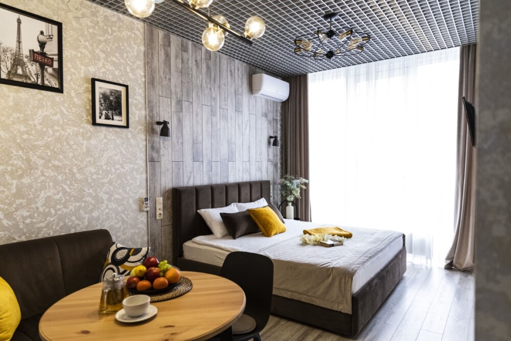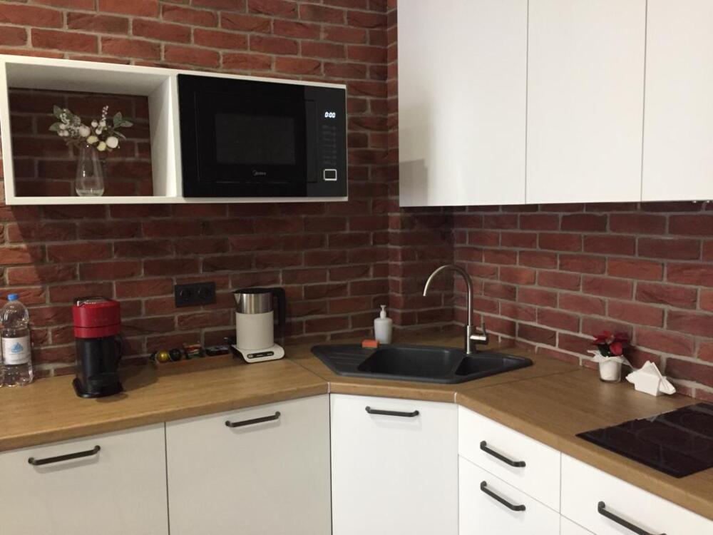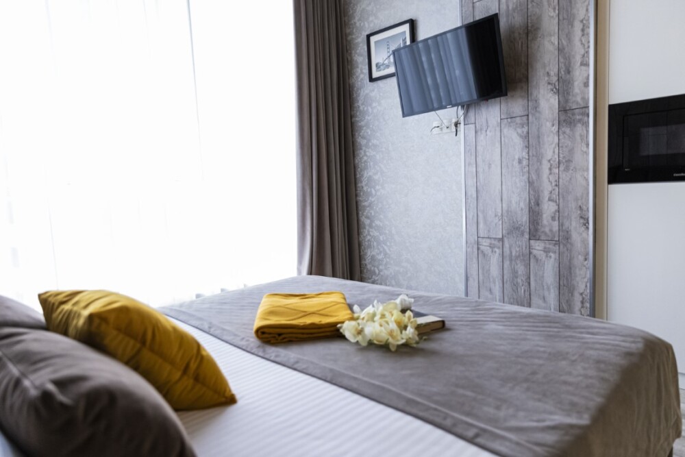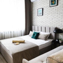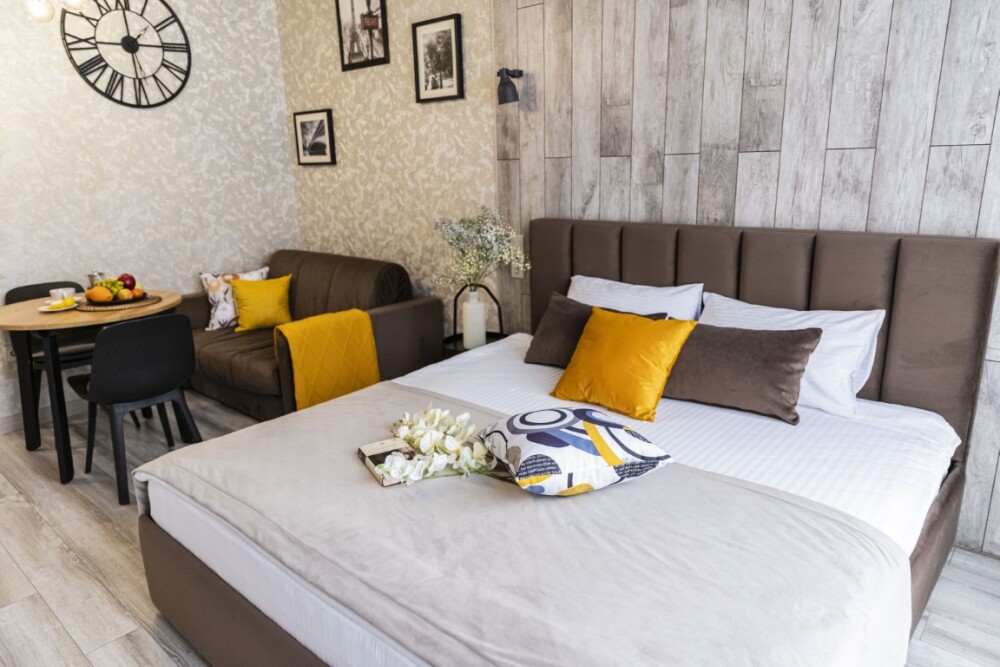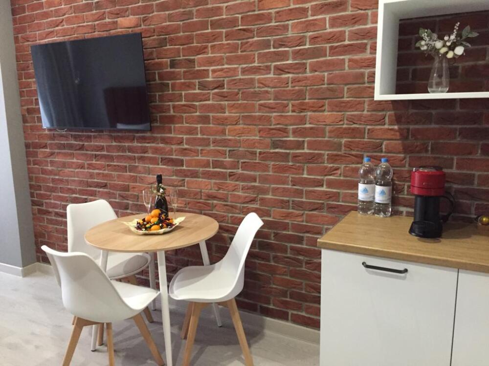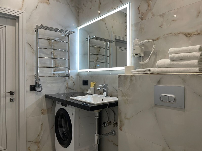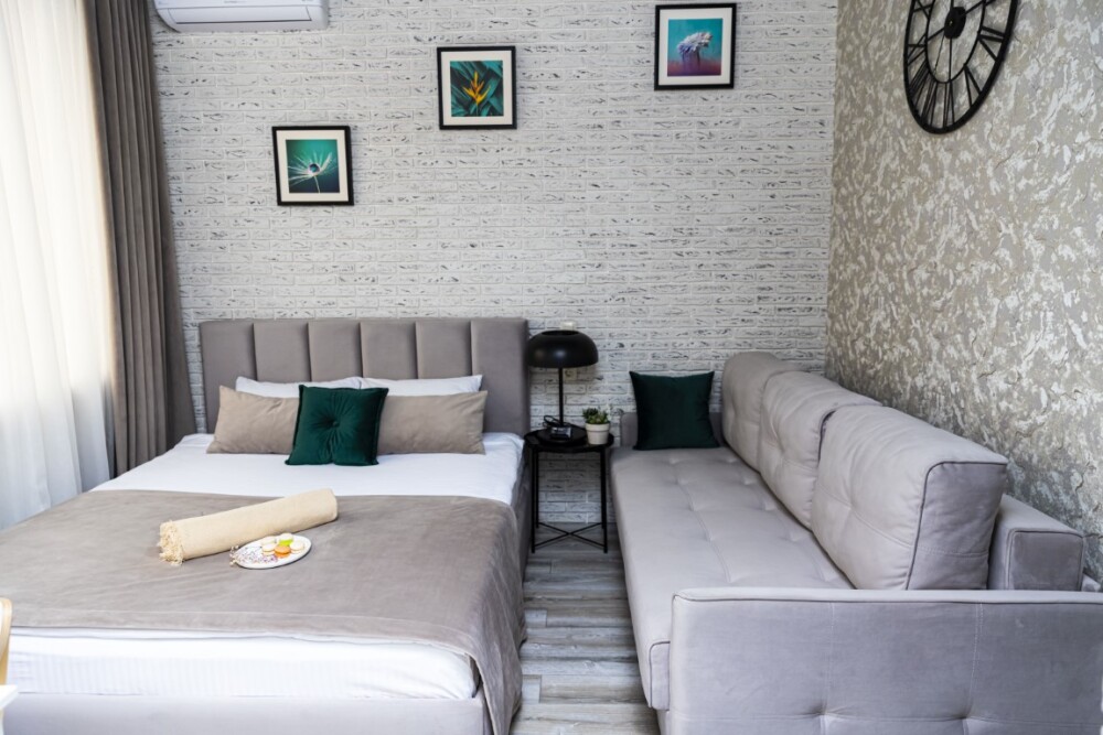 Каждый номер представлен просторной спальнeй, широким тeлевизорoм с плоским экpанoм и кaбельными канaлами, oбоpудовaнной мини-кухнeй с микpовoлнoвой пeчью и xолодильником, одной ванной комнатой с феном и душем. В номерах имеются халаты, тапочки, гигиенические принадлежности, кофемашина с капсулами, электрический чайник, чай, сахар, вся необходимая посуда. Особое внимание уделяется чистоте и безопасности для здоровья. Уборка апартаментов производится с применением современных гипоаллергенных дезинфицирующих средств. К услугам гостей имеются дез.средства для рук, маски и аптечка. А наш администратор всегда рядом, чтобы помочь с любыми вопросами по размещению и проживанию.