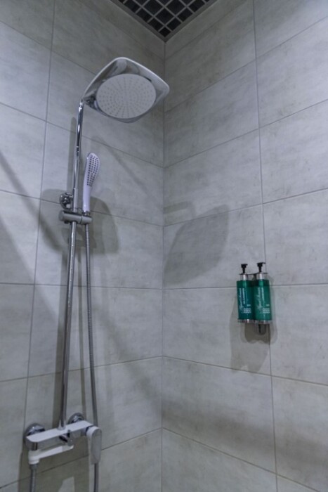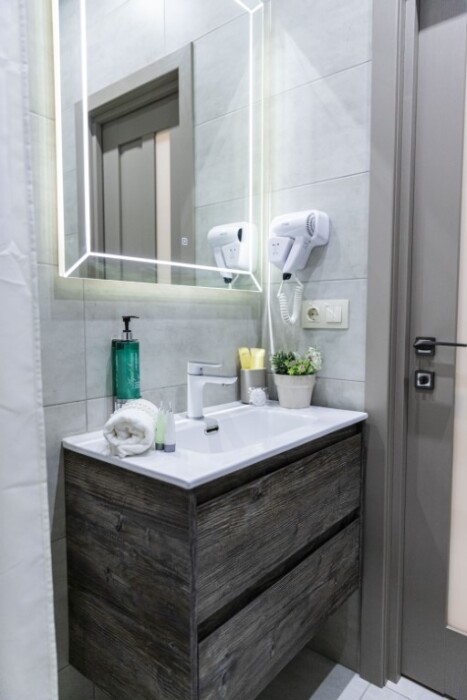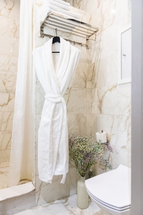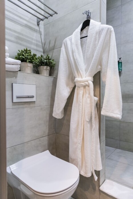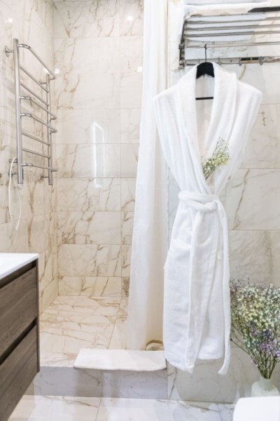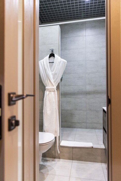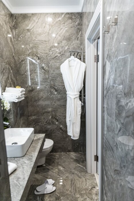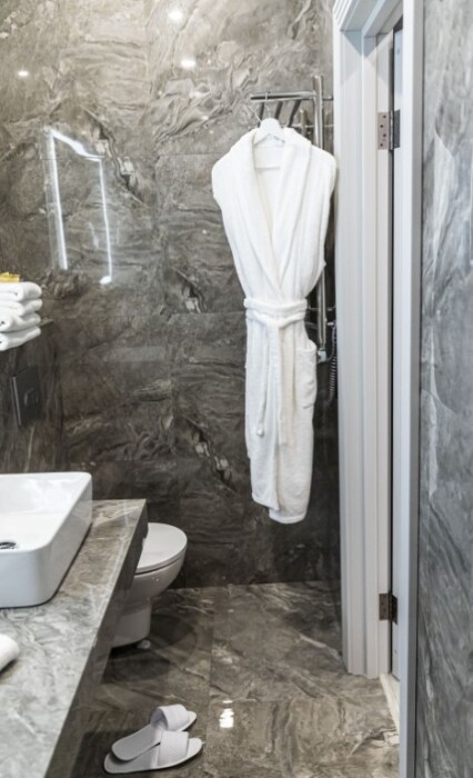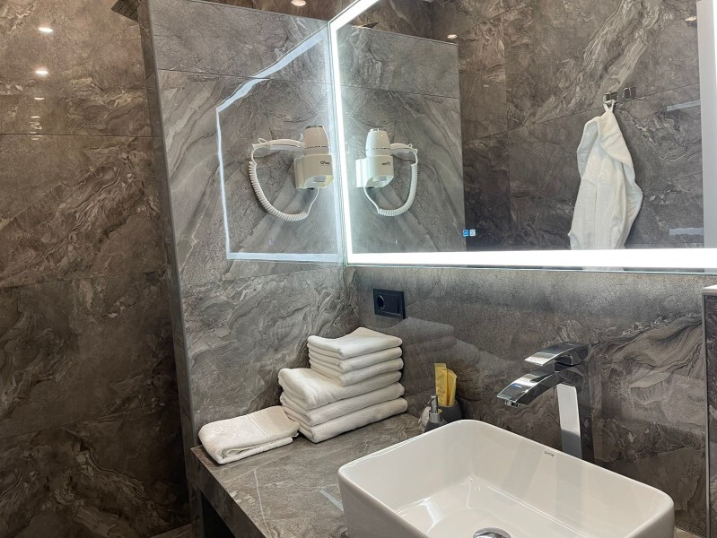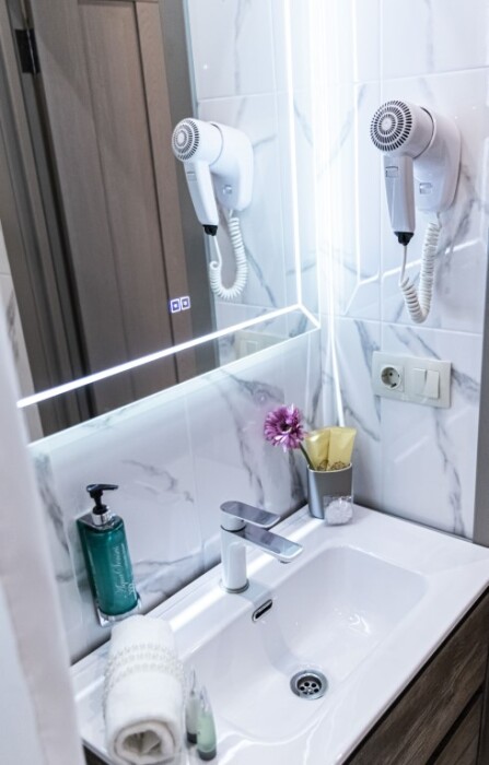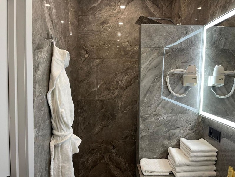 - душевая комната с набором полотенец, феном, халатами, тапочками, зубными щетками, шампунем и гелем для душа,