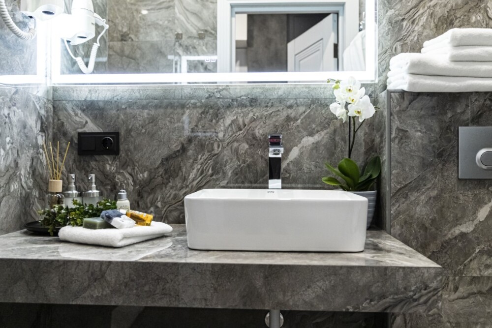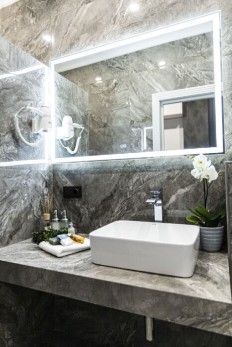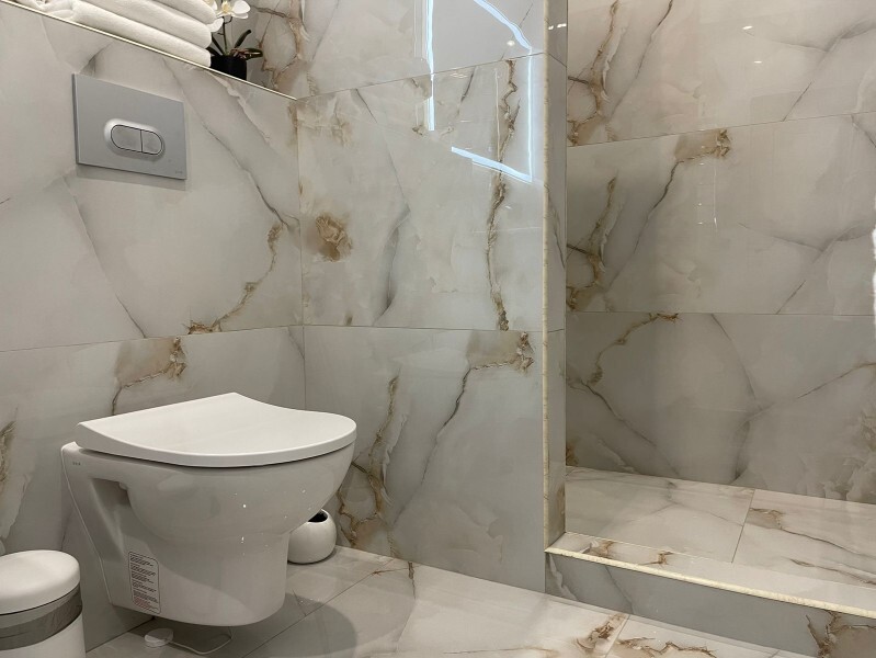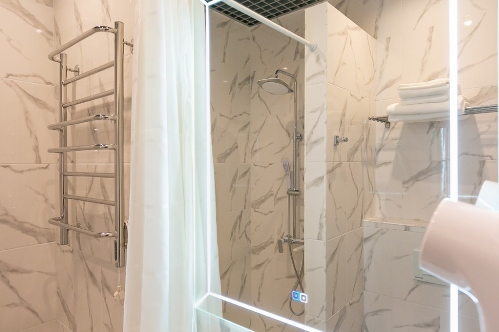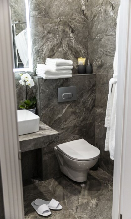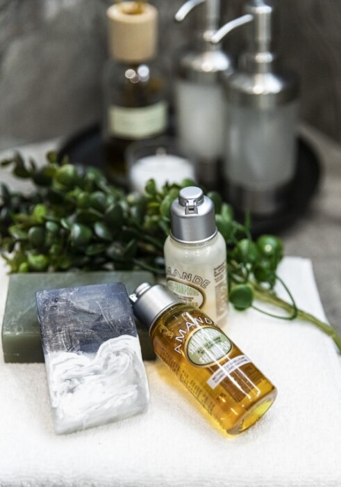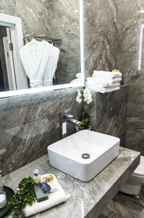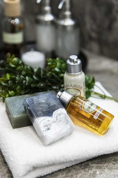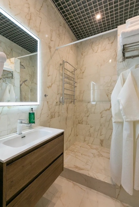 - душевая комната с набором полотенец, феном, халатами, тапочками, зубными щетками, шампунем и гелем для душа,