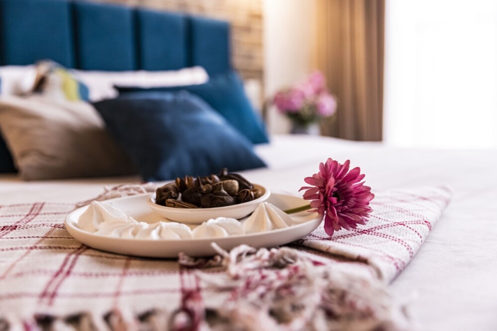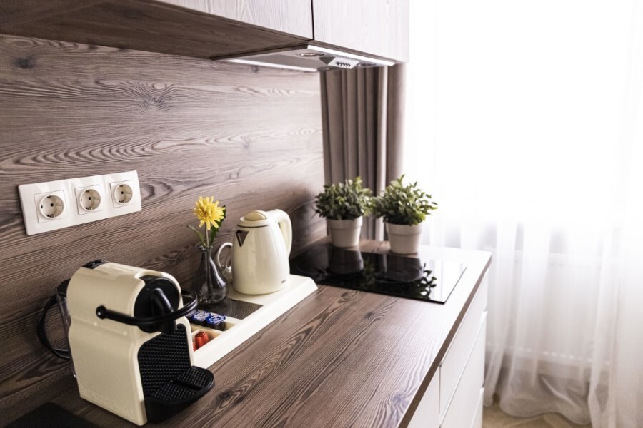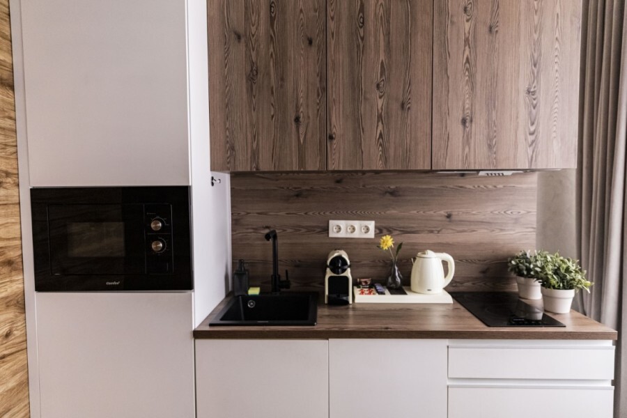 - миникухня с полным набором посуды для приготовления и принятия пищи, а также капсульная кофемашина с набором капсул, бутилированная питьевая вода для приготовления ароматного кофе и чая, порционные сливки, сахар, специи,
