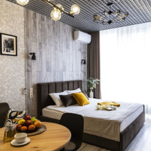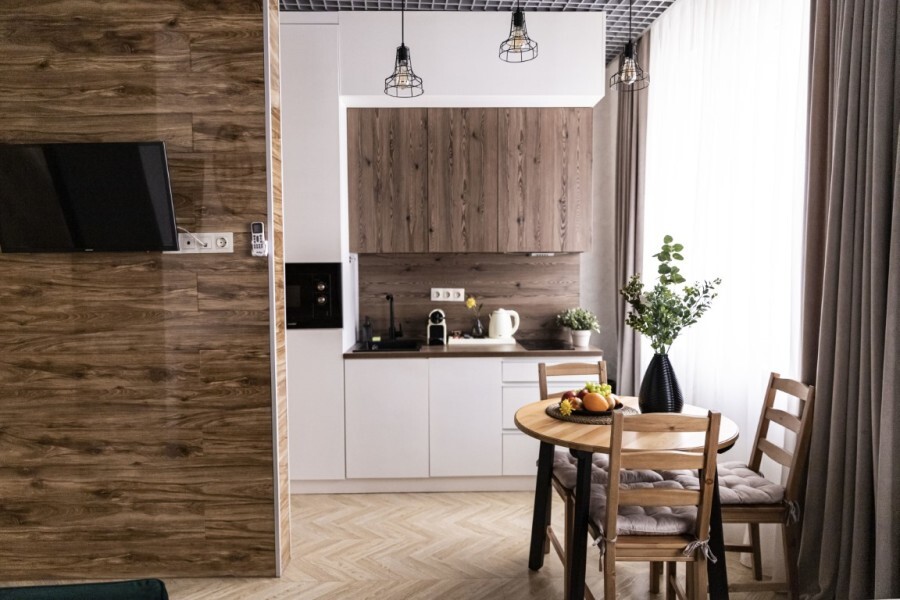 В апартаменте отдельная спальня и кухня-гостиная: