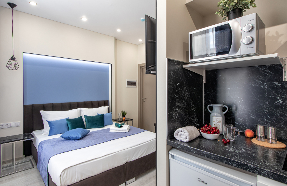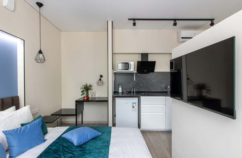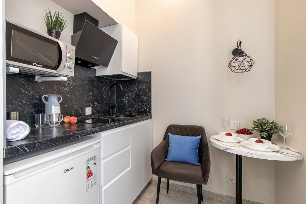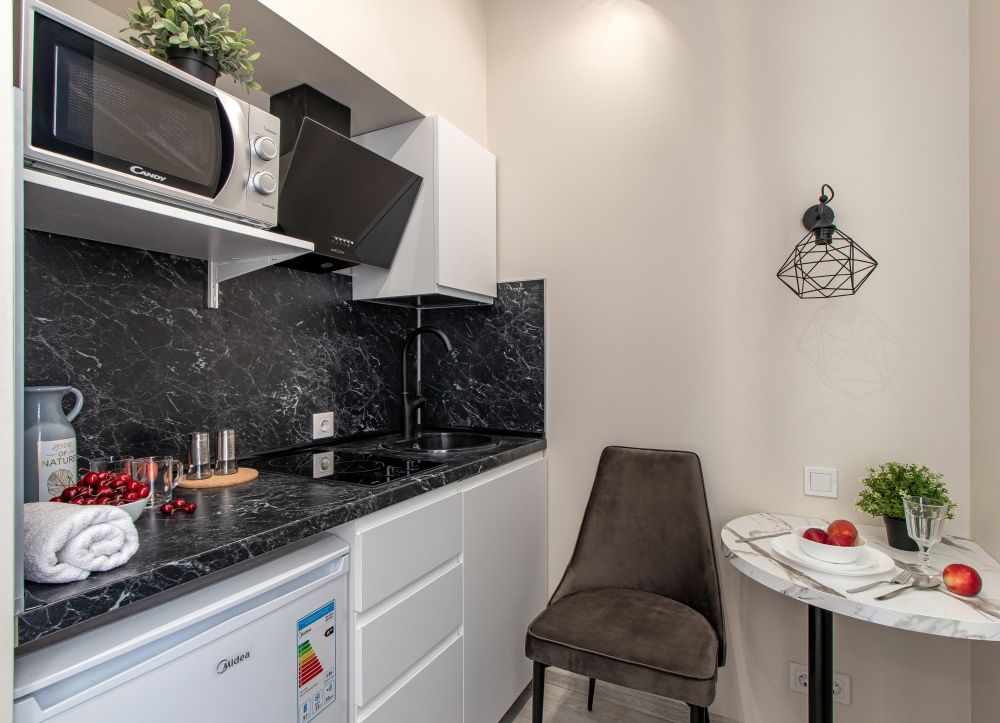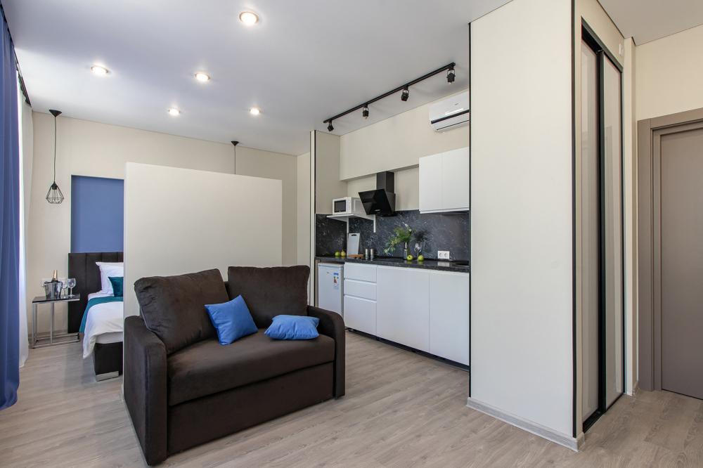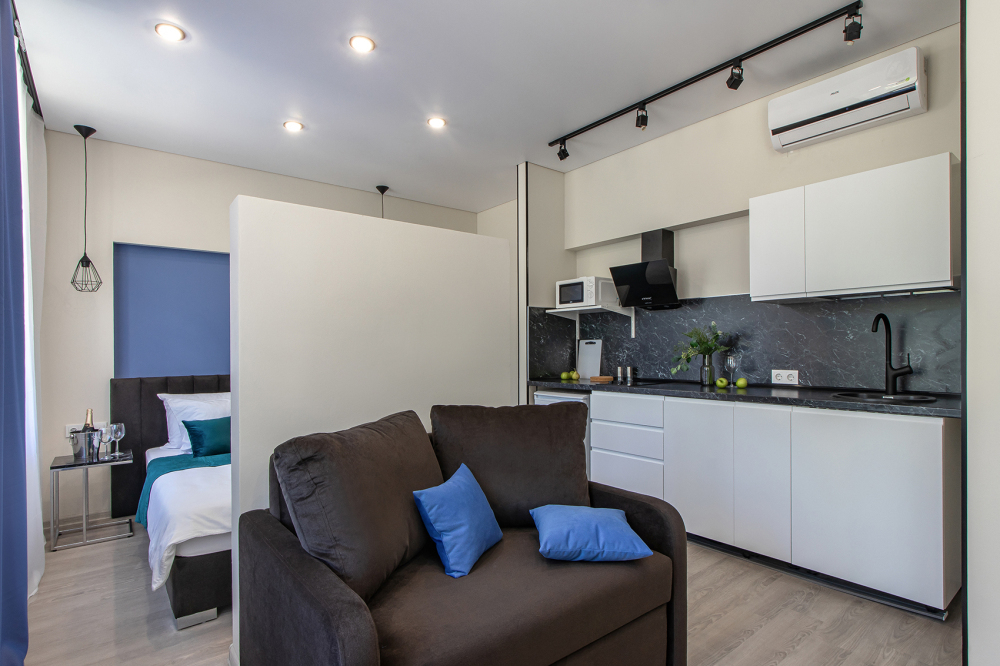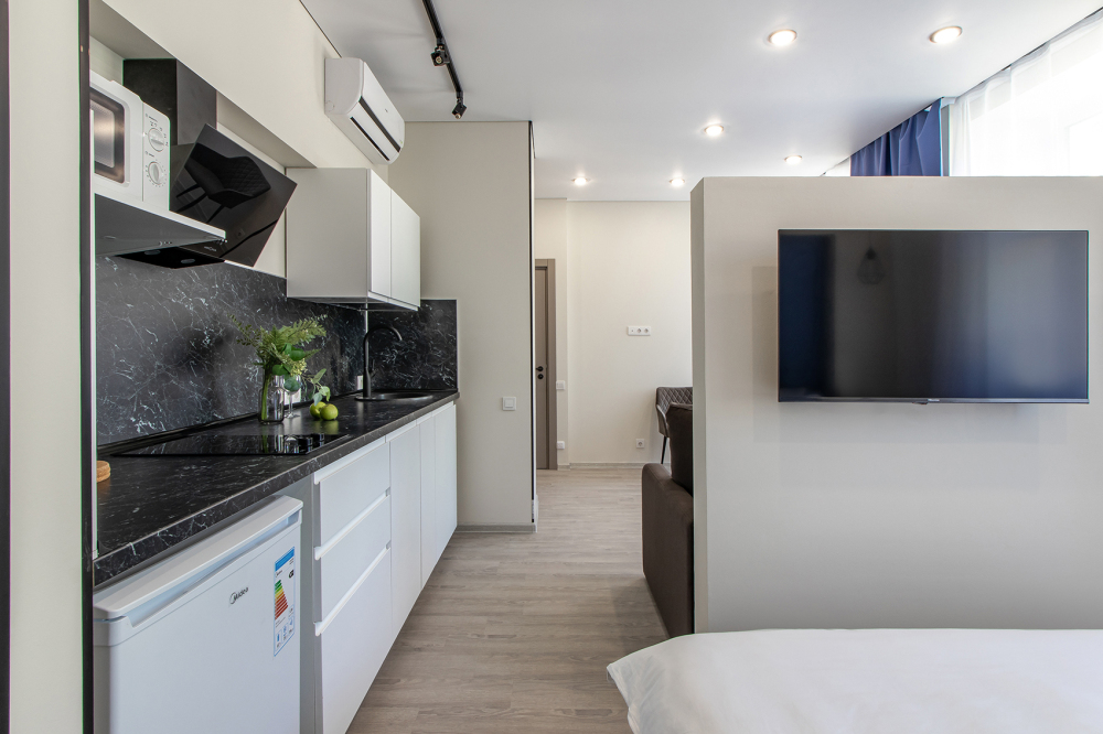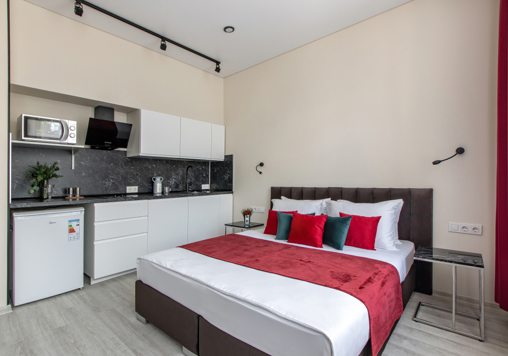 Во всех апартаментах есть полностью оборудованная кухня с микроволновой печью, холодильником, электроплитой и чайником, гостиная зона, телевизор с плоским экраном, стиральная машина и собственная ванная комната с душем и тапочками. К услугам гостей представлены номера с современным дизайнерским ремонтом, мебелью, кондиционером и бесплатным Wi-Fi.