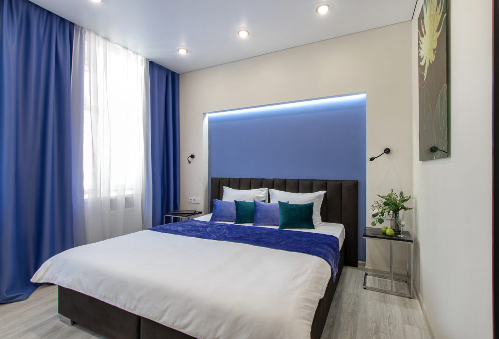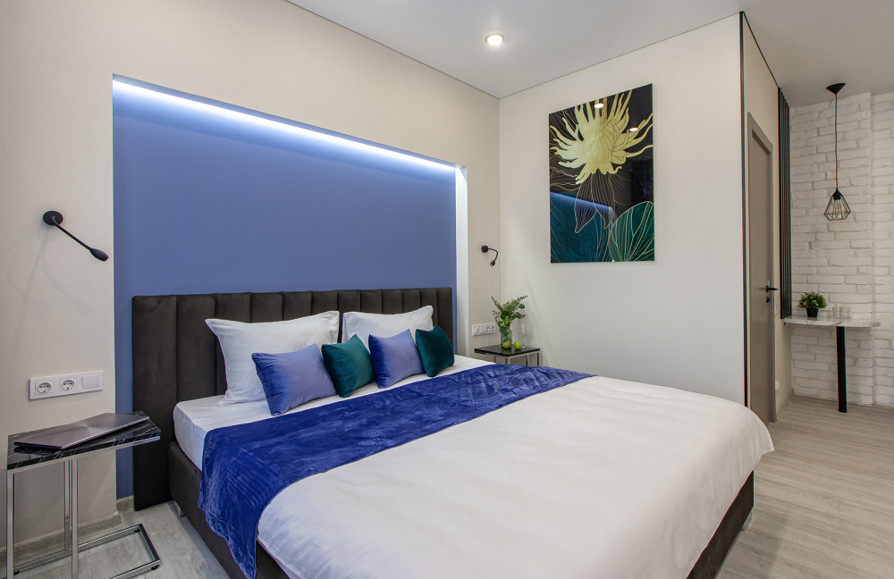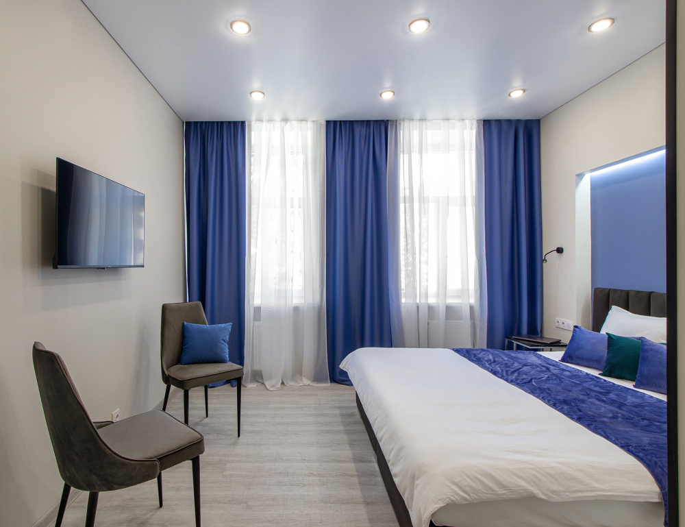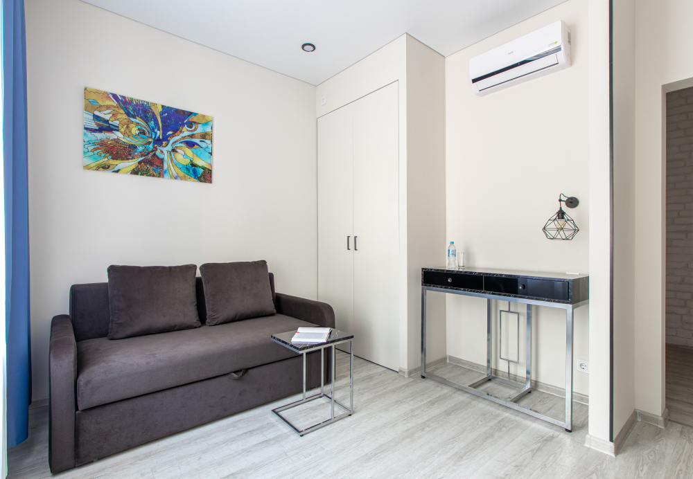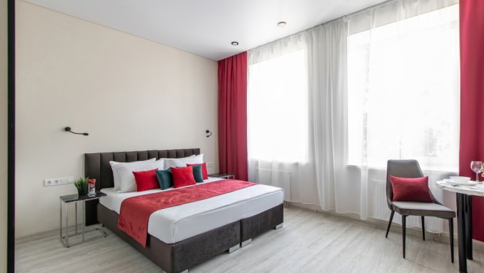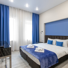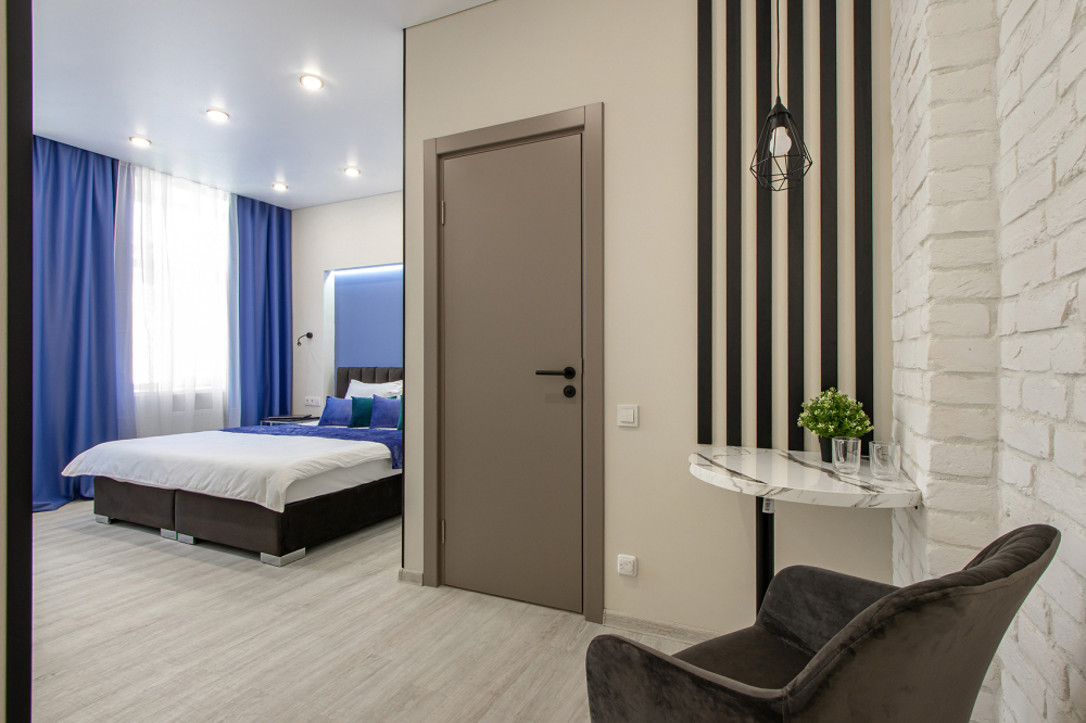 Апартаменты на четверых – это комфортный номер с дизайнерским интерьером. В этом двухкомнатном номере имеется оборудованная кухня с мини-холодильником, микроволновой печью, комплектом посуды, электрической плитой. В номере есть также ЖК-телевизор, бесплатный доступ к Wi-Fi, совмещенный санузел с душевой кабиной. Меблирован двуспальной кроватью-трансформером (можно сделать две отдельные кровати) и раскладным диваном-кроватью.