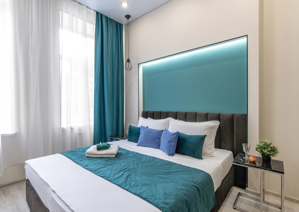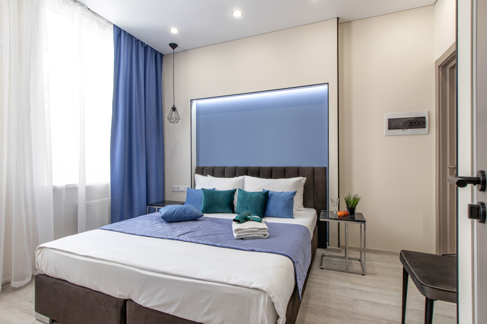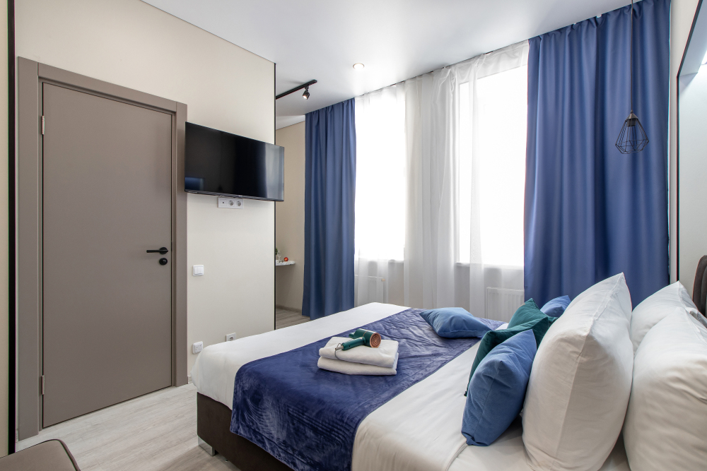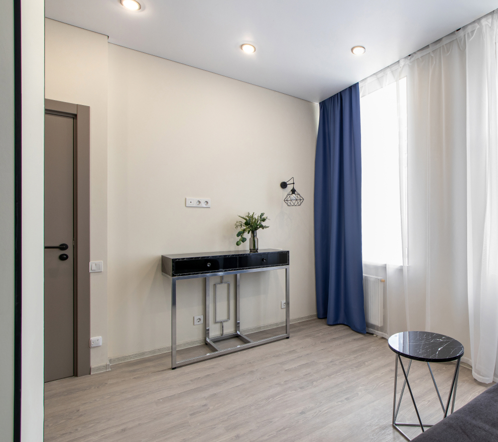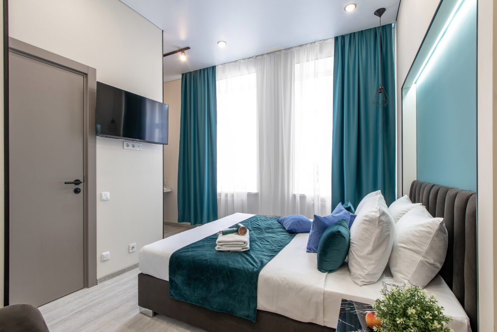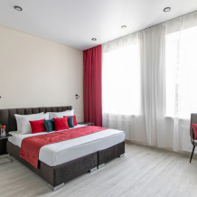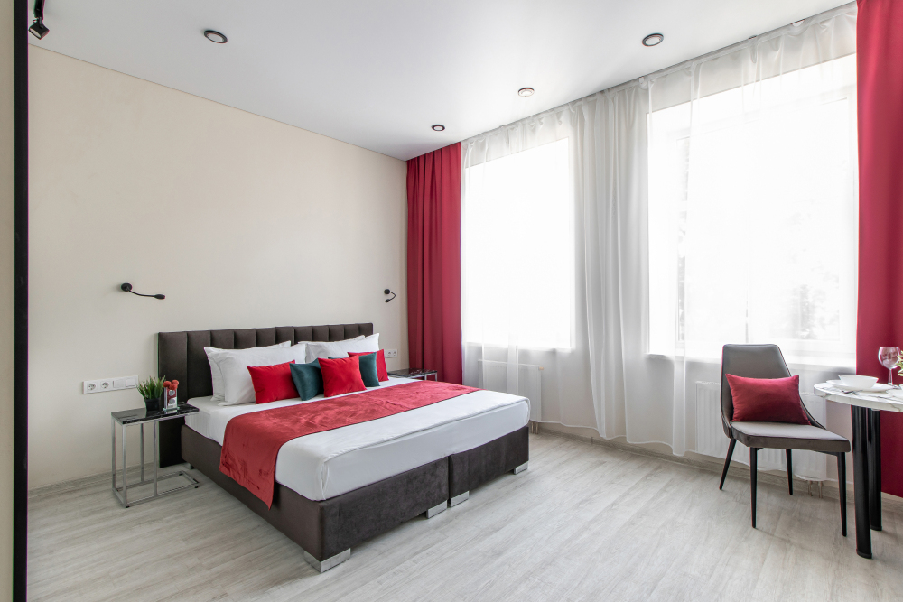 Апартаменты на четверых – это комфортный номер с дизайнерским интерьером. В этом двухкомнатном номере имеется оборудованная кухня с мини-холодильником, микроволновой печью, комплектом посуды, электрической плитой. В номере есть также ЖК-телевизор, бесплатный доступ к Wi-Fi, совмещенный санузел с душевой кабиной. Меблирован двуспальной кроватью-трансформером (можно сделать две отдельные кровати) и раскладным диваном-кроватью.