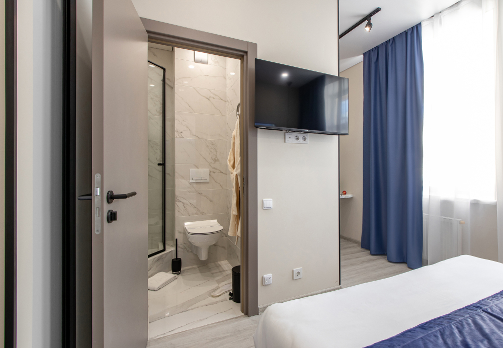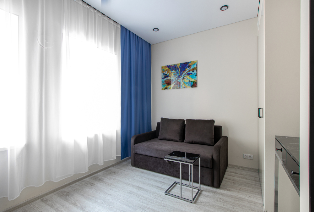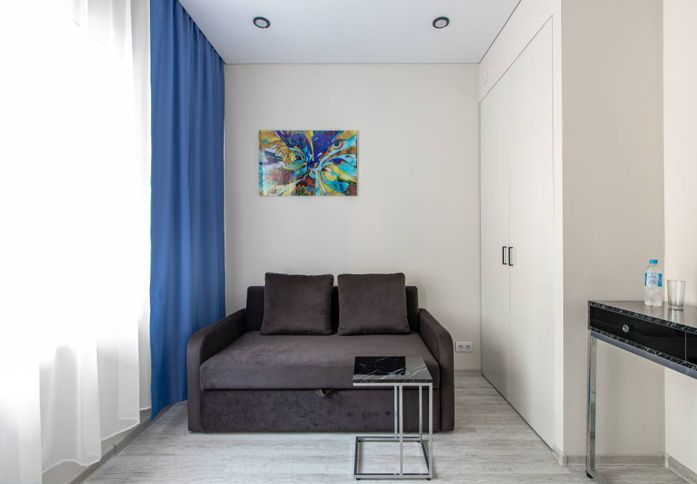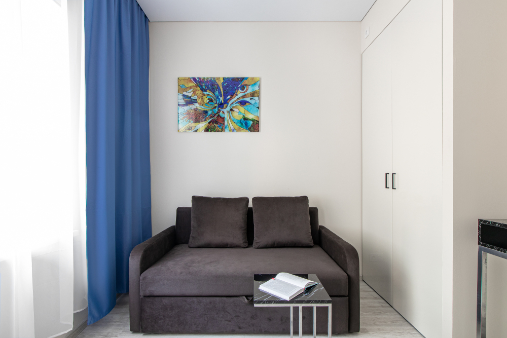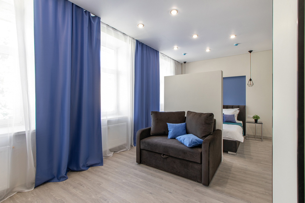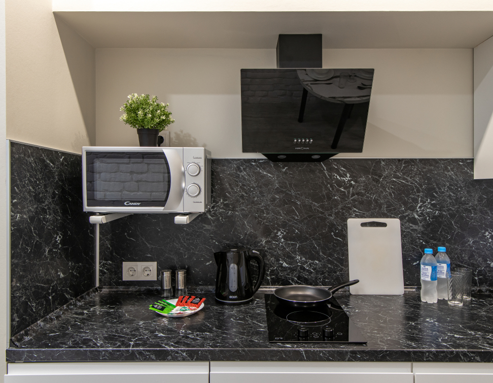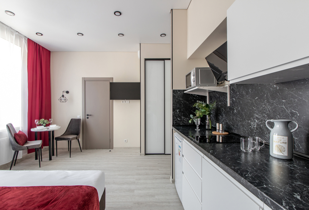 Апартаменты на двоих – это комфортный номер с дизайнерским интерьером. В номере имеется оборудованная кухня с мини-холодильником, микроволновой печью, комплектом посуды, электрической плитой. В номере есть также ЖК-телевизор, бесплатный доступ к Wi-Fi, совмещенный санузел с душевой кабиной. Меблирован двуспальной кроватью-трансформером (можно сделать две отдельные кровати).