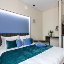 Апартаменты на троих – это комфортный номер с дизайнерским интерьером. В номере имеется оборудованная кухня с мини-холодильником, микроволновой печью, комплектом посуды, электрической плитой. В номере есть также ЖК-телевизор, бесплатный доступ к Wi-Fi, совмещенный санузел с душевой кабиной. Меблирован двуспальной кроватью-трансформером (можно сделать две отдельные кровати) и раскладным диваном-кроватью.