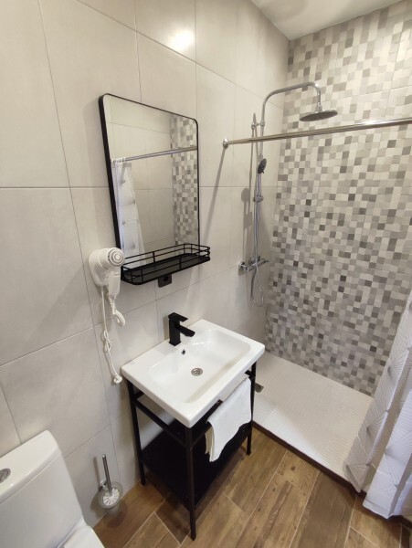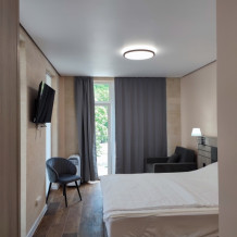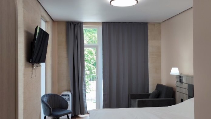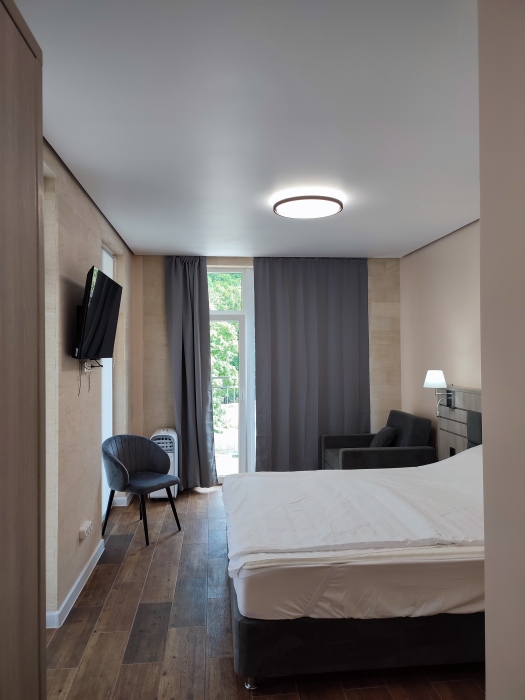 Просторный однокомнатный номер номер площадью 23 кв.м. с большой двуспальной кроватью отлично подойдет паре или одинокому путешественнику. Увеличенный угловой балкон отлично подходит для отдыха на свежем воздухе когда не хочется выходить на улицу и есть желание посидеть с бокалом вина или чашкой чая/кофе.