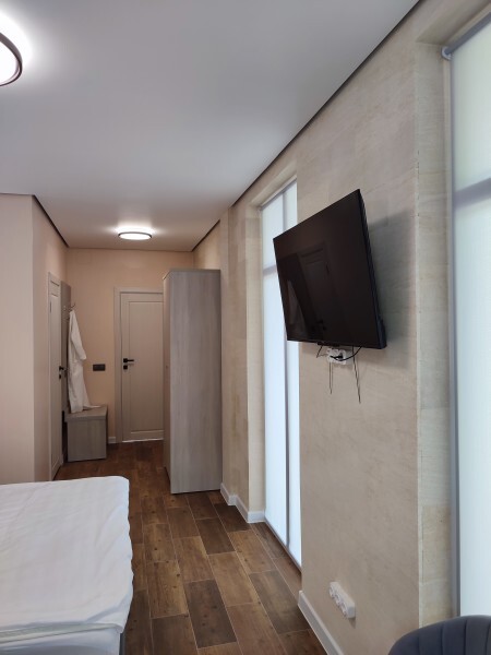 Оснащен современным оборудованием(фен, ТВ, Wi-Fi, сейф), необходимыми принадлежностями для комфортного отдыха (тапочки, полотенца, халат).