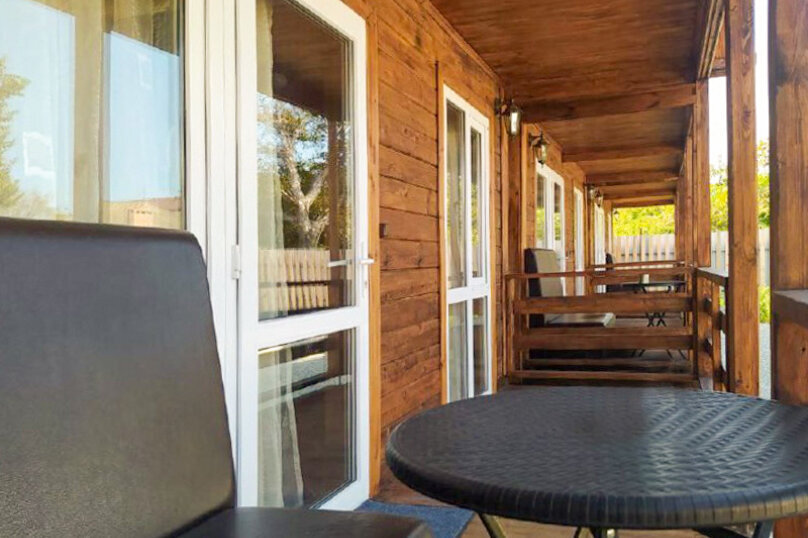 Номер в стиле «Эко», отделанный брусом. Окна выходят во внутренний дворик. В номере есть все необходимое, а также собственная душевая комната и выход на террасу.