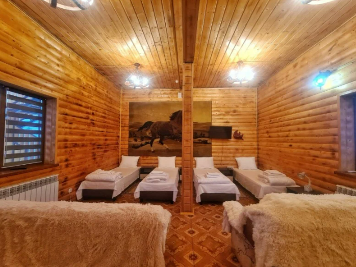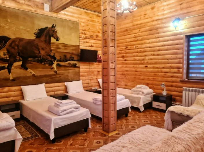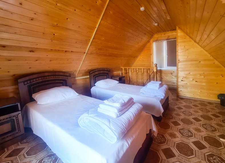 Просторные и уютные номера имеют стильный природный дизайн с деревянной отделкой, прекрасно подходят для отдыха. В номерах имеются раздельные кровати с ортопедическим матрацем, диваны, шкаф для вещей, столик, стулья, телевизор. Ванная комната оснащена туалетными принадлежностями.